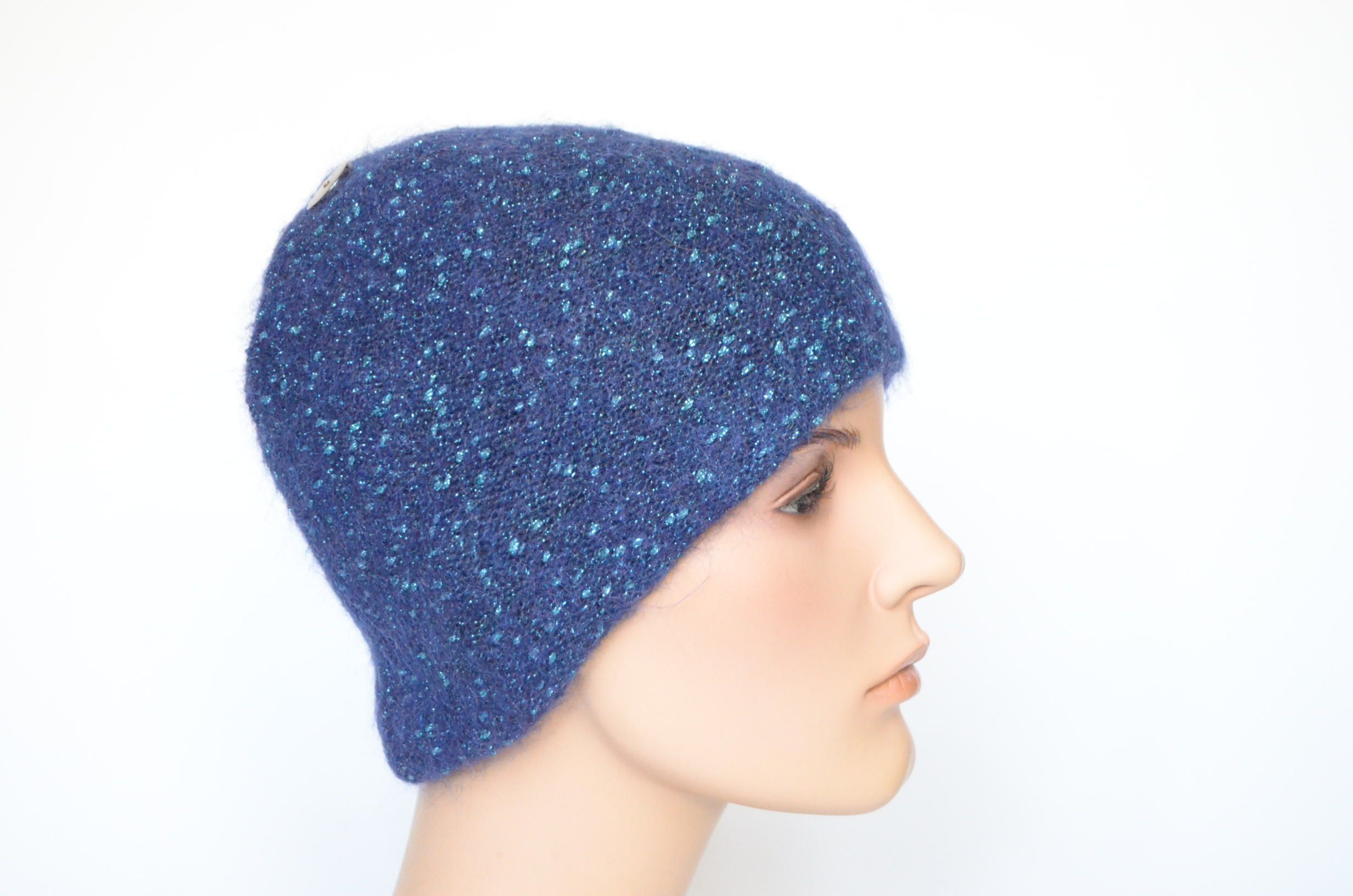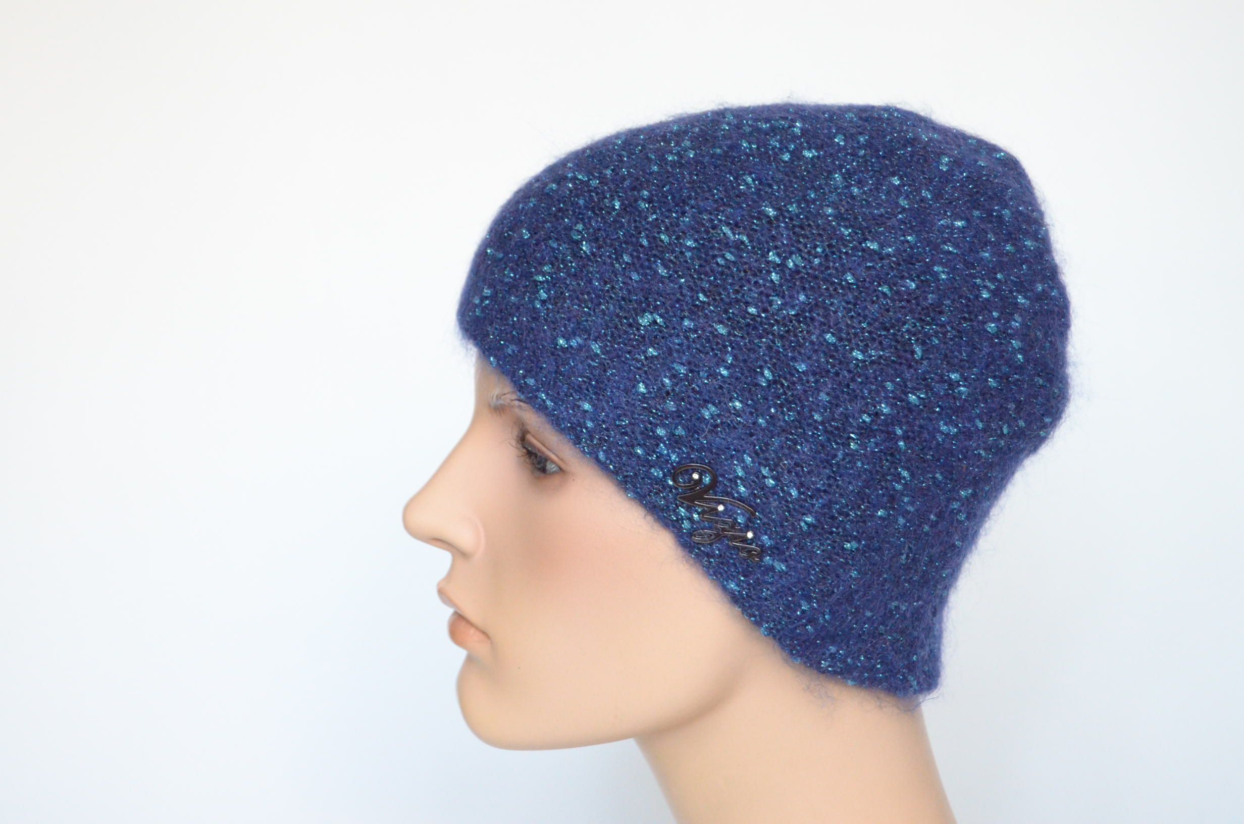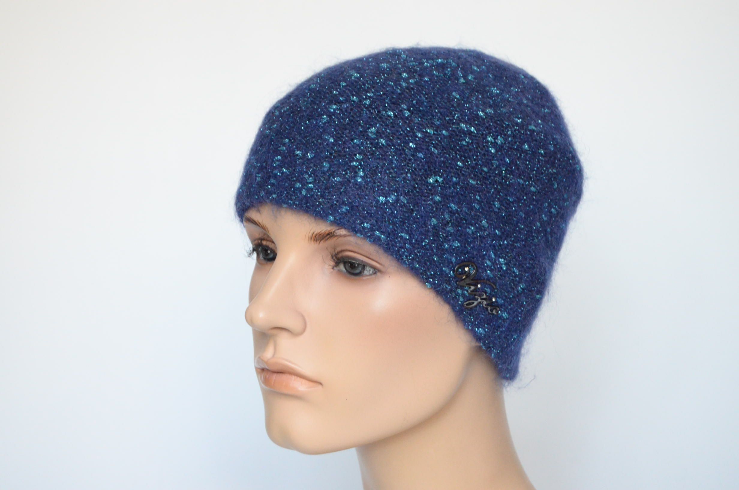 Синяя шапка по голове вязаная с люрексом зимняя для женщин