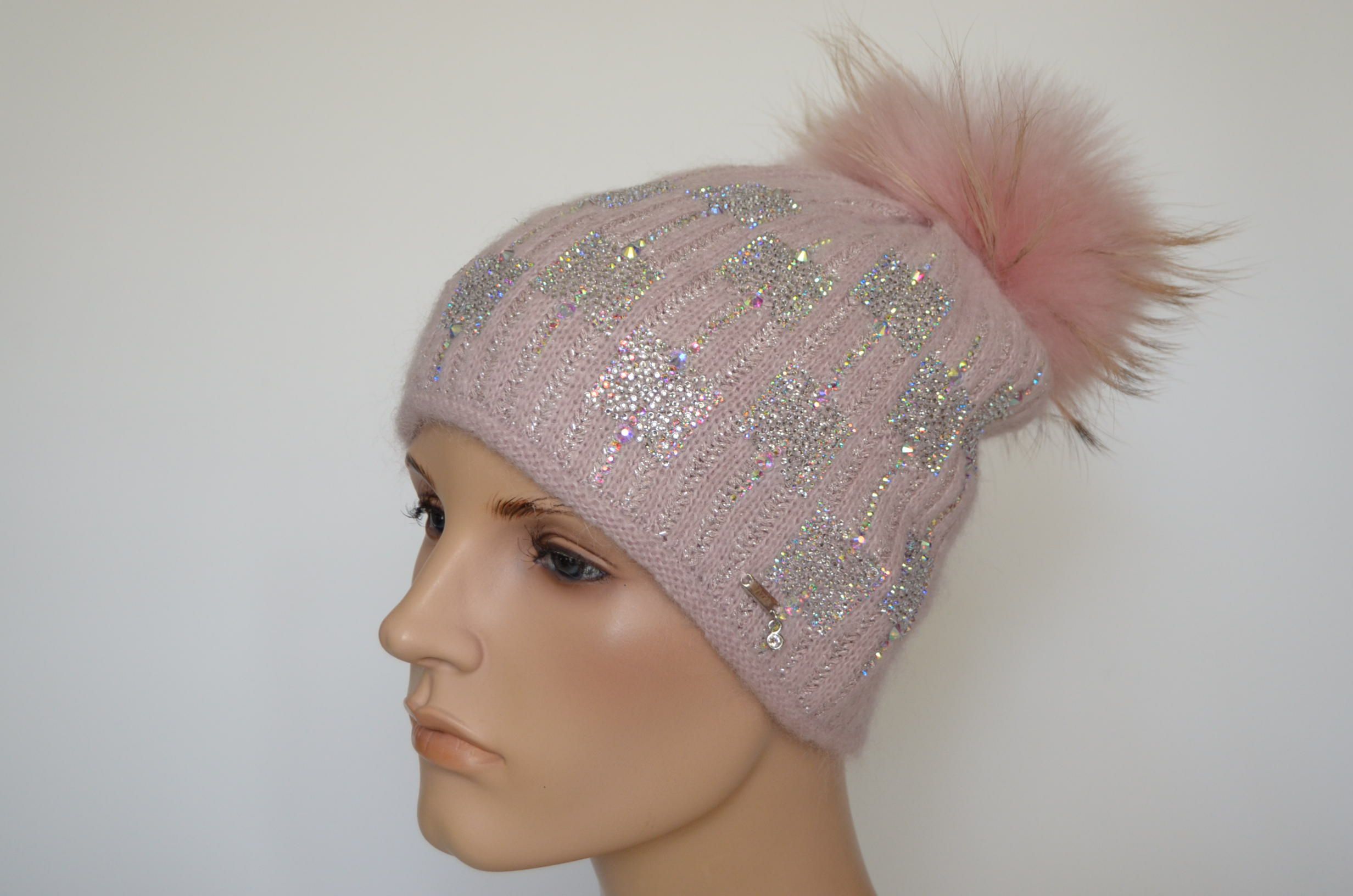 Шапка розовая с помпоном женская вязаная с отстегивающимися помпонами из натурального меха