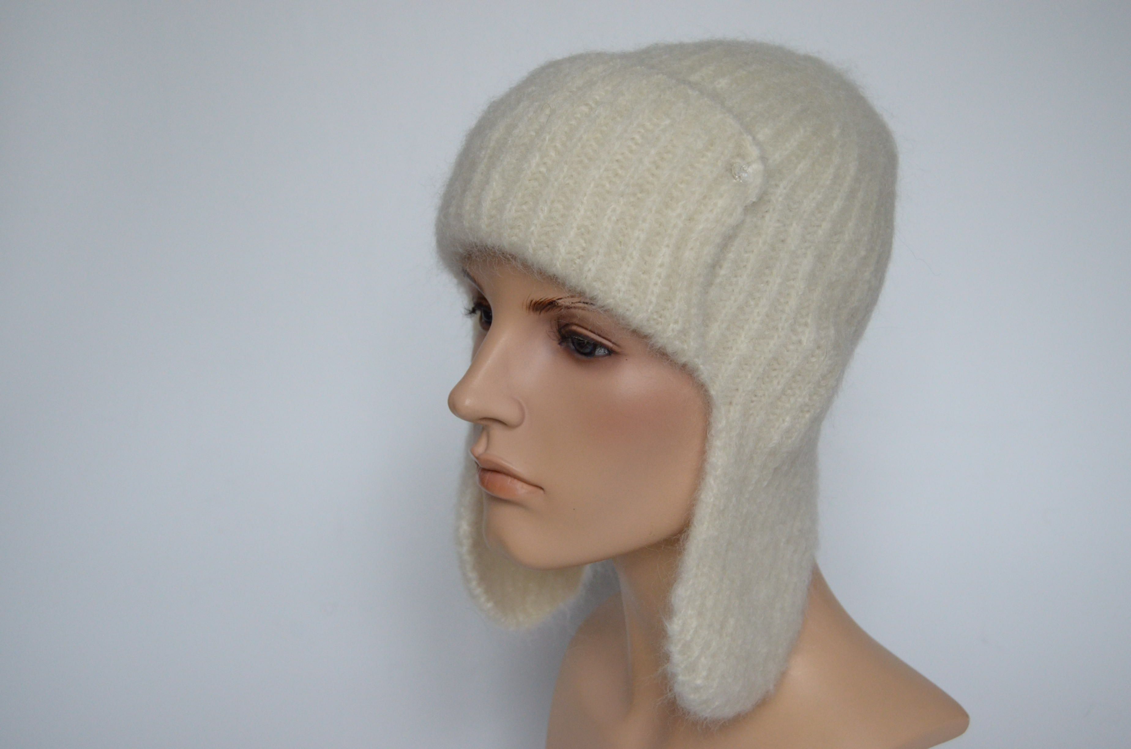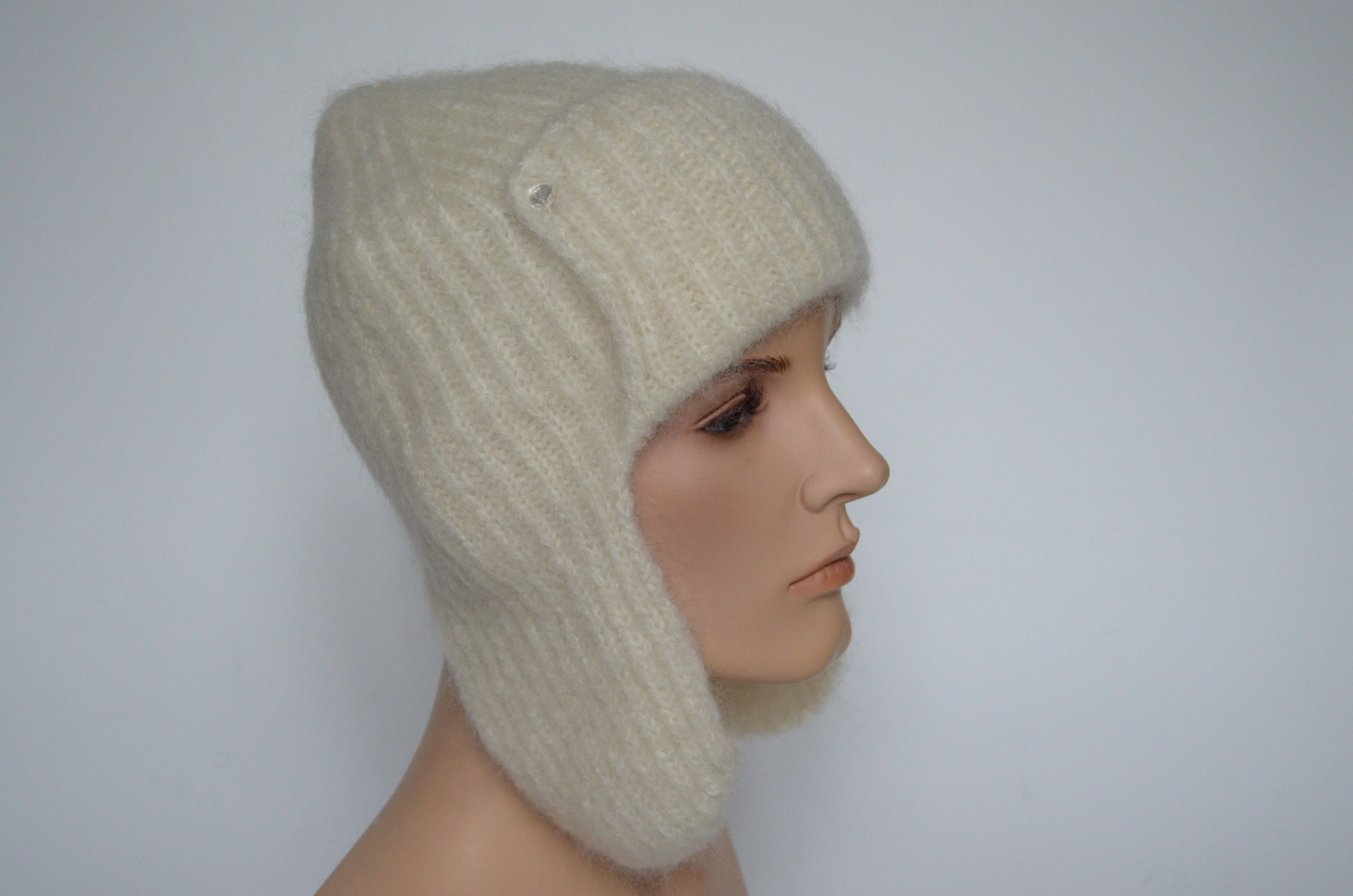 Шапка ушанка вязаная из мохера белого цвета одинарная зимняя