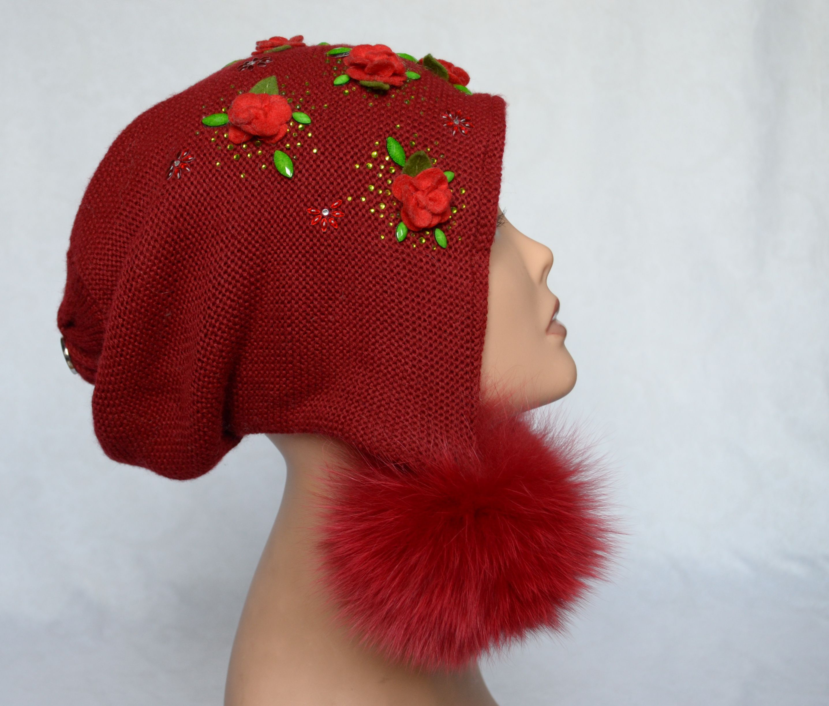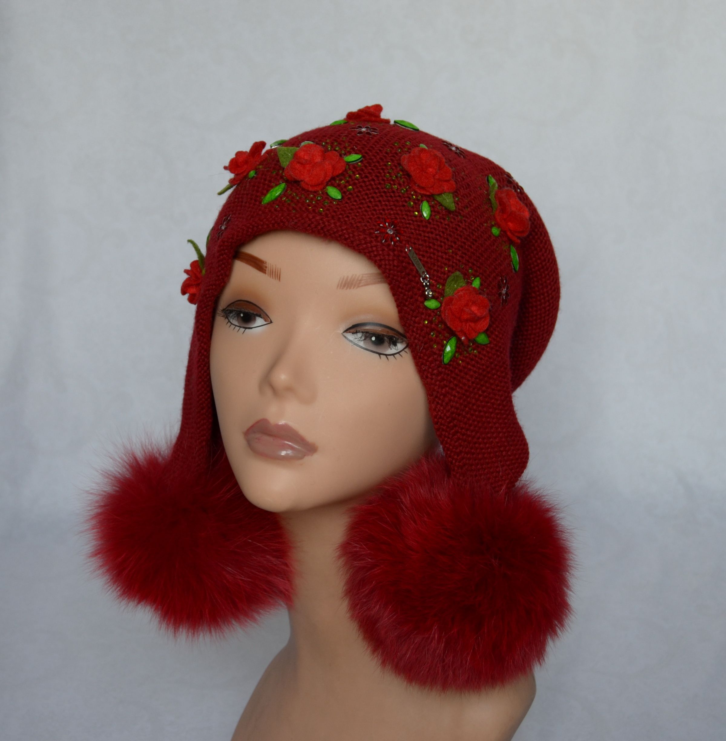 Красная шапка ушанка женская с помпонами и вязаными перчатками в комплекте