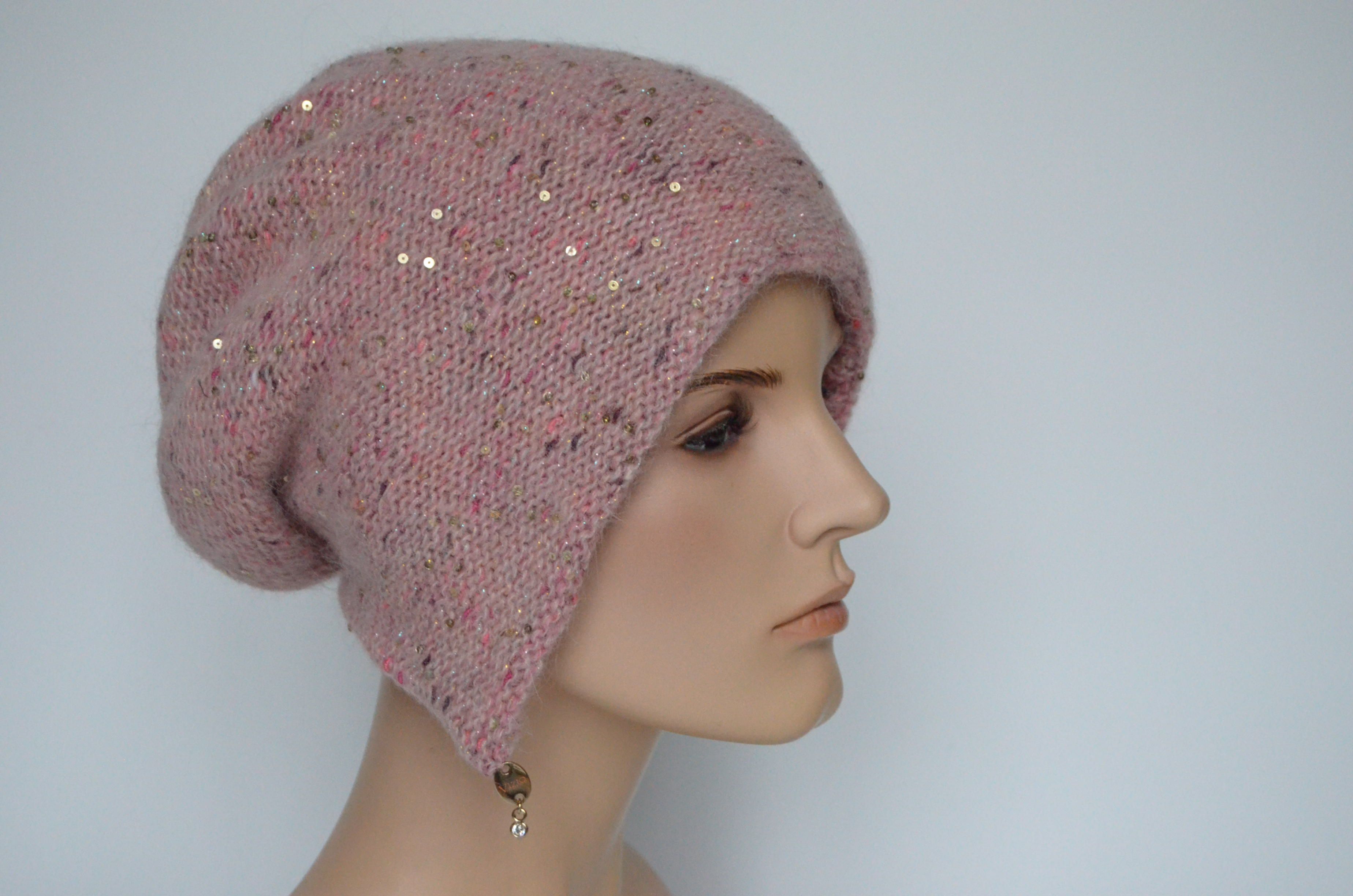 Вязаная персиковая шапка ушанка из меланжевой пряжи и пайетками женская зима 2022 - 2023 Vizio Италия 8022 коллекция вязаных шапок ушанок Италии для женщин