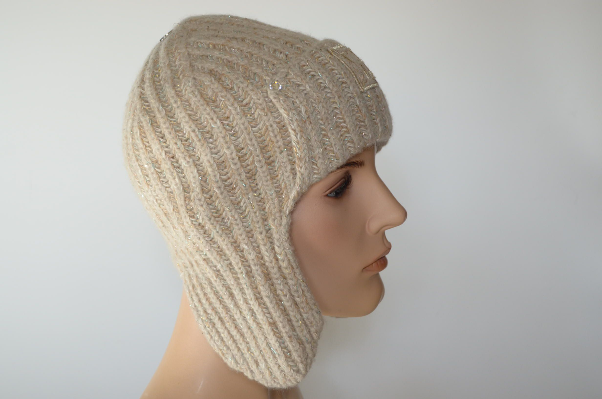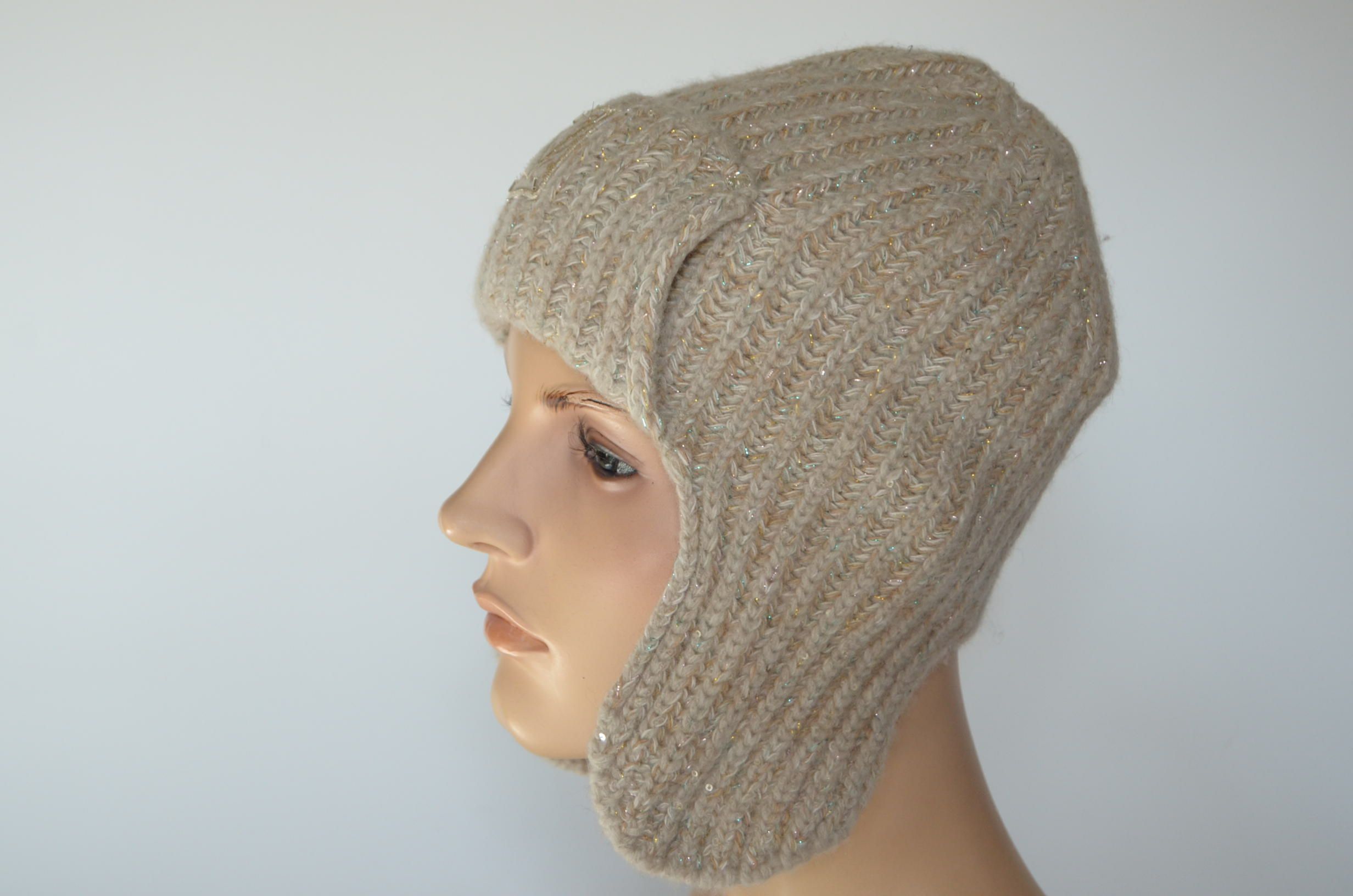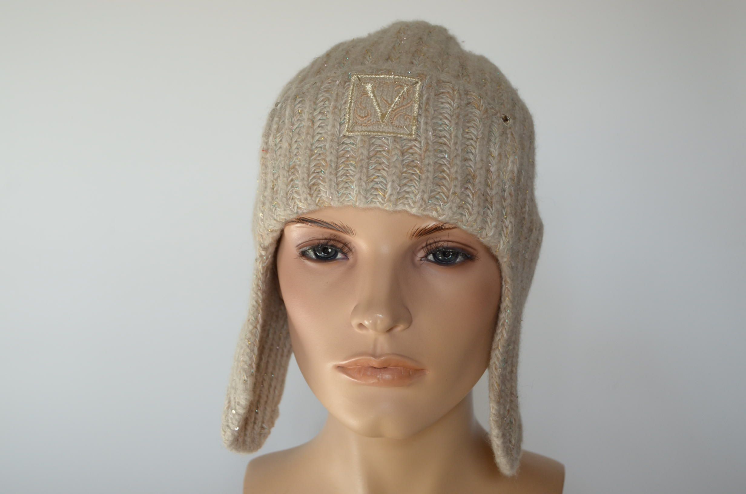 Вязаная бежевая кашемировая шапка ушанка Италия Визио 1106 UO коллекция головных уборов из кашемира Vizio зима 2023 - 2024