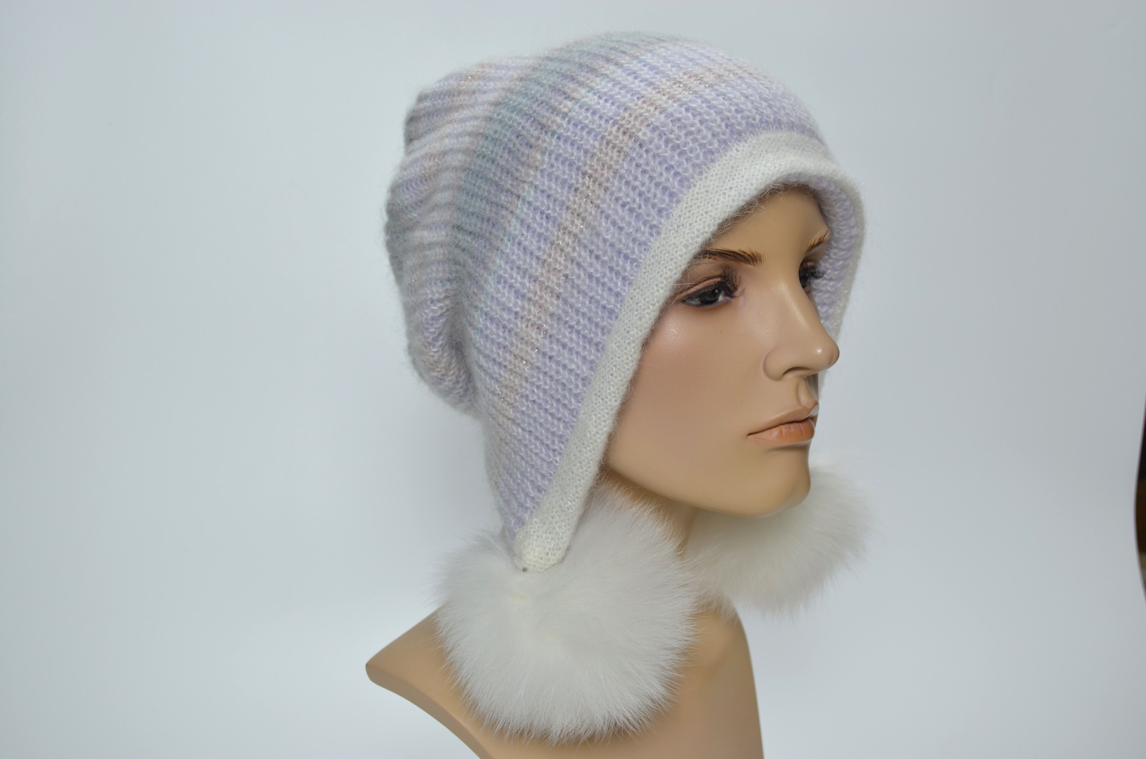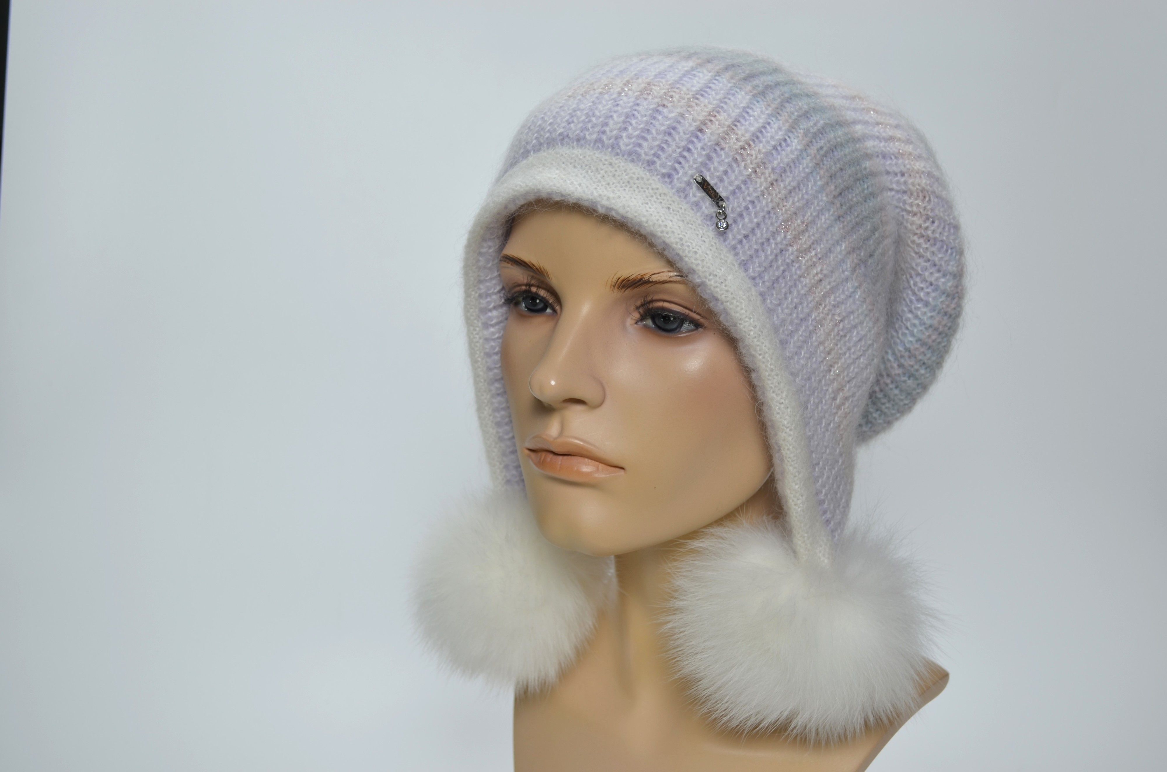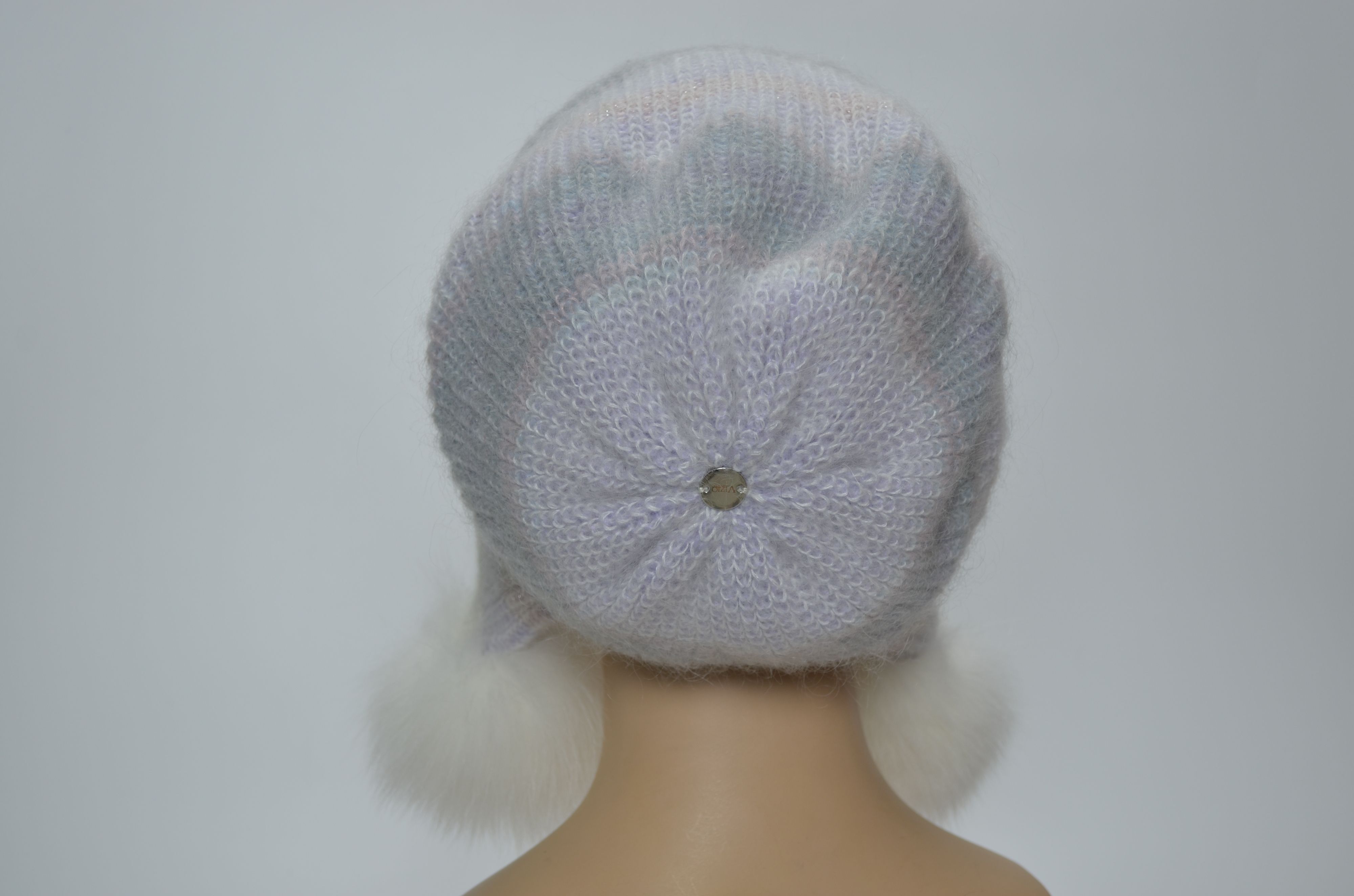 Вязаная белая разноцветная шапка ушанка из мохера и альпака со съемными меховыми помпонами Vizio Италия 1307 PP 66 из коллекции головных уборов осень зима 2024 2025