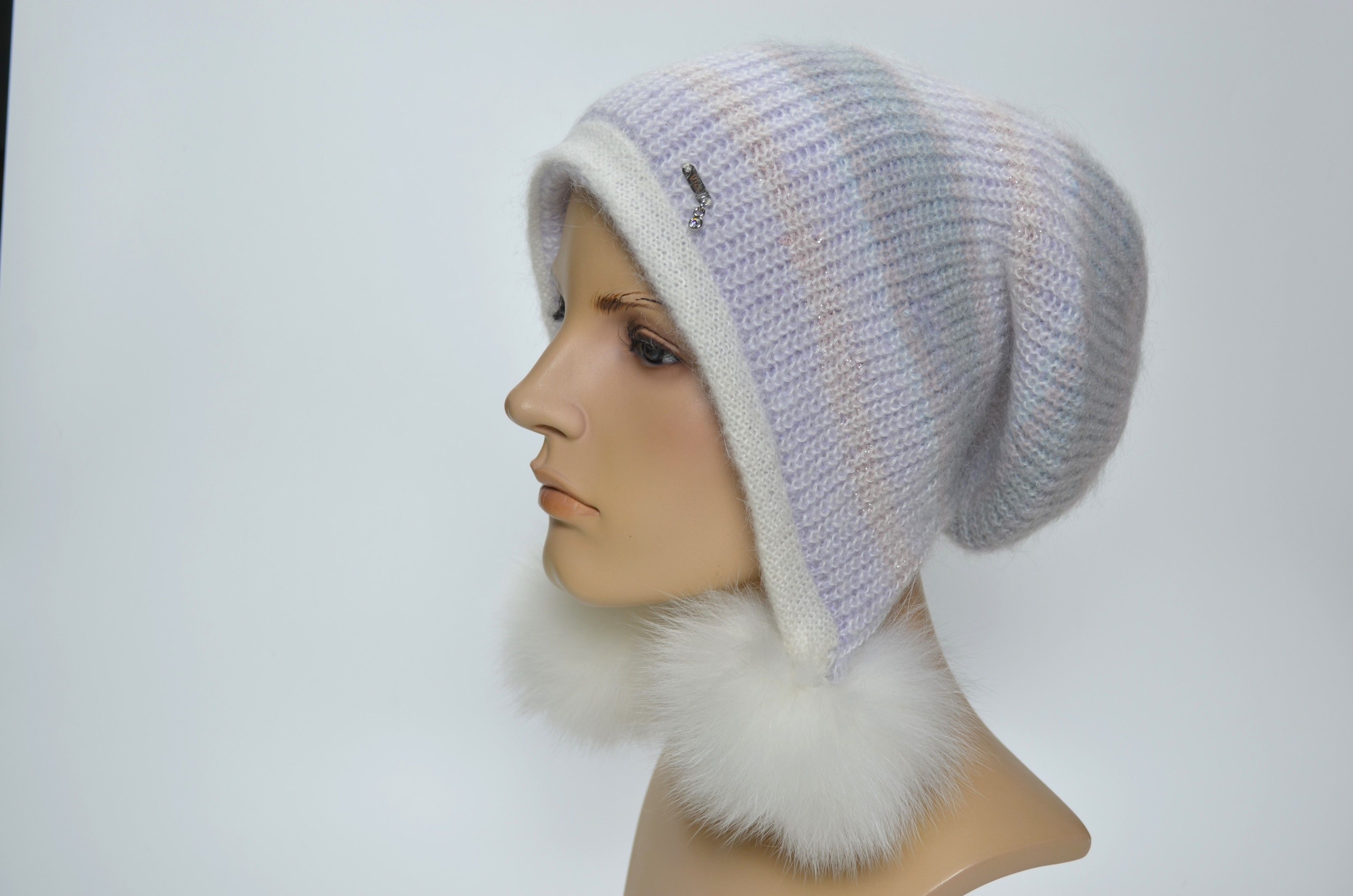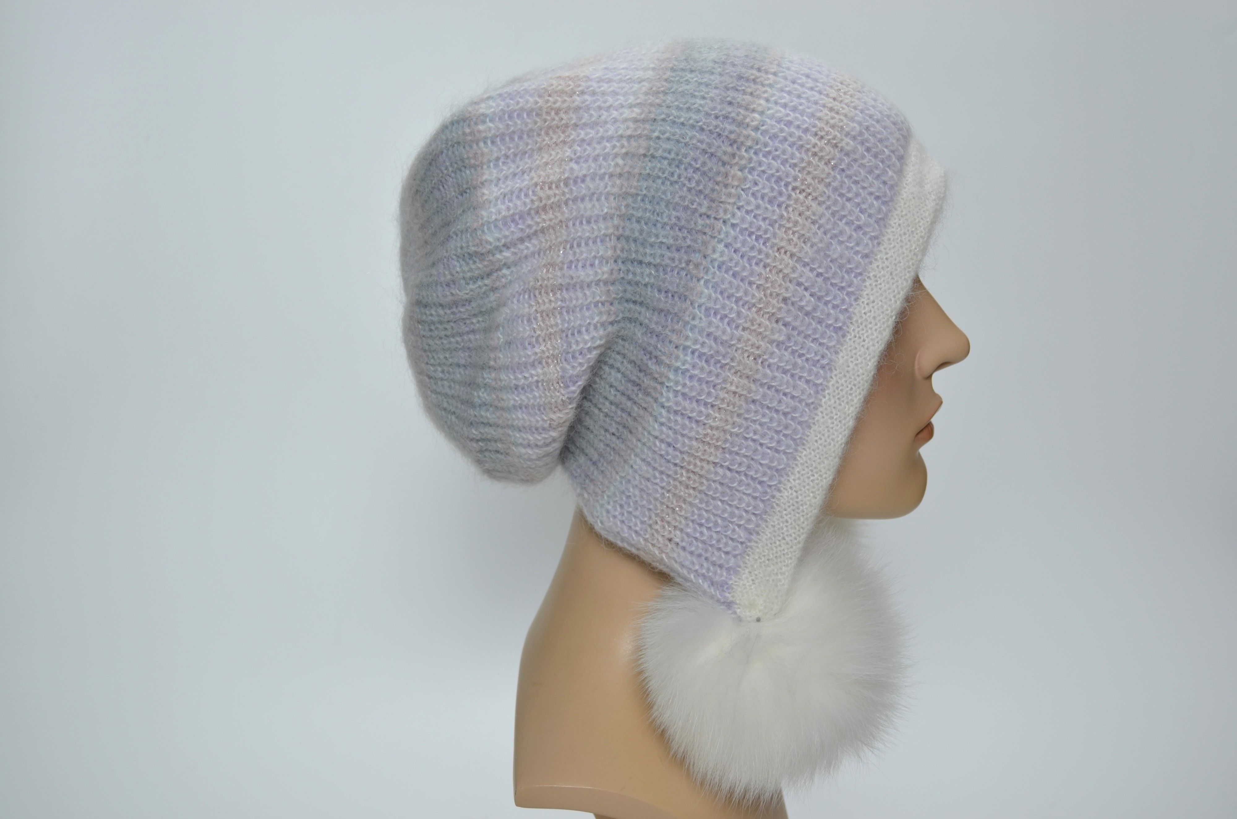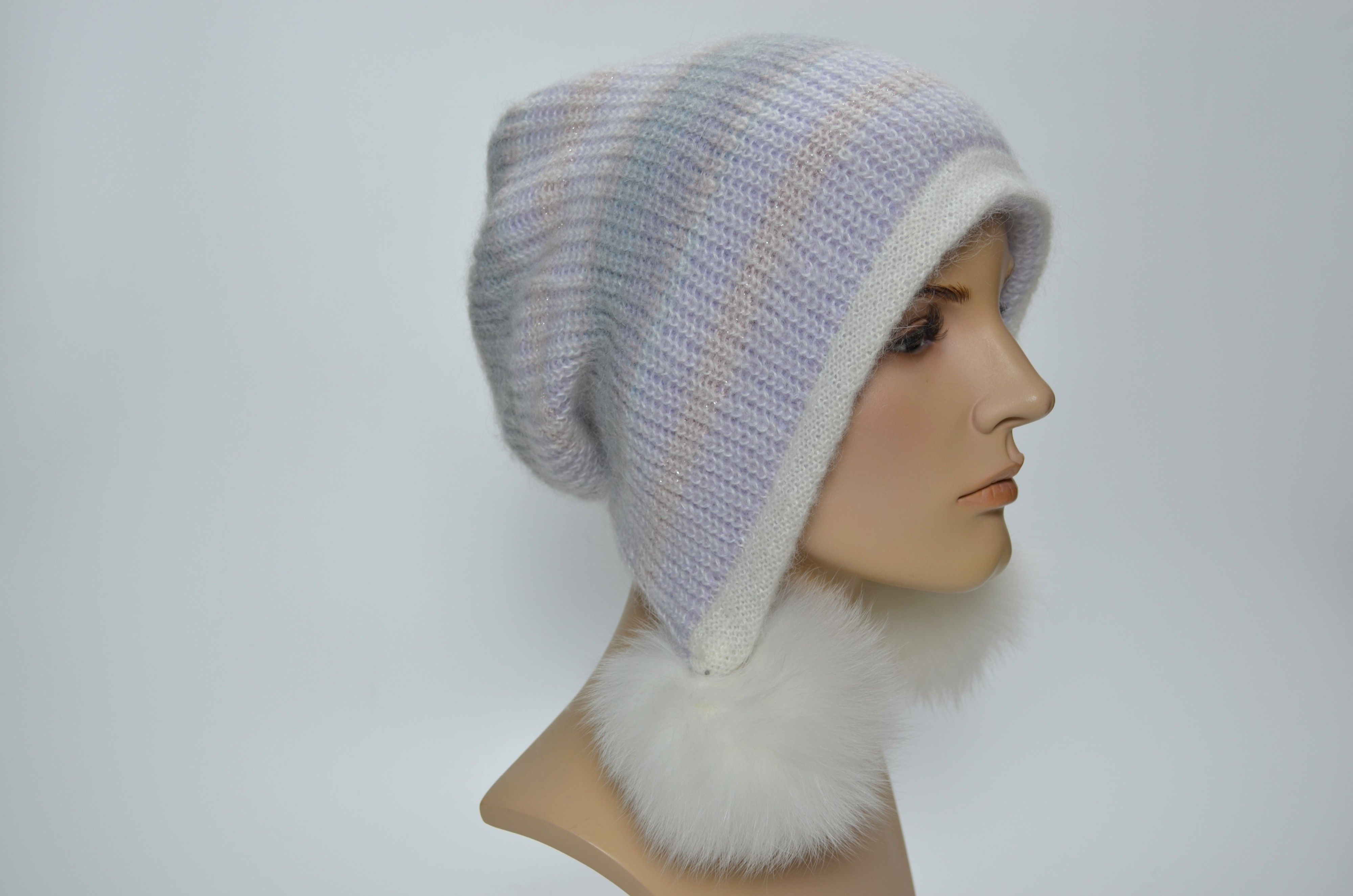 Вязаная белая разноцветная шапка ушанка из мохера и альпака со съемными меховыми помпонами Vizio Италия 1307 PP 66 из коллекции головных уборов осень зима 2024 2025