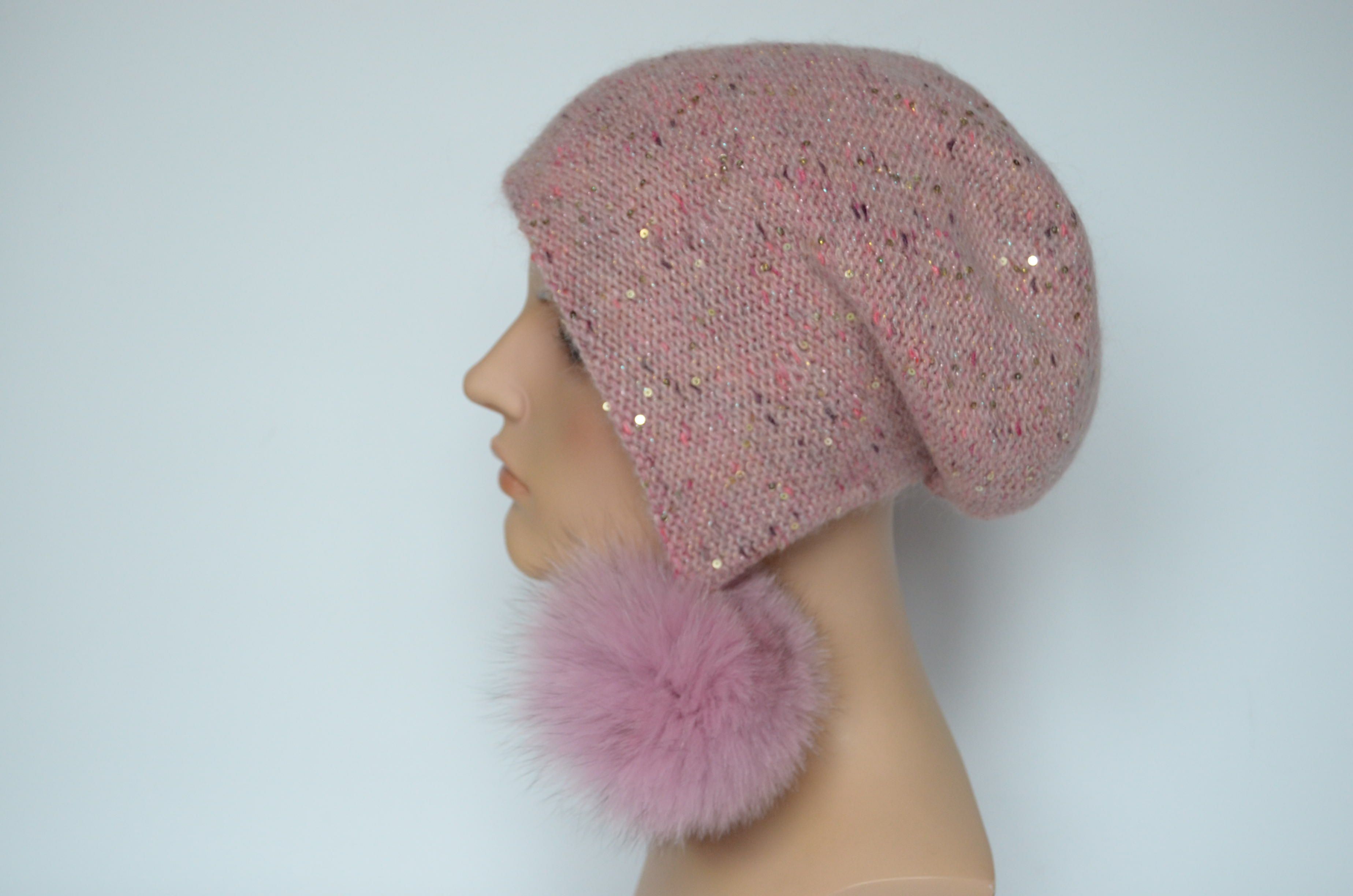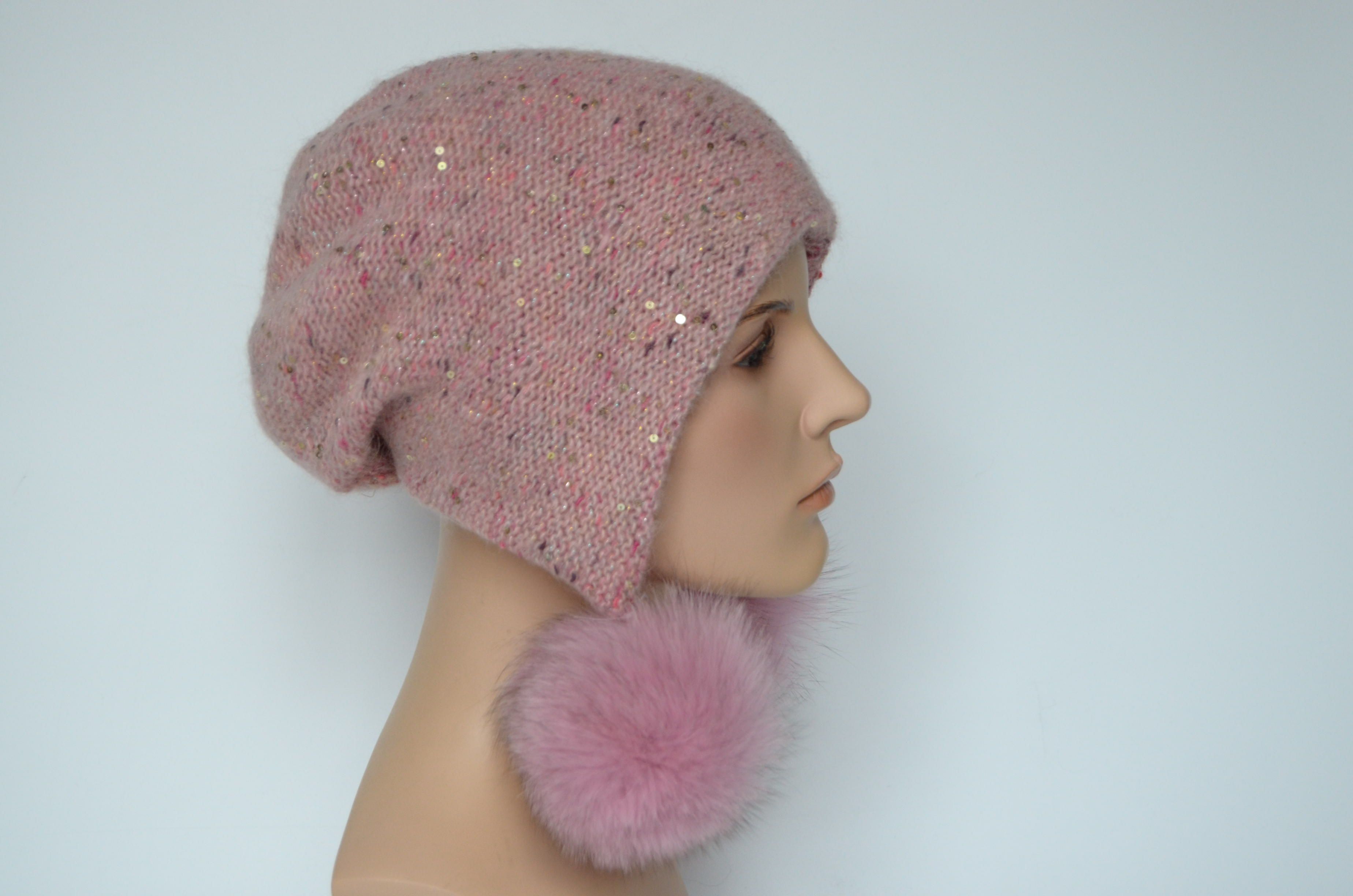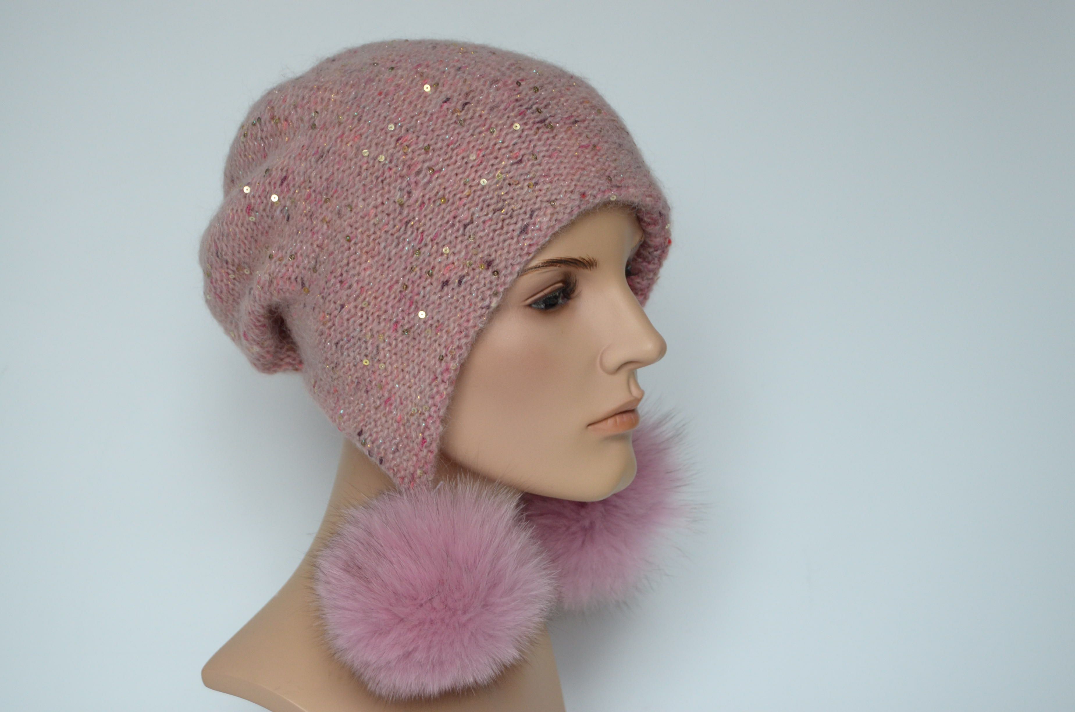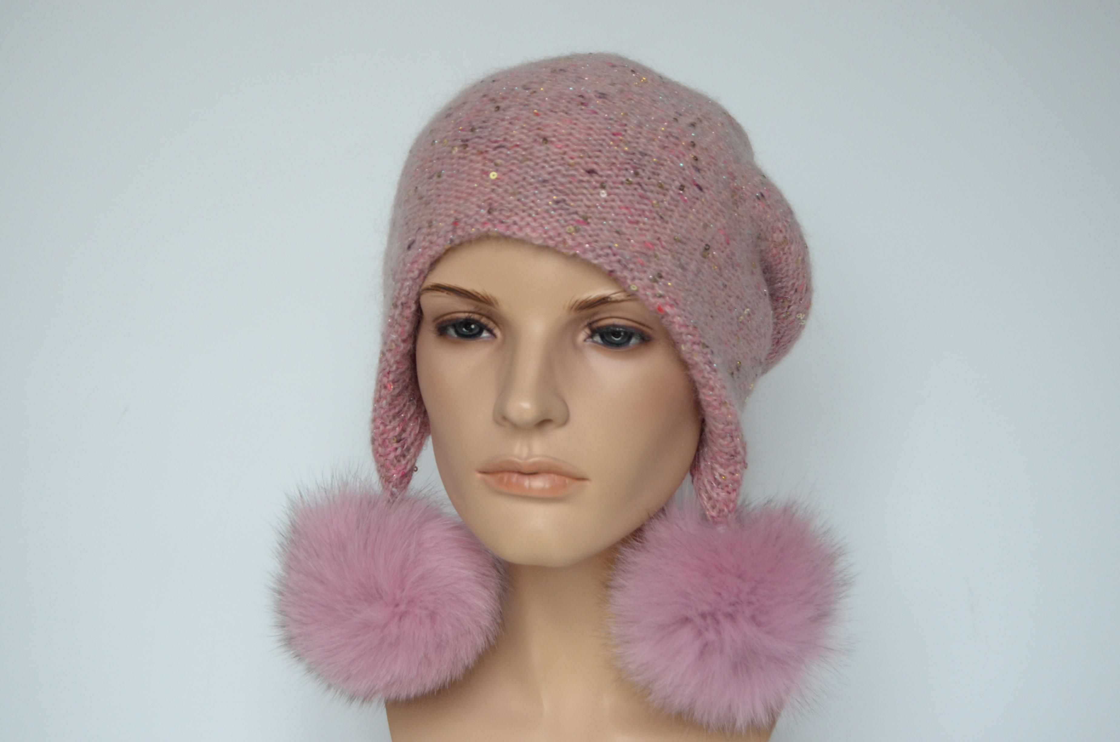 Женская шапка ушанка персикового цвета с помпонами вязаная двойная. Помпоны из натурального меха легко снимаются