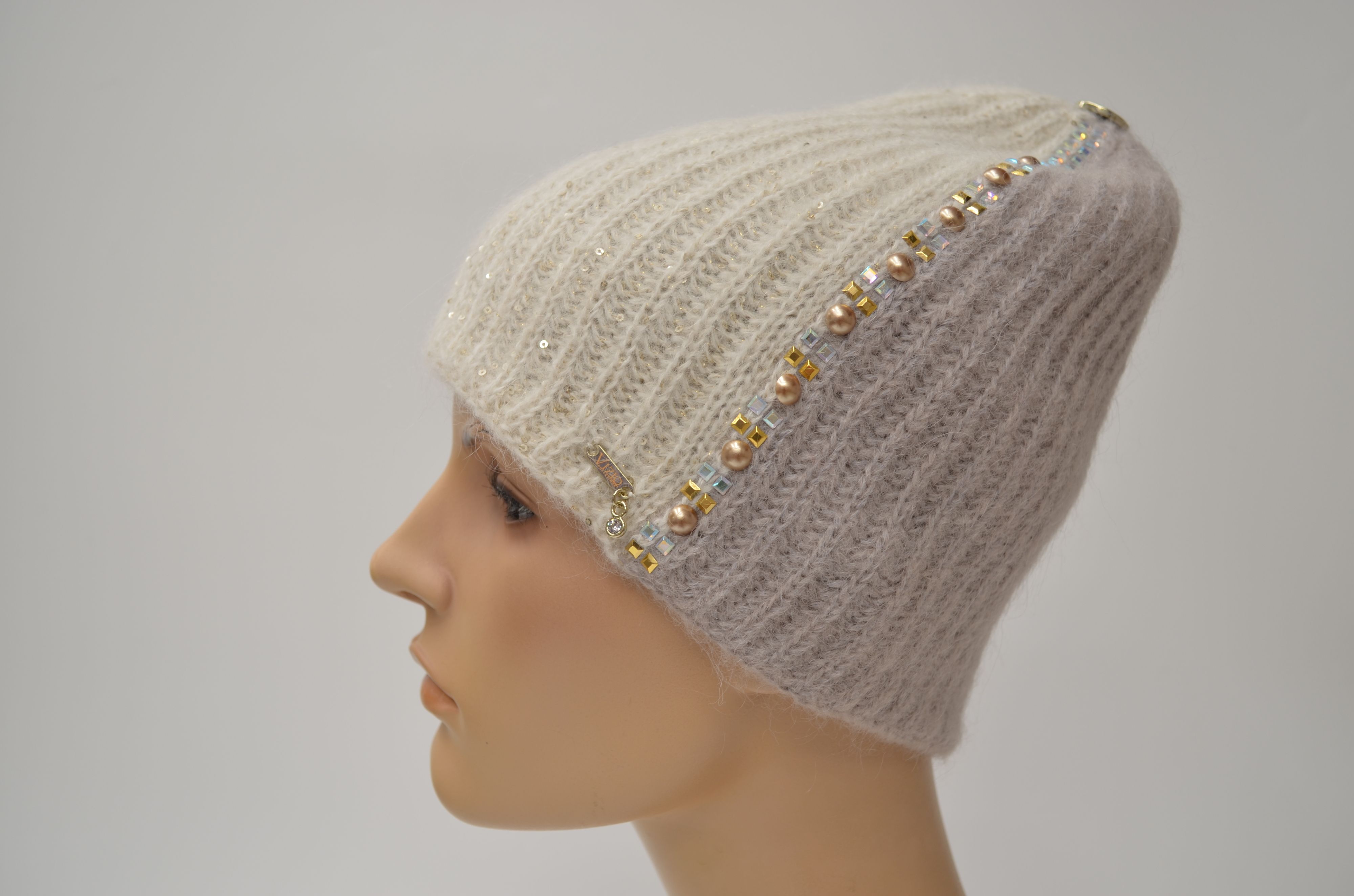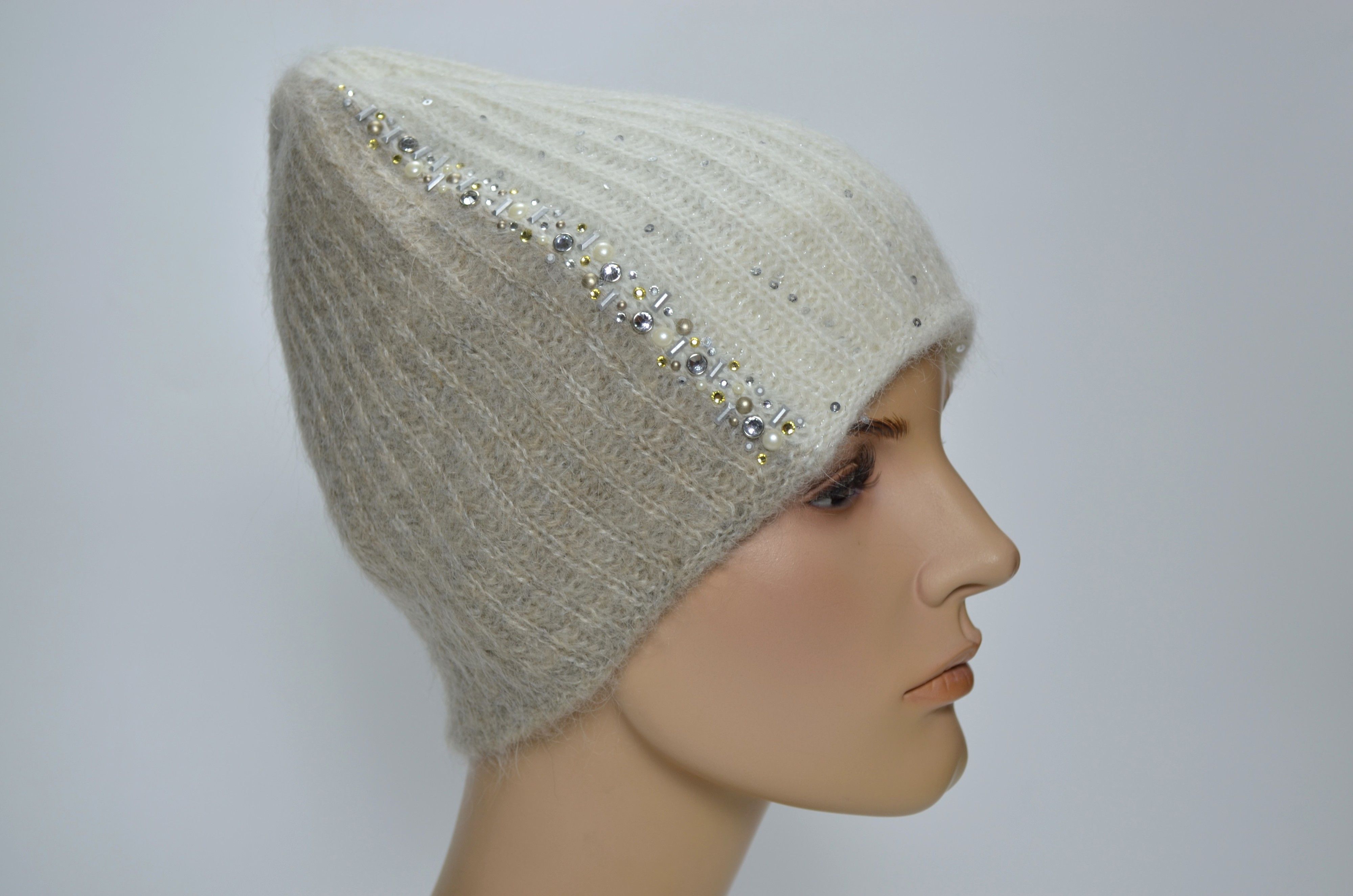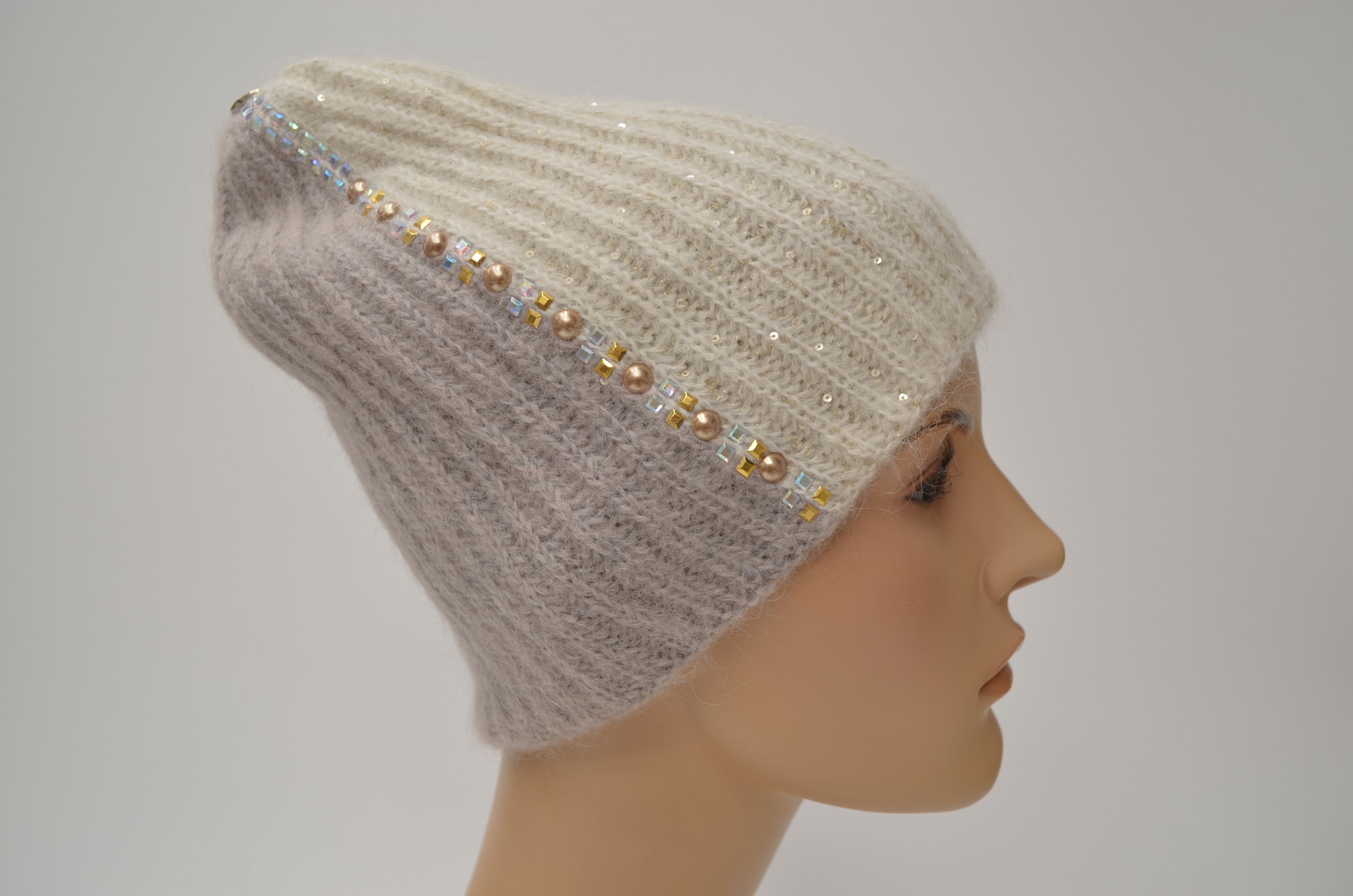 Женская бело - бежевая двухцветная вязаная шапка со стразами и пайетками