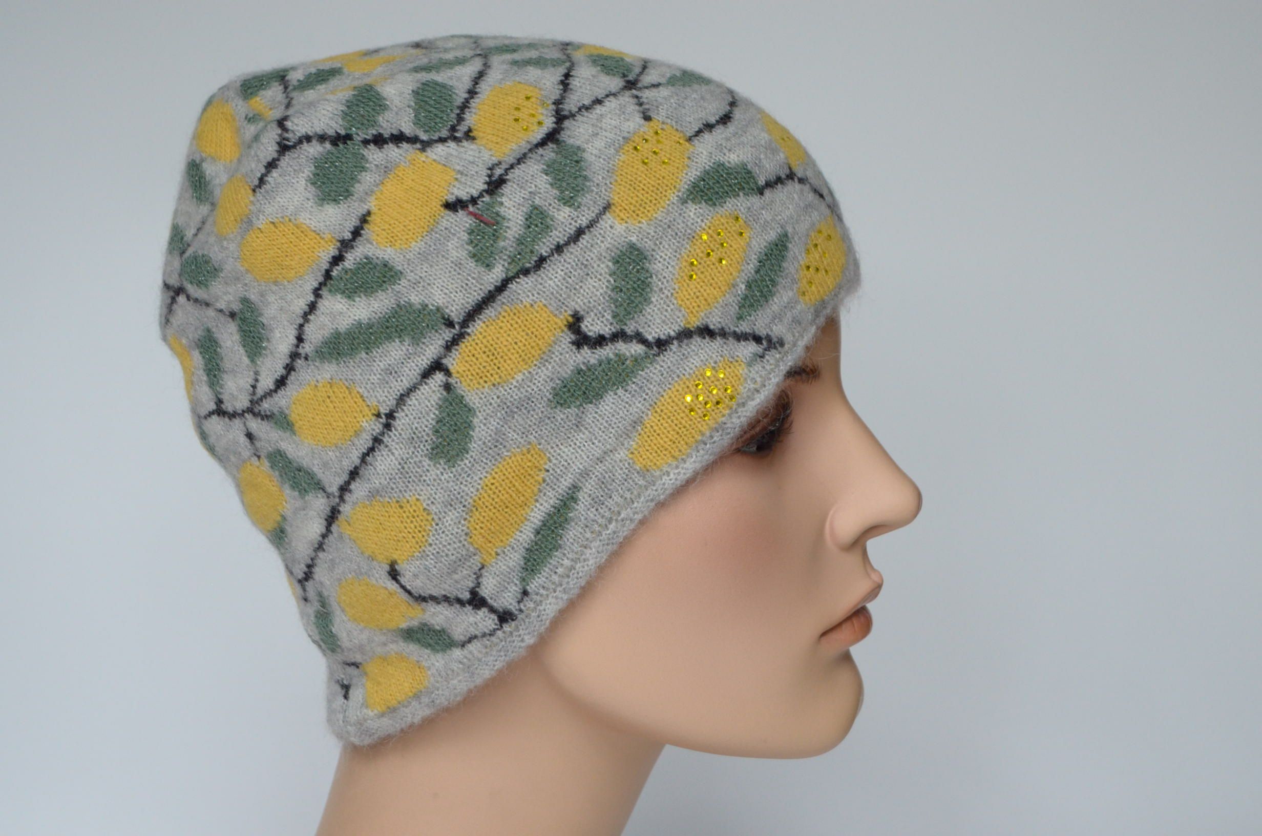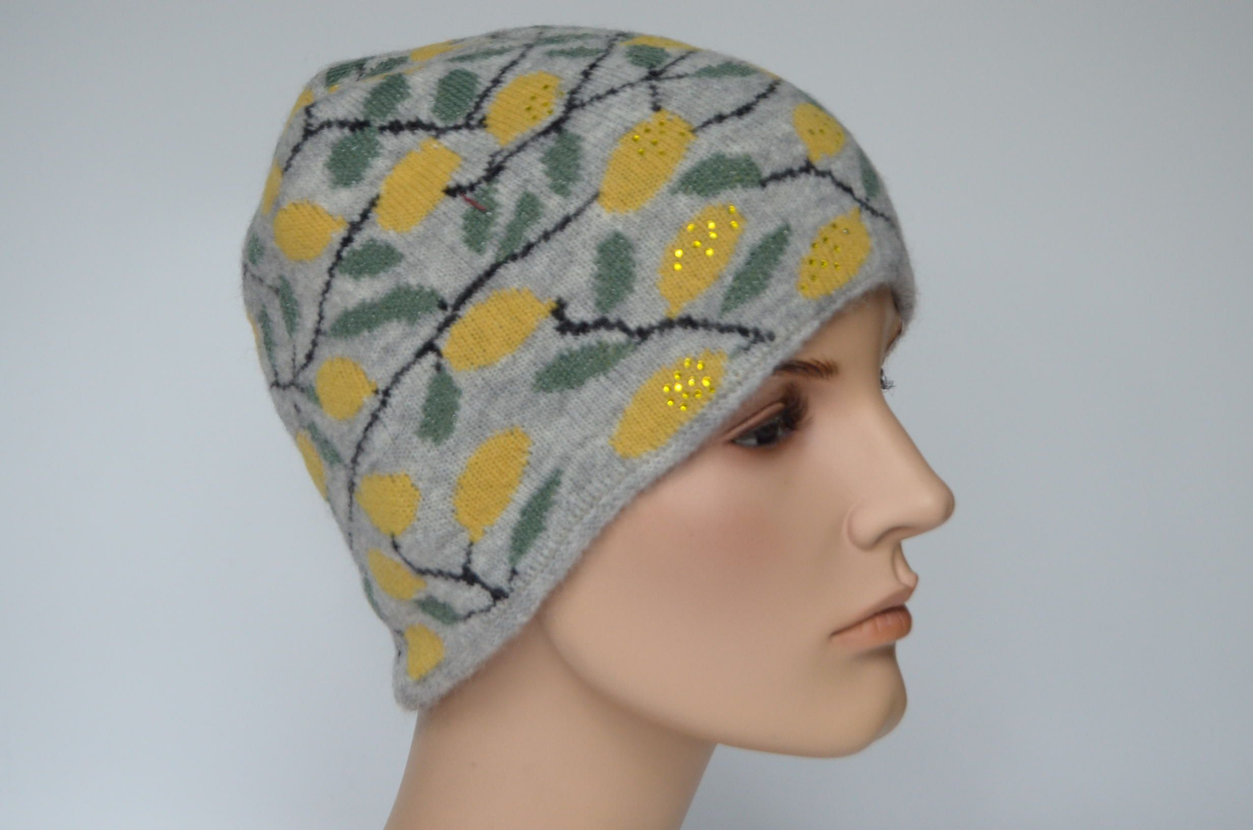 Серая шапка с лимонами женская Vizio Италия 1032 коллекция итальянских головных уборов 2023 - 2024 с лимонным принтом купить в магазине головных уборов Италии