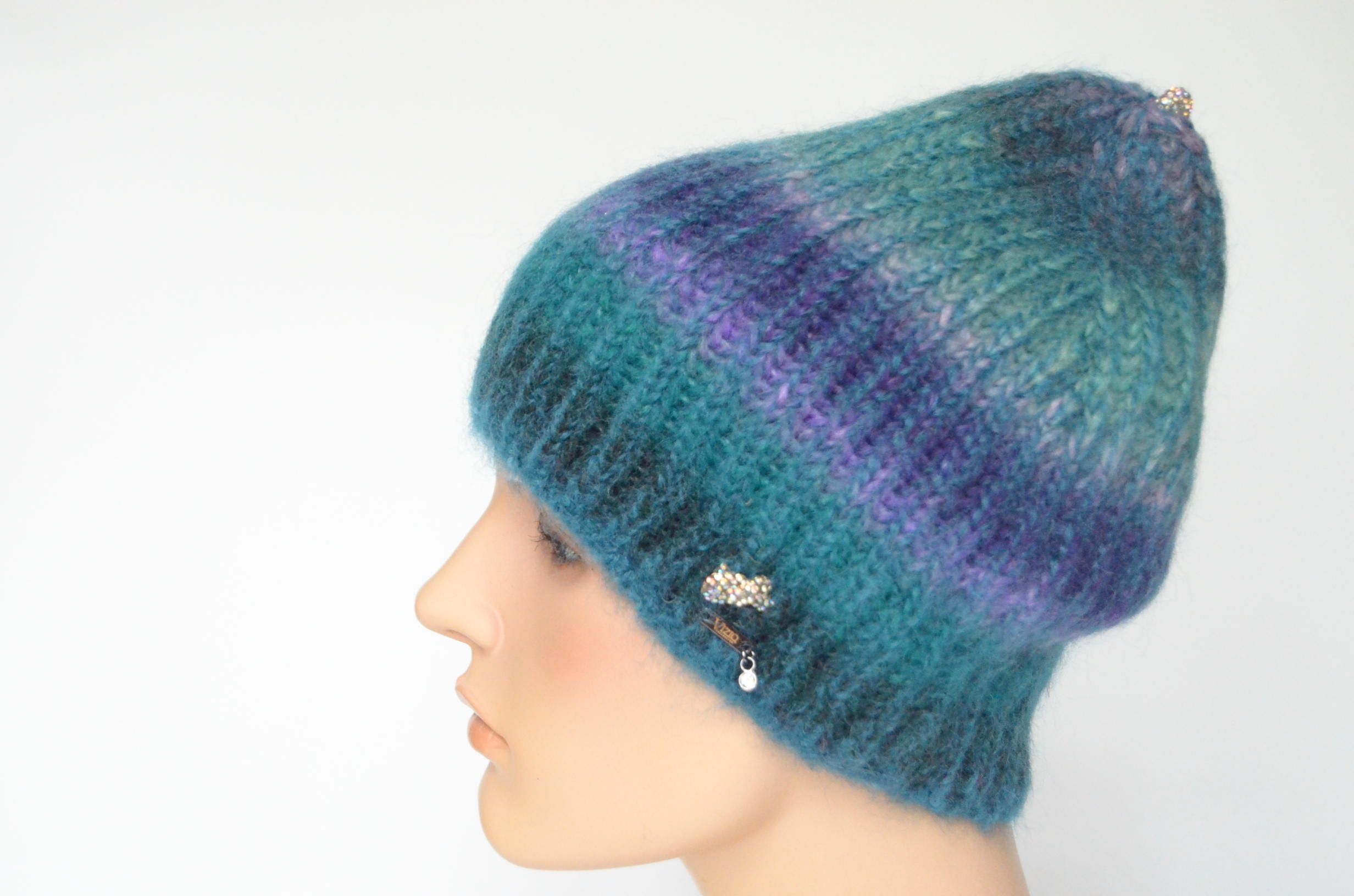 Разноцветная зимняя шапка женская одинарная теплая мятно - лиловая зима 2023 - 2024