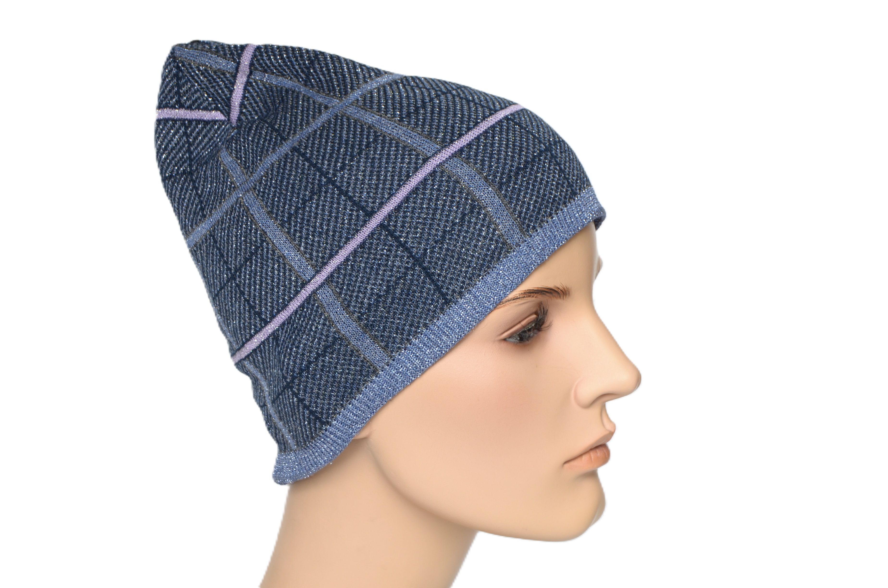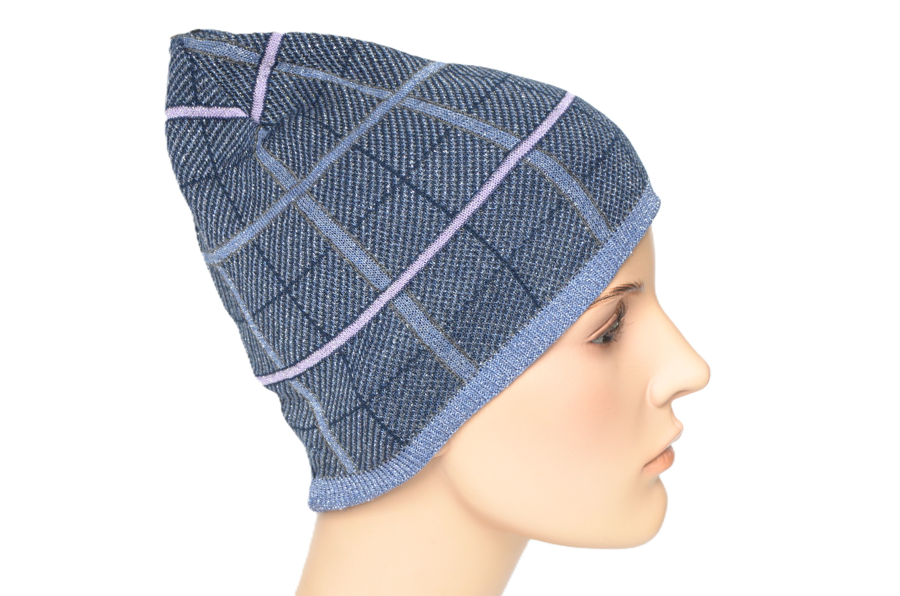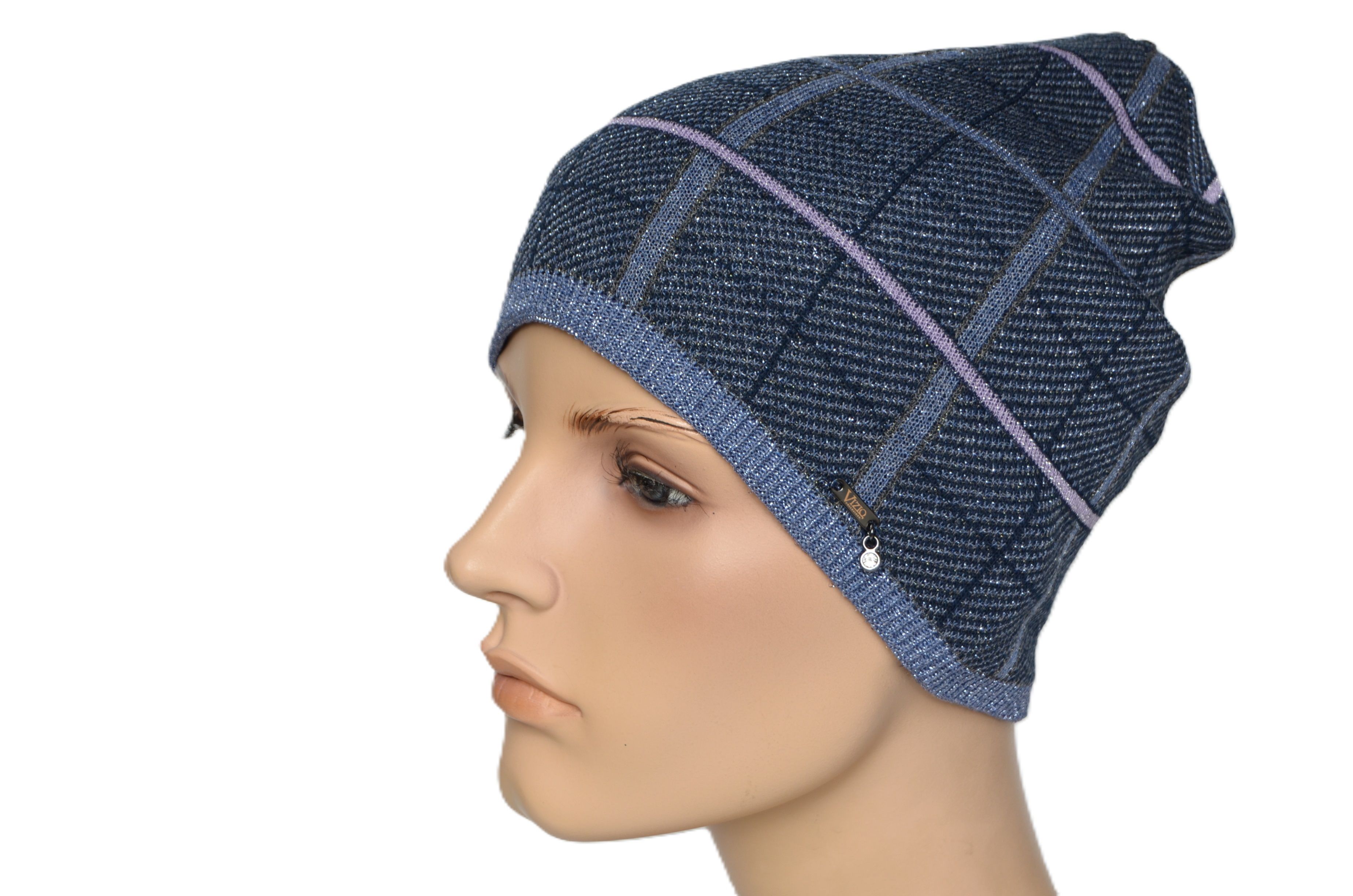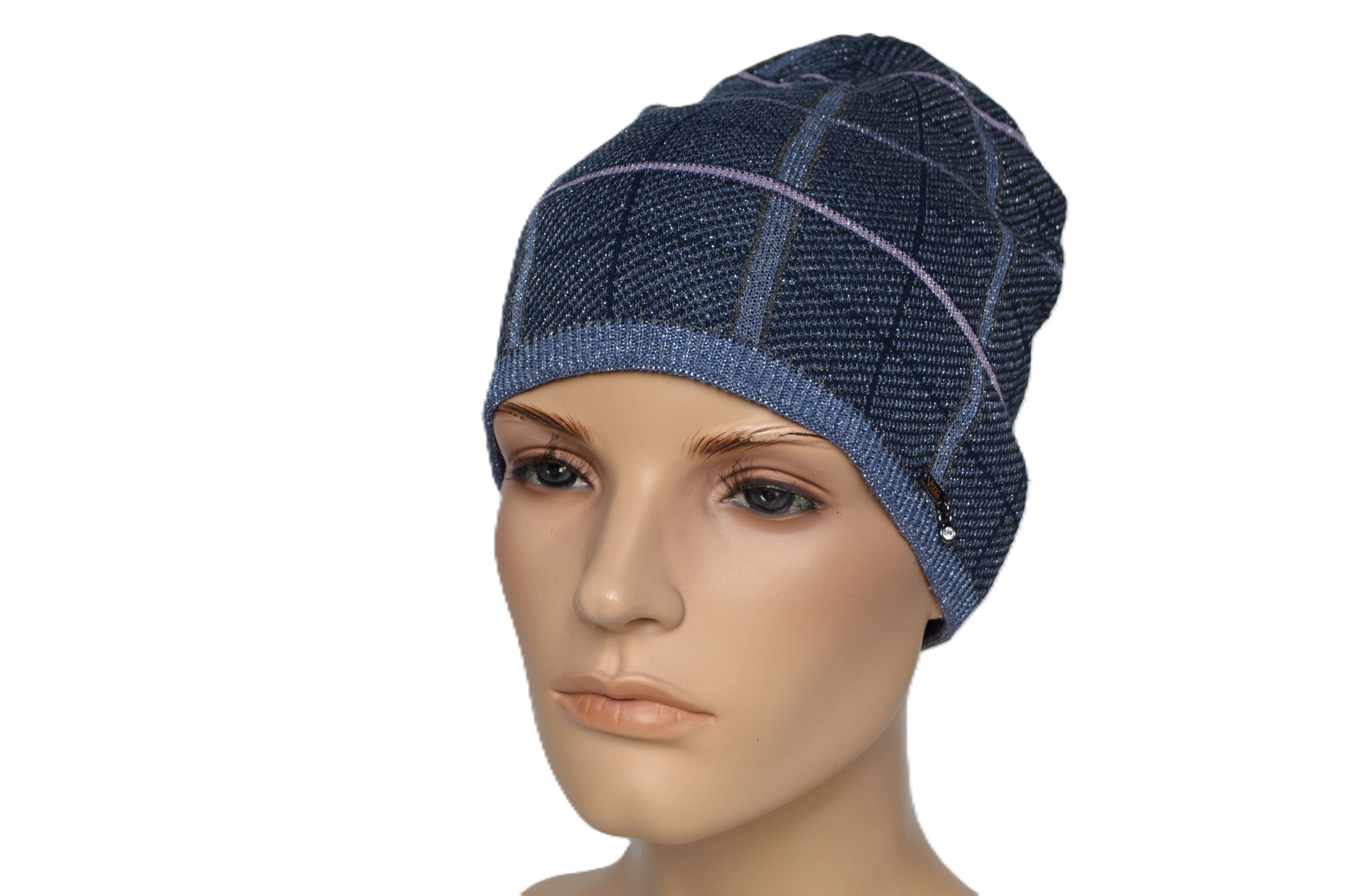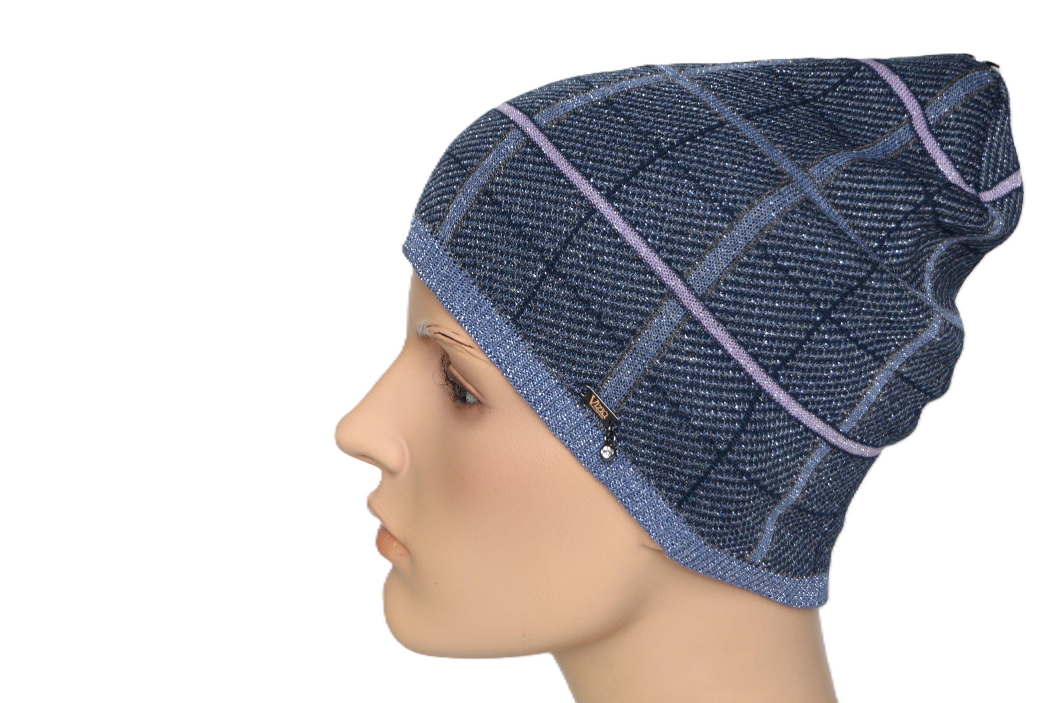 Синяя клетчатая шапка весна осень вязаная женская Vizio Италия 1209 CY с тонким вязаным подкладом.из хлопка купить с доставкой по Москве и России