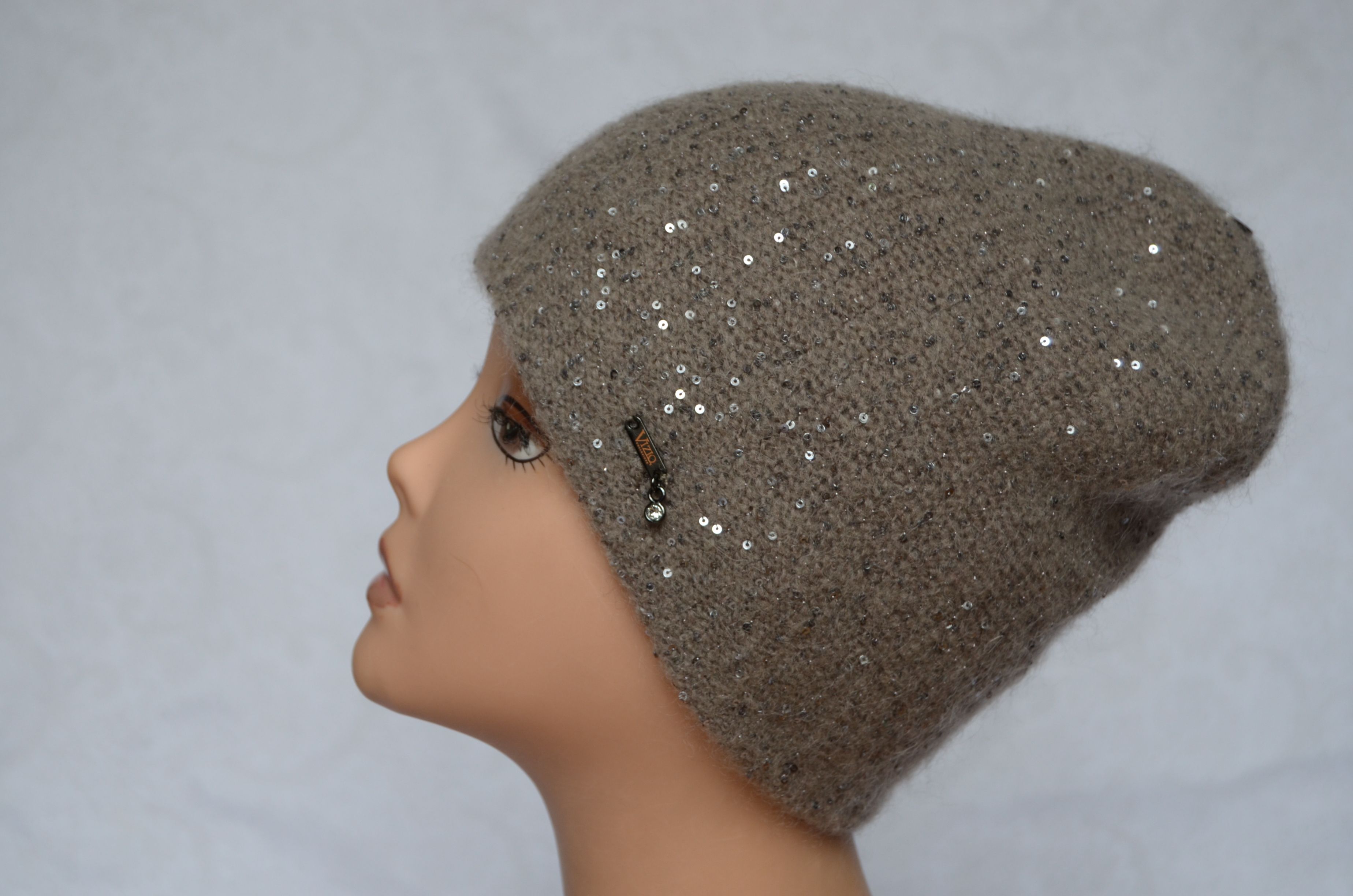 Женская зимняя вязаная шапка ореховая с пайетками Vizio Италия 6735 зима 2021 купить в магазине итальянских вязаных головных уборов Визио в Москве и с доставкой по России