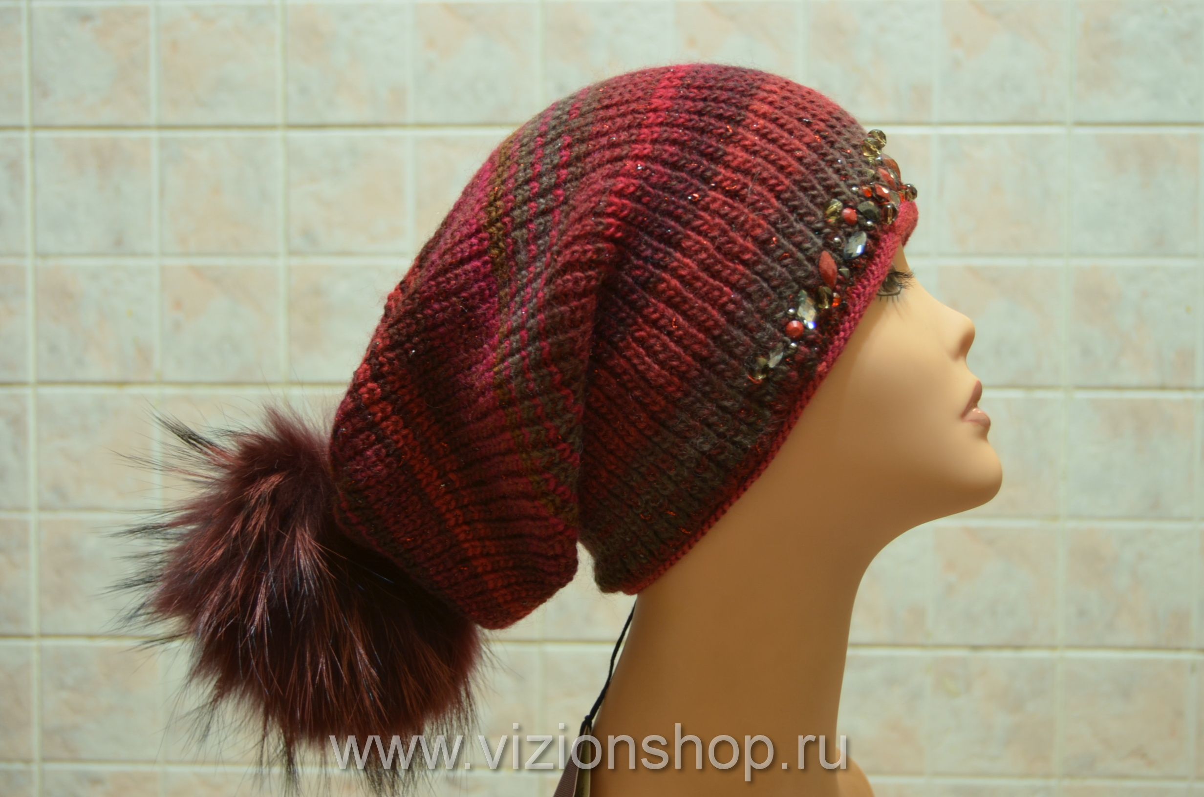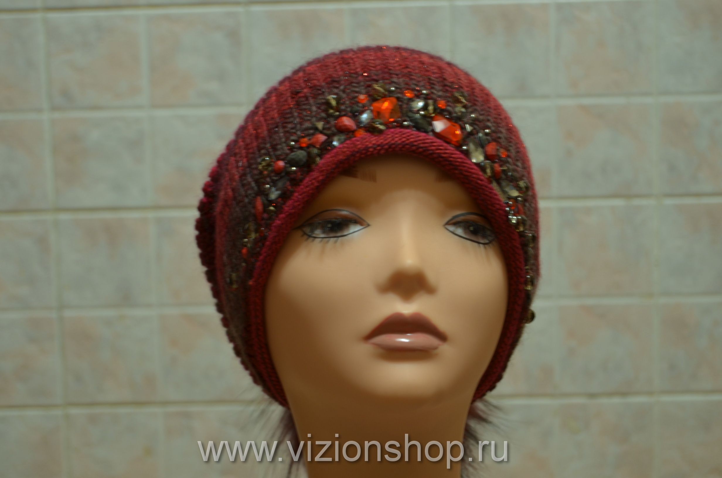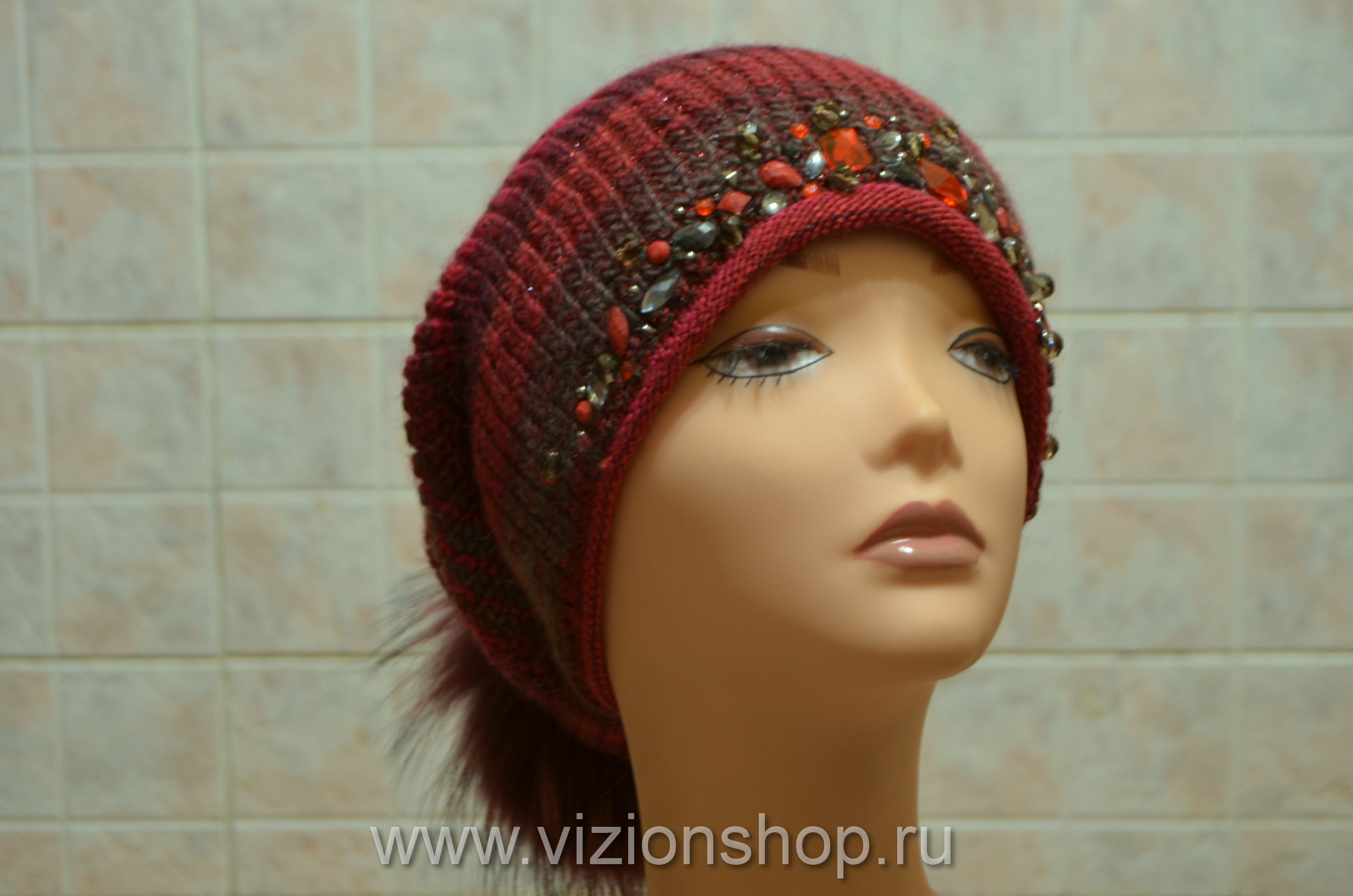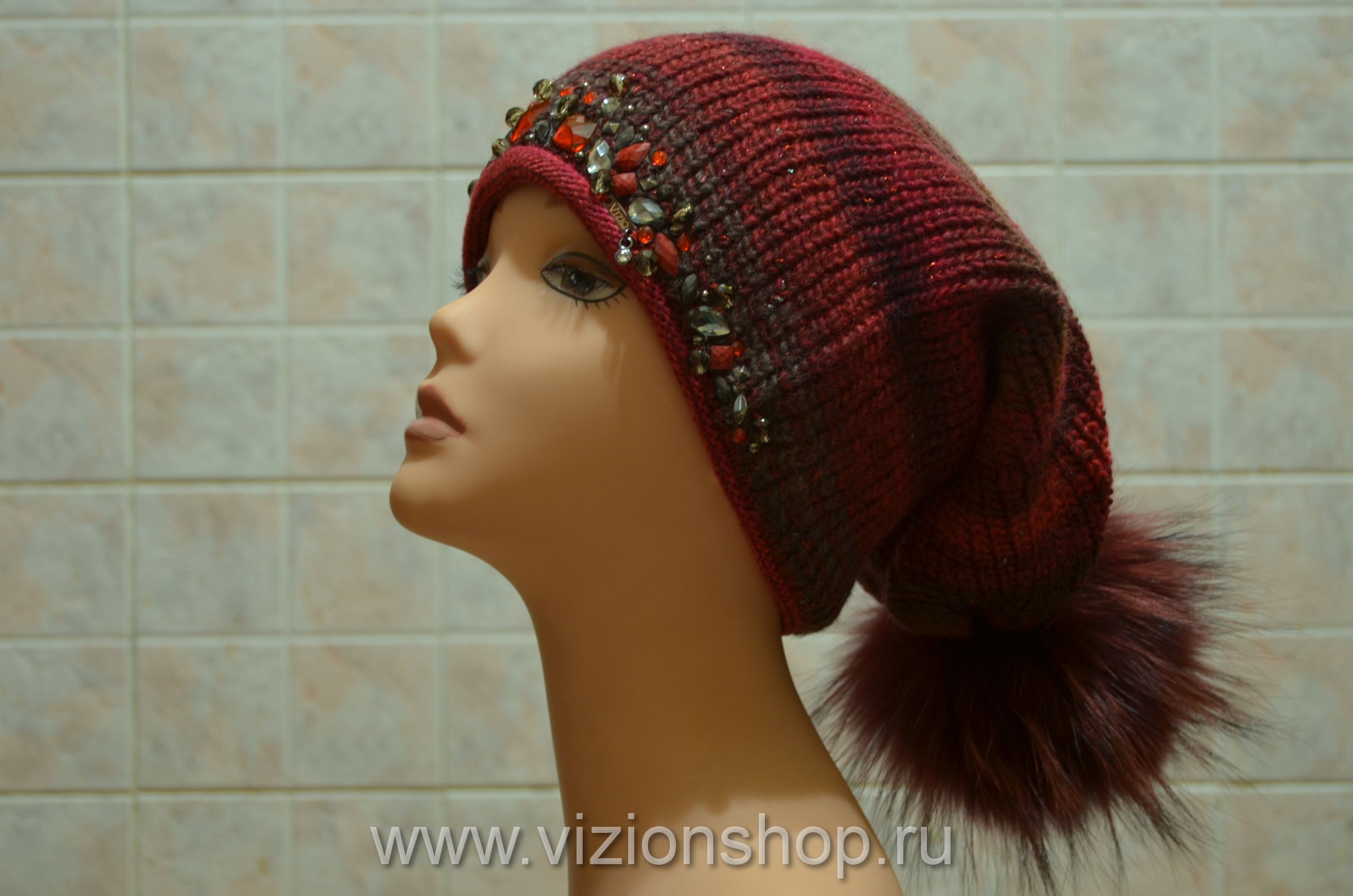 Шапка женская вязаная с помпоном и камнями Италия зима 2018 vizio Визио 5833 купить в интернет магазине модных шапок для женщин в Москве