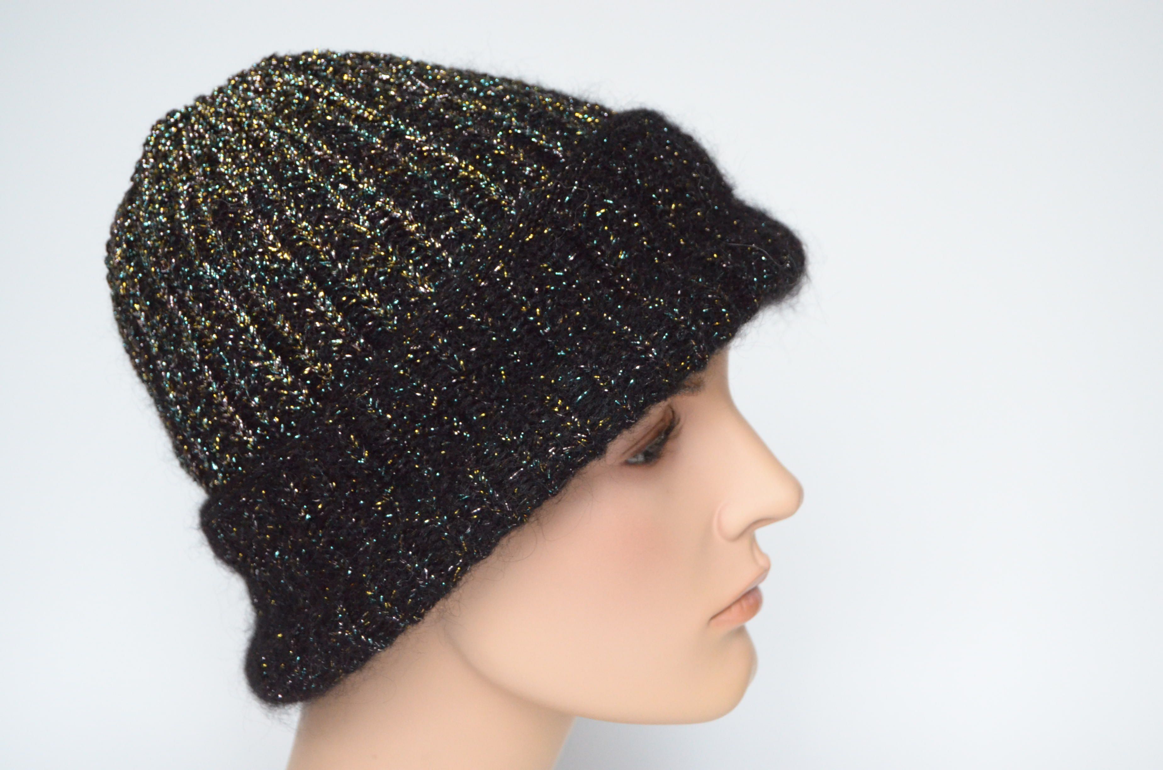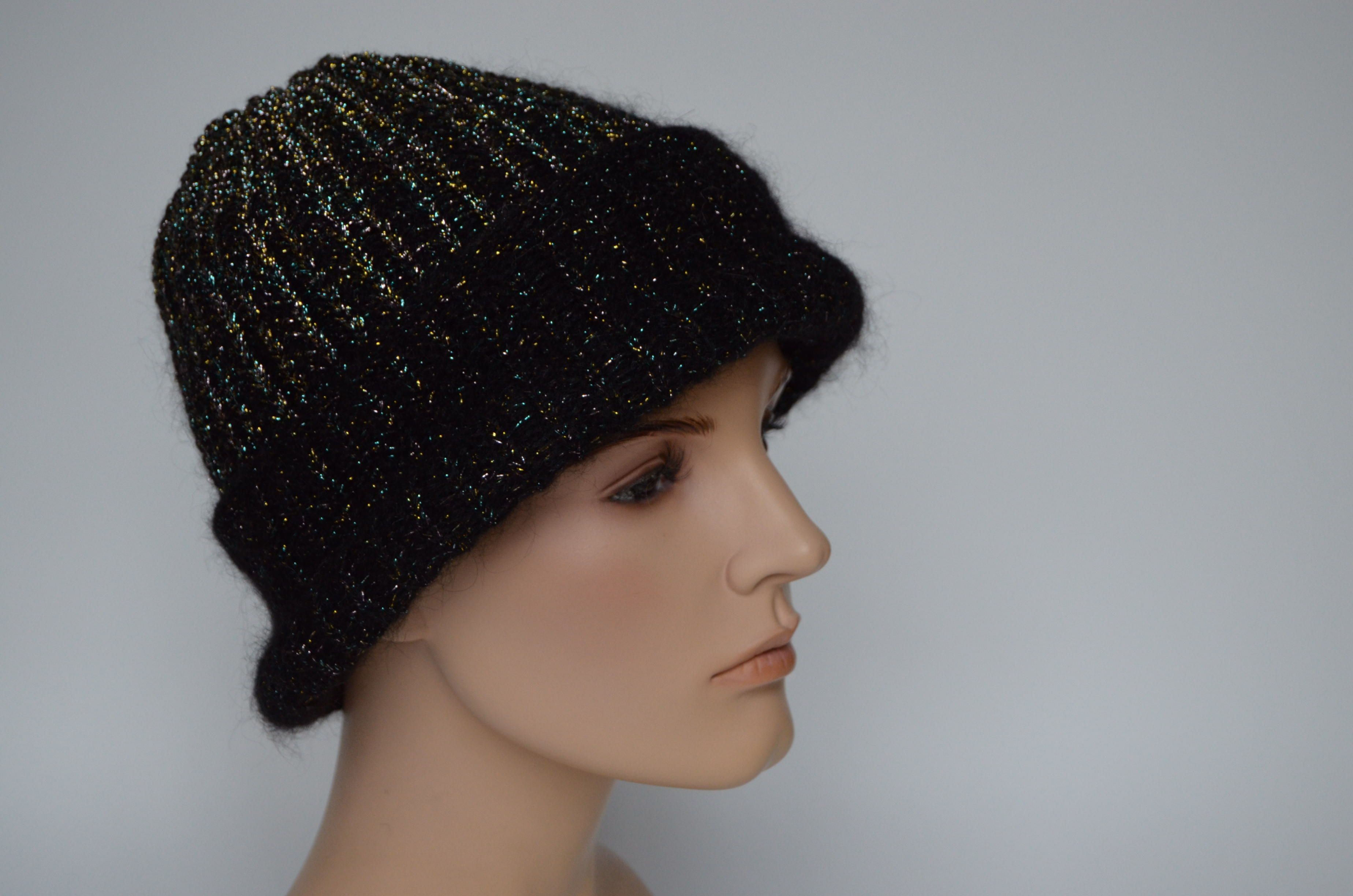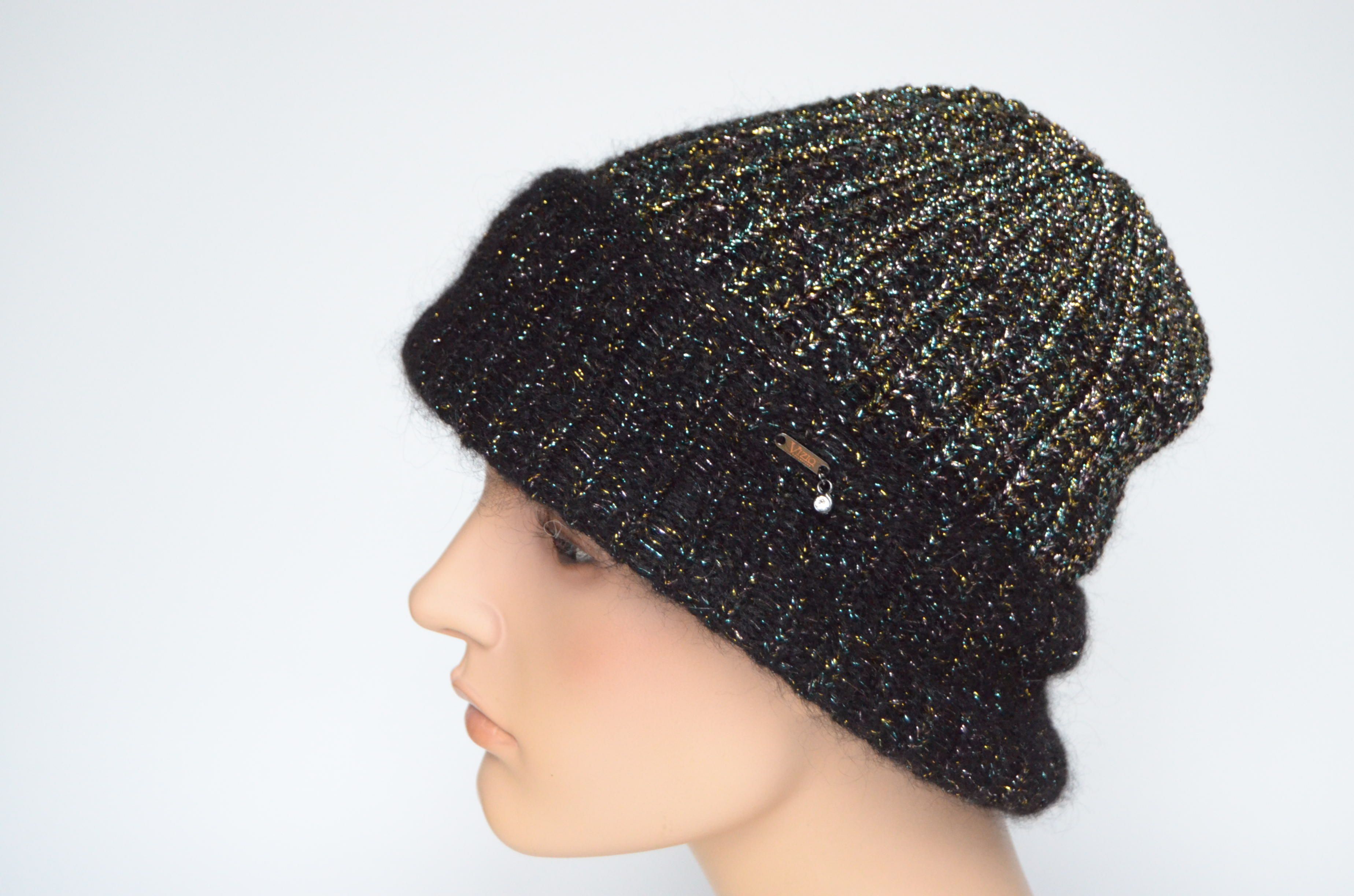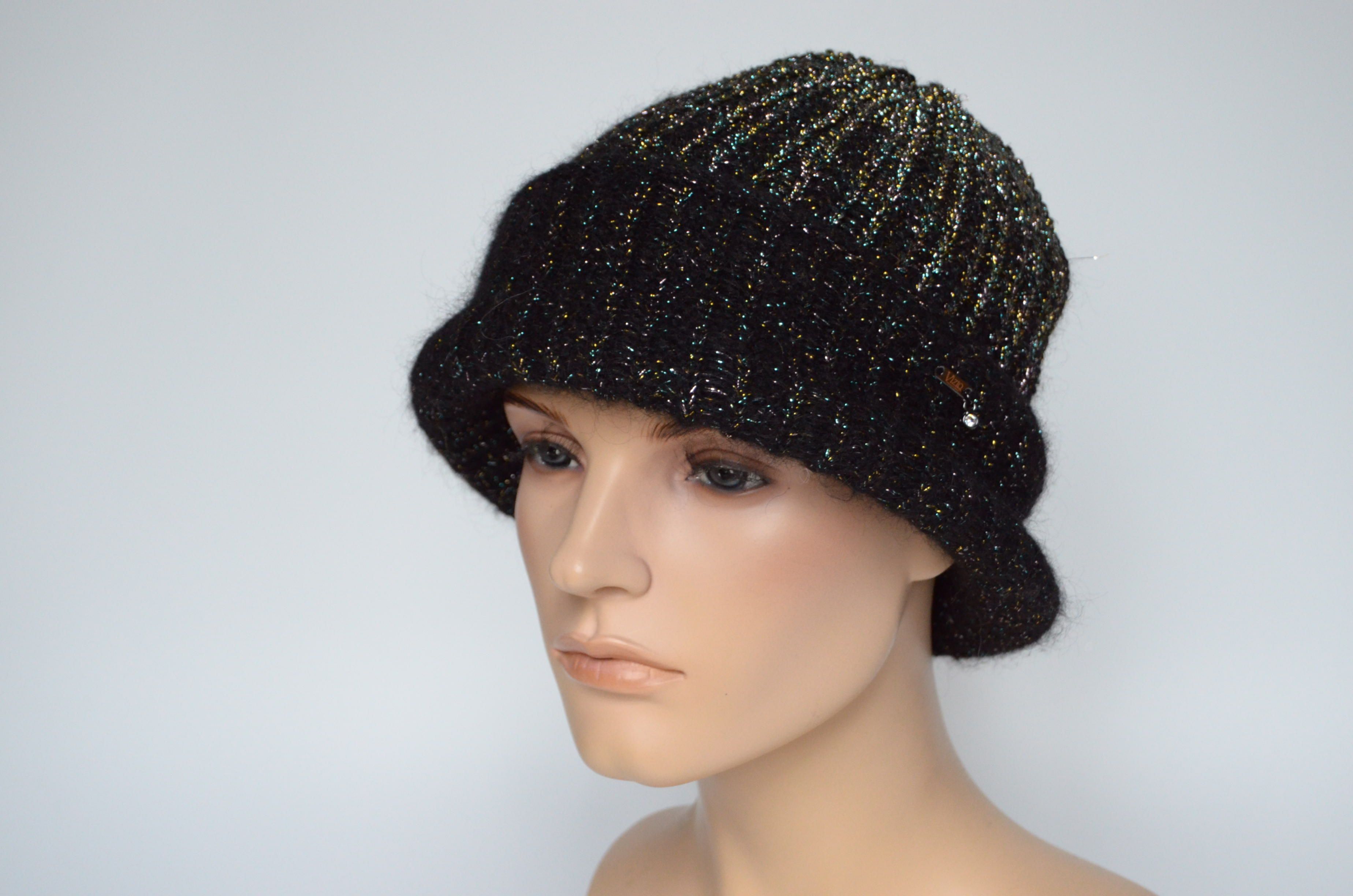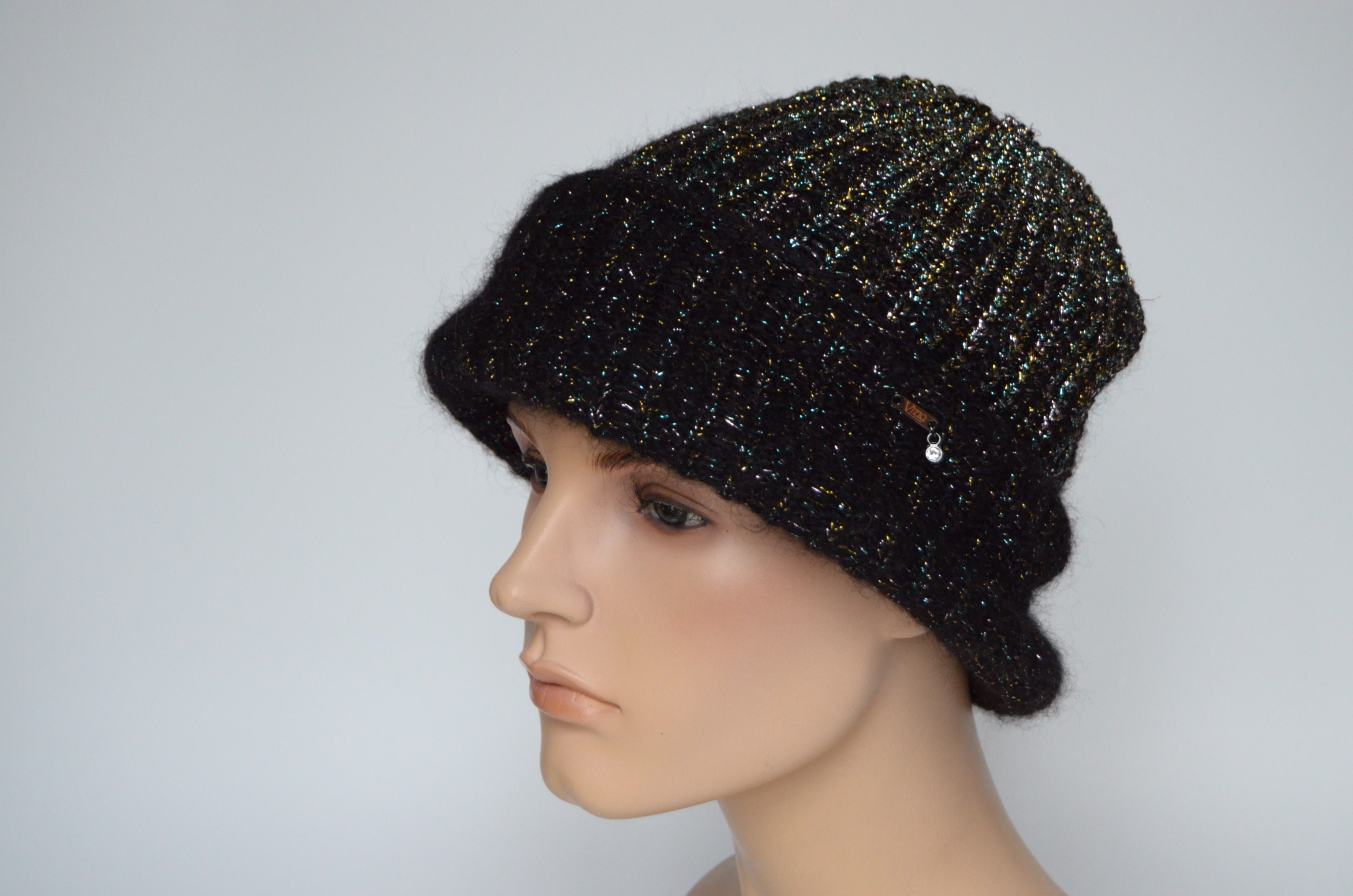 Шляпа со стразами черная женская вязаная из альпака и мохера зимняя