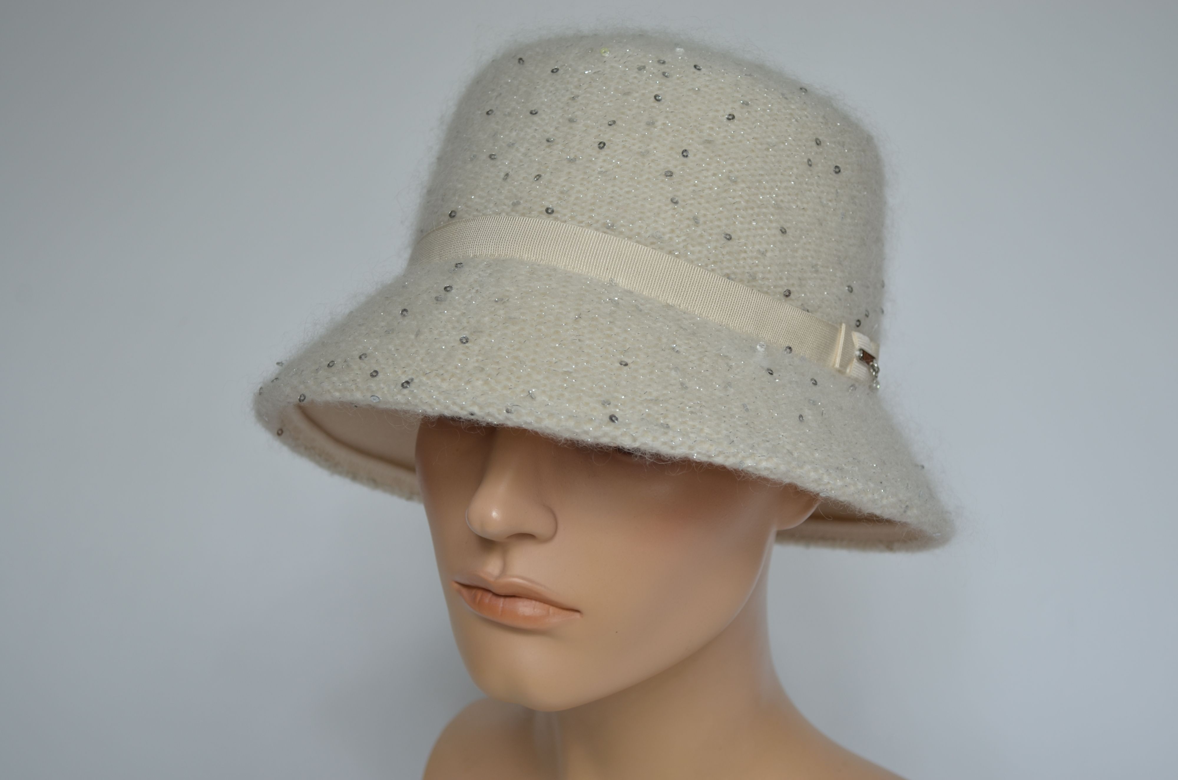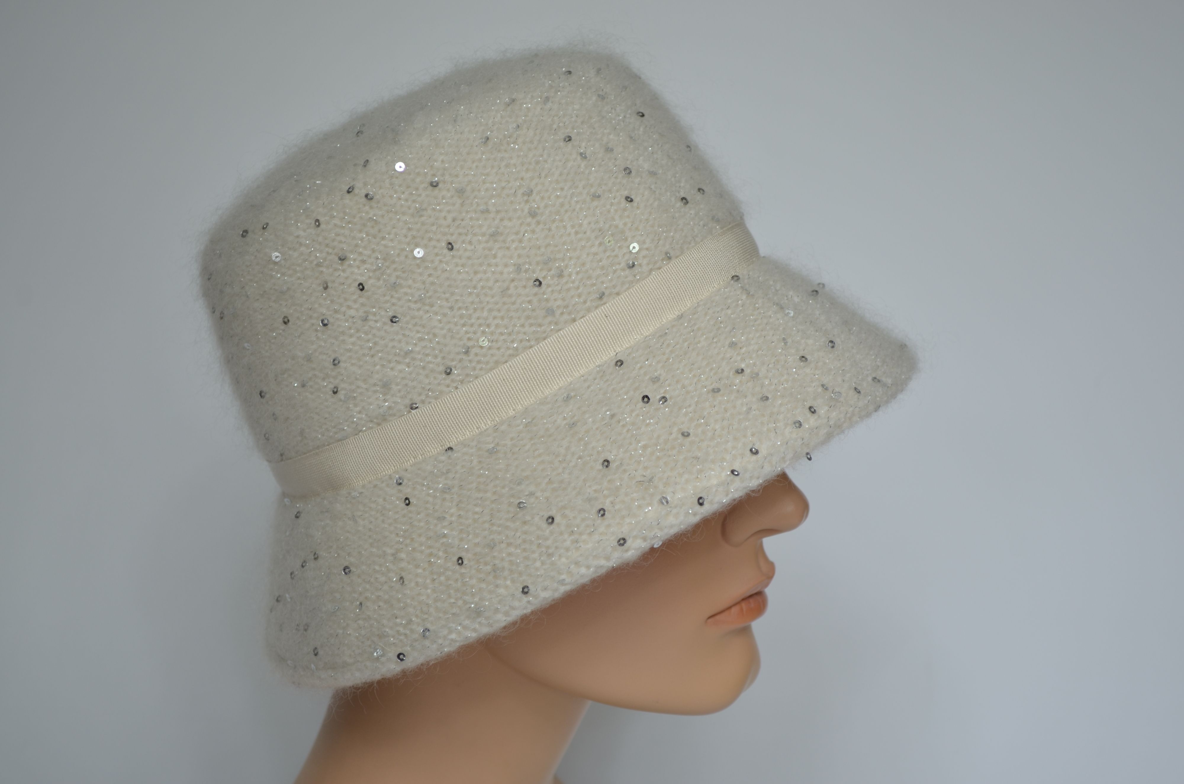 Зимняя шляпа фетровая белая женская с вязаной отделкой пряжей с пайетками