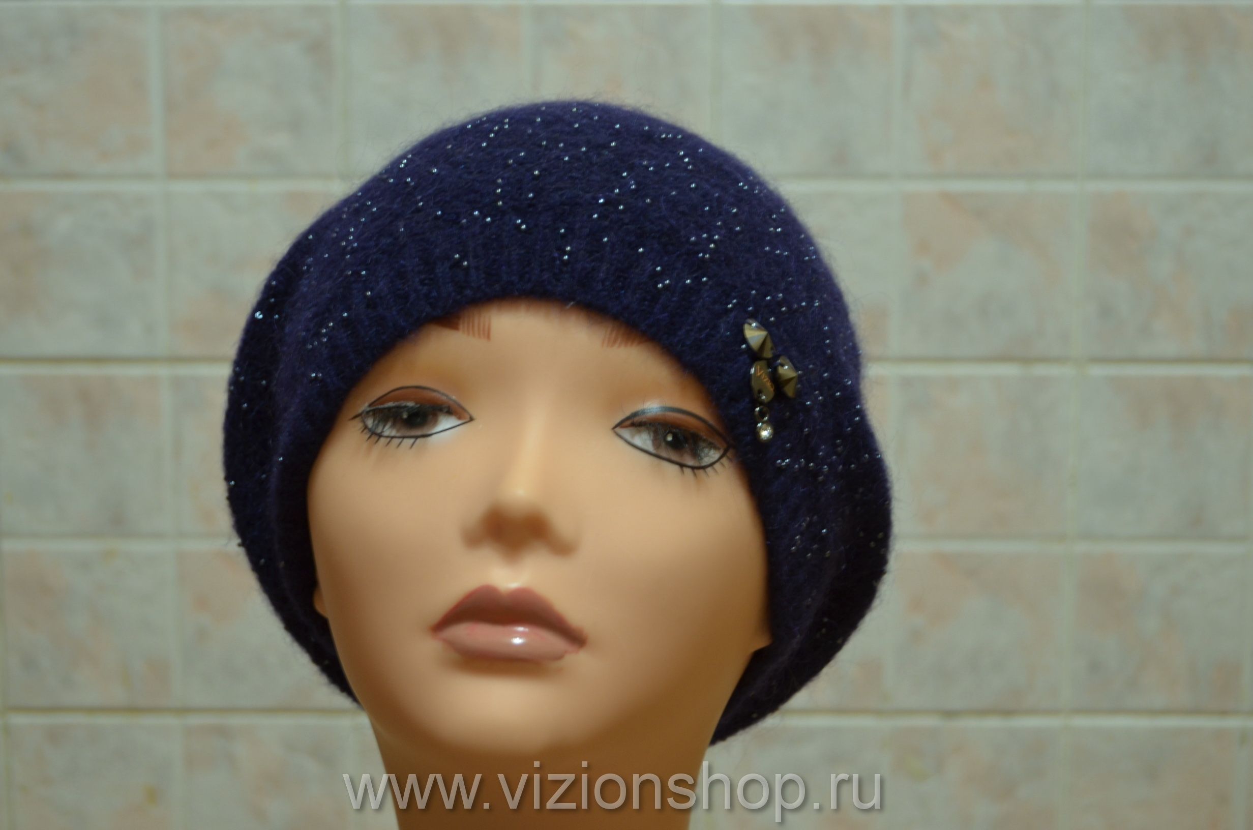 Берет женский вязаный с бусинками тонкий Vizio Италия 5503 синий из коллекции женских беретов с бусинками осень - зима 2016 - 2017