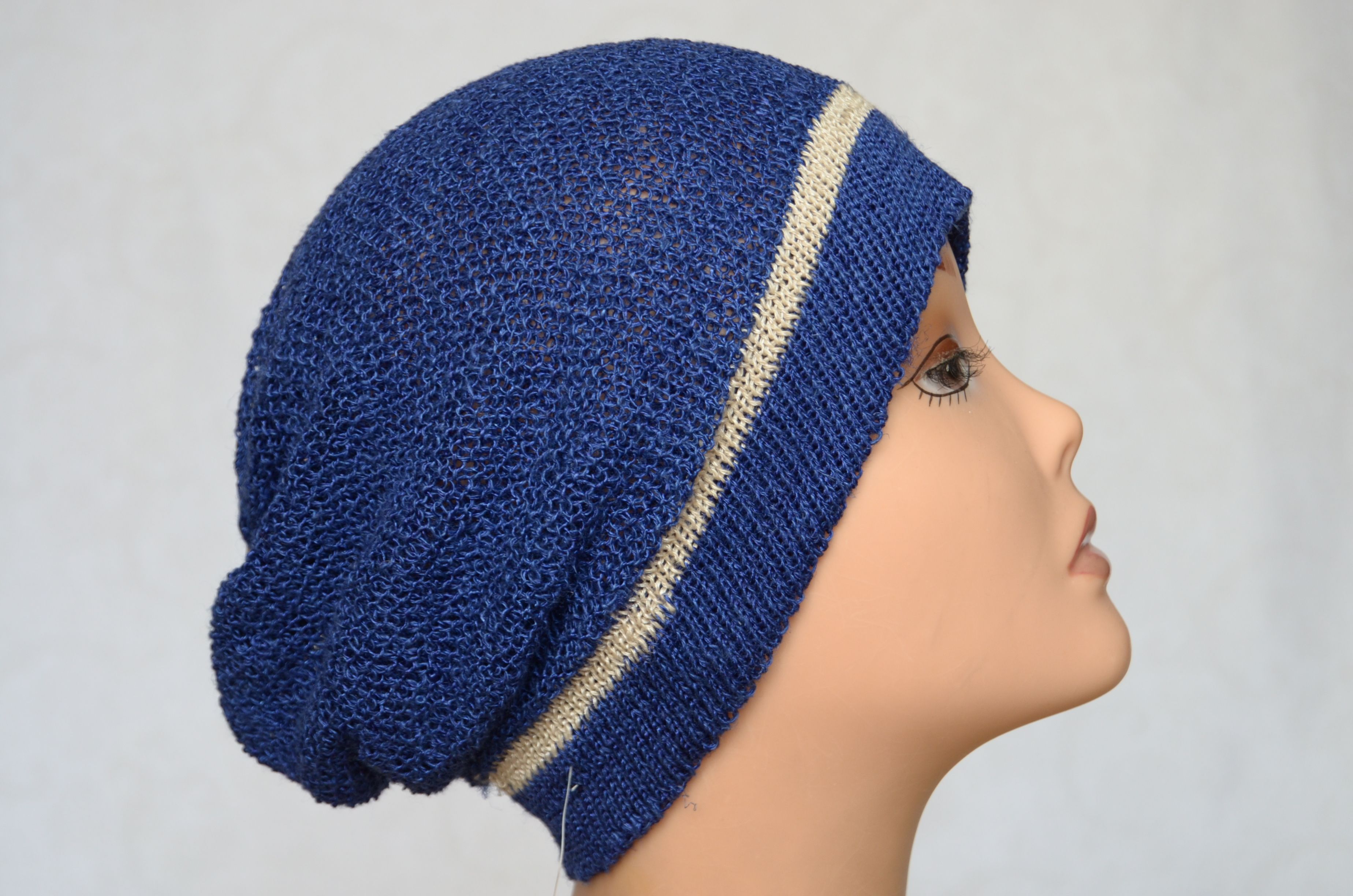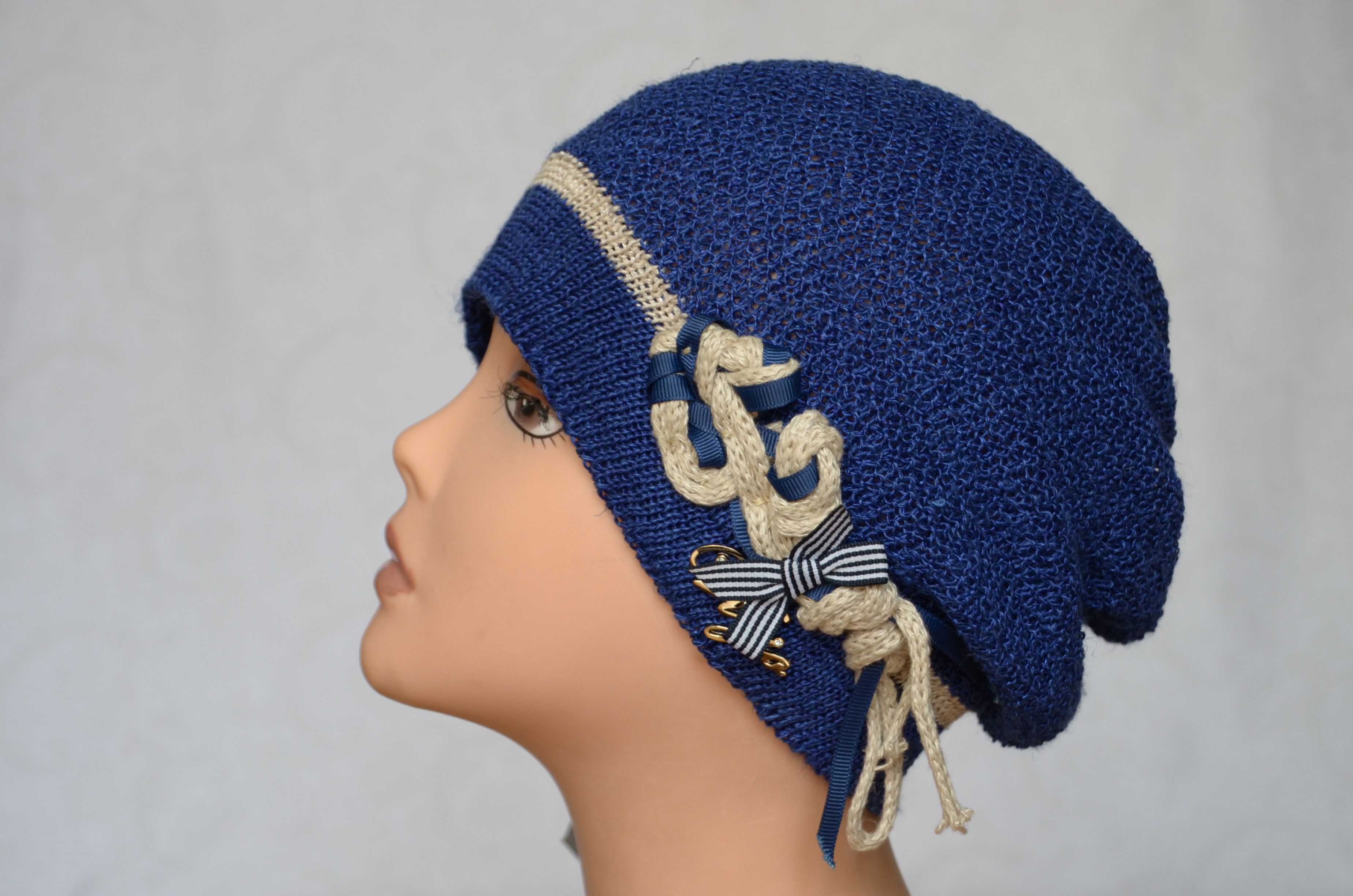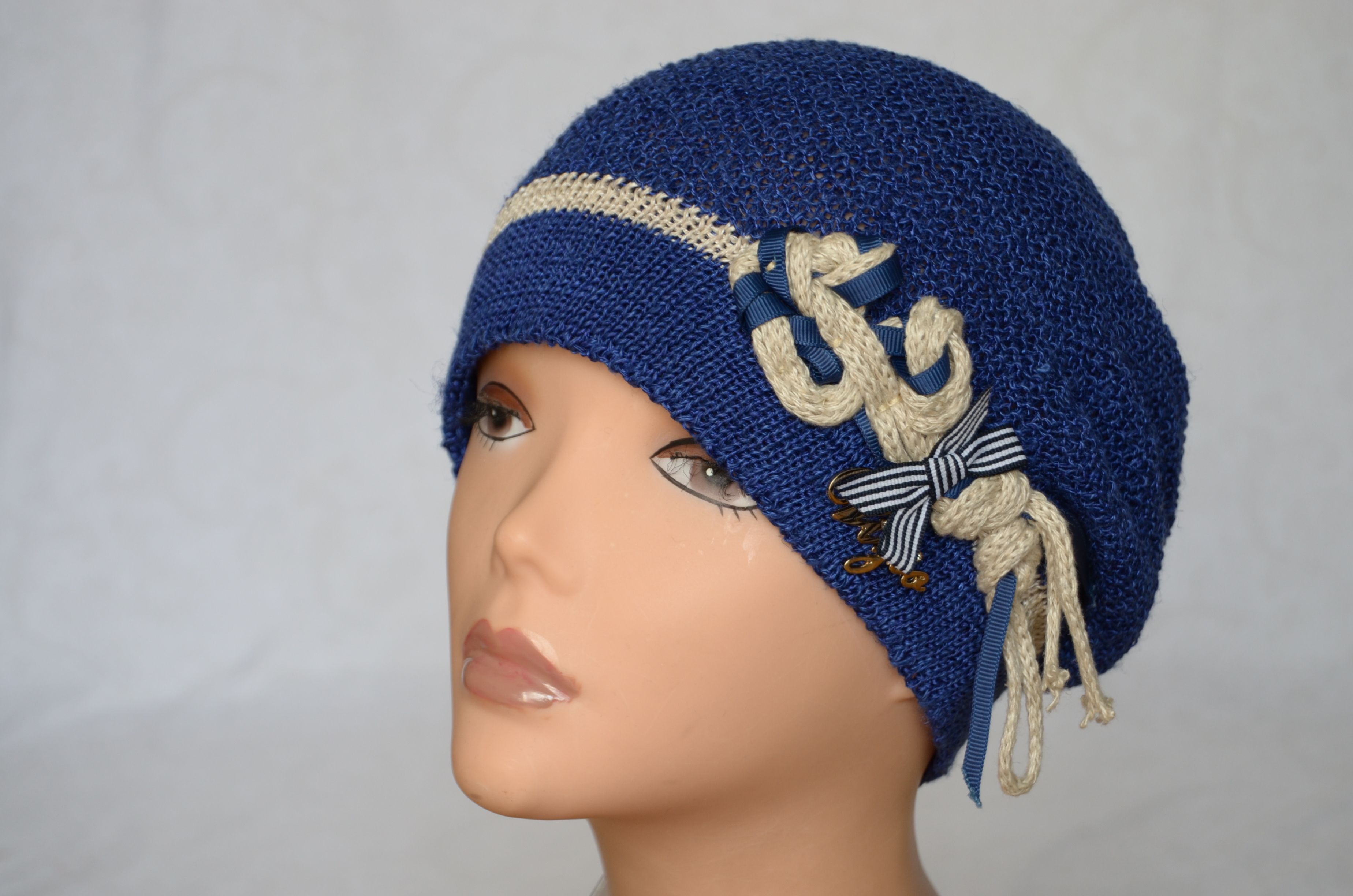 Льняной берет вязаный для женщин итальянского производителя женских головных уборов Vizio 2216 синего цвета коллекция беретов и шапок из льна