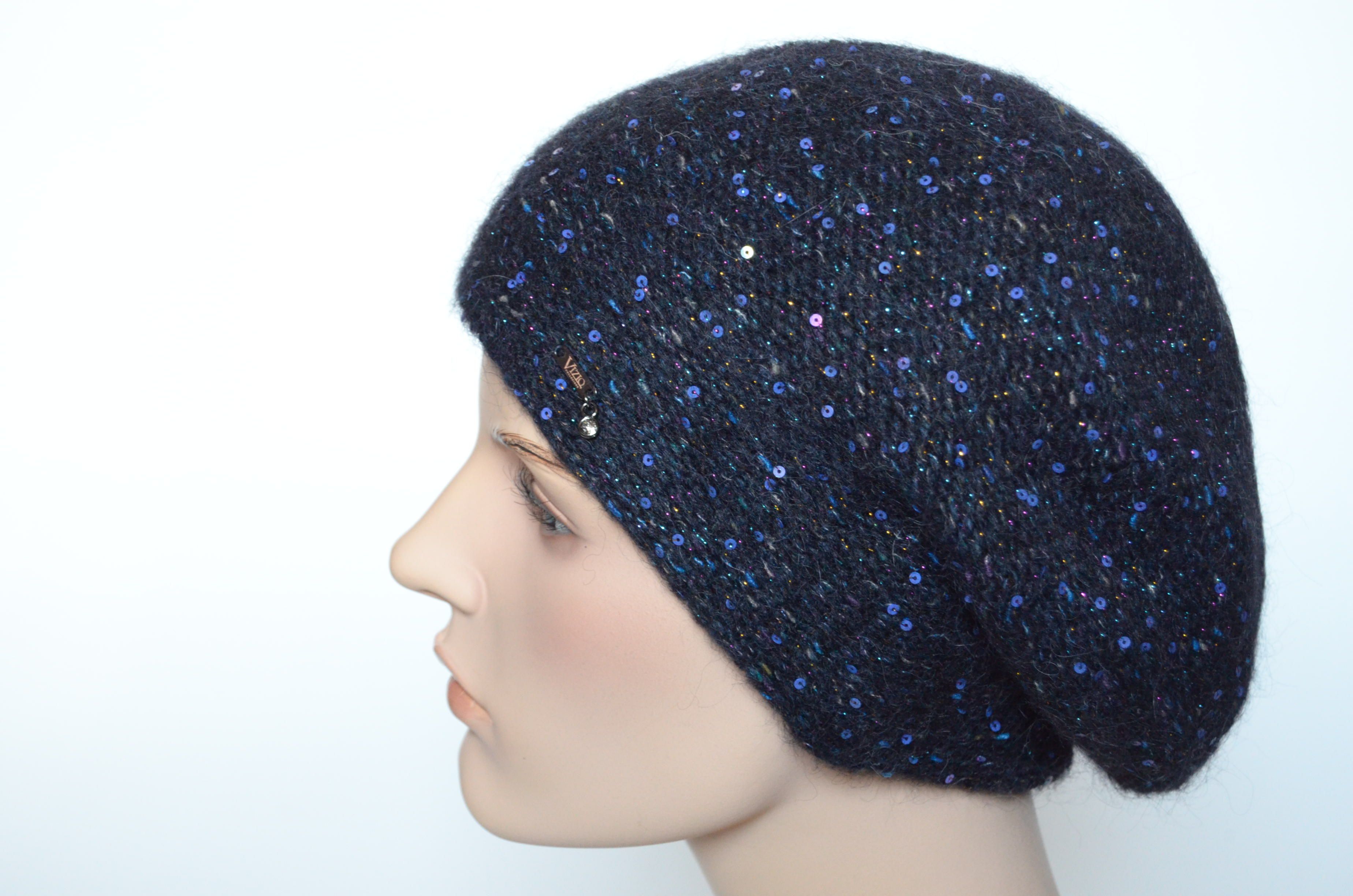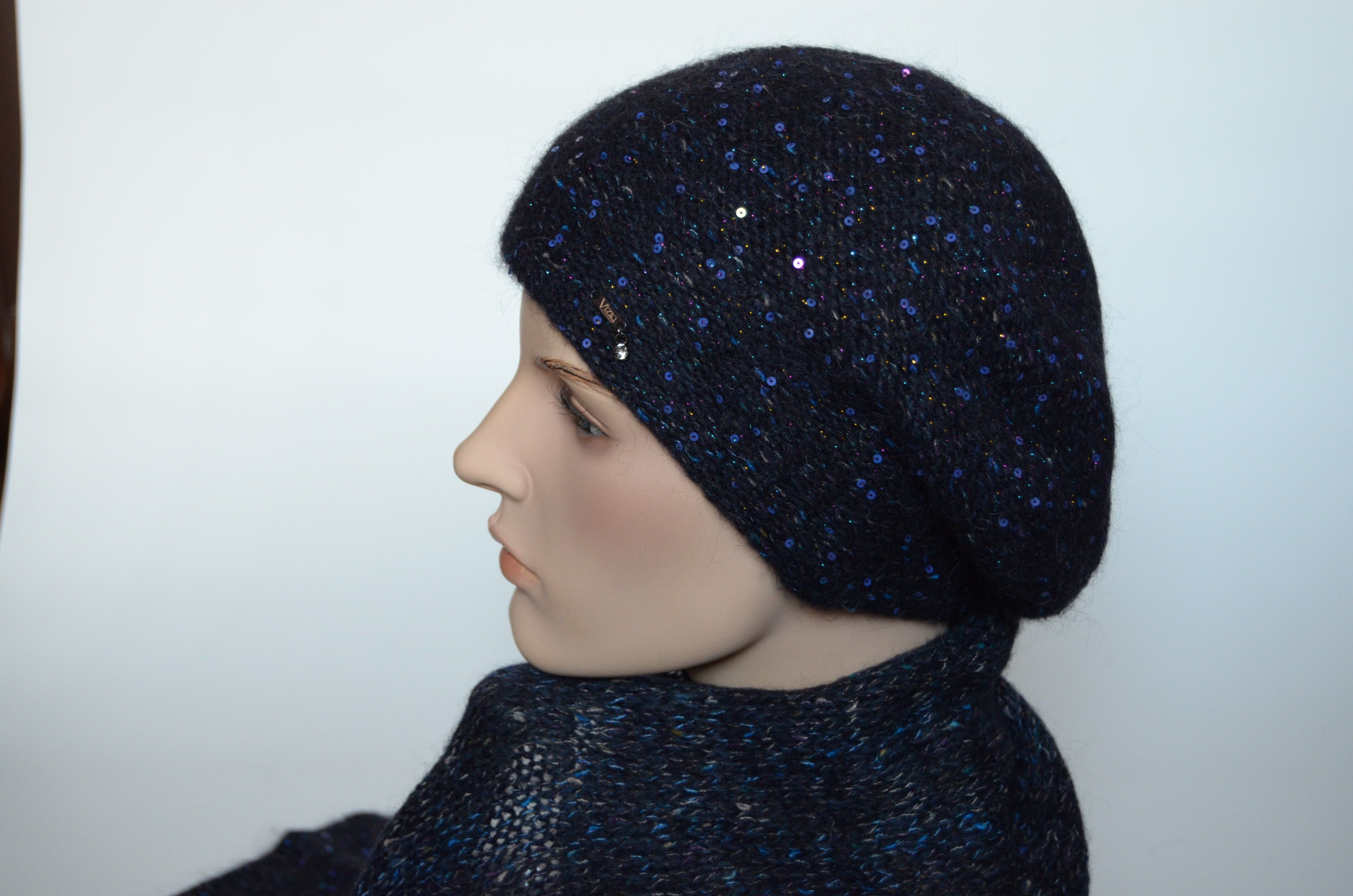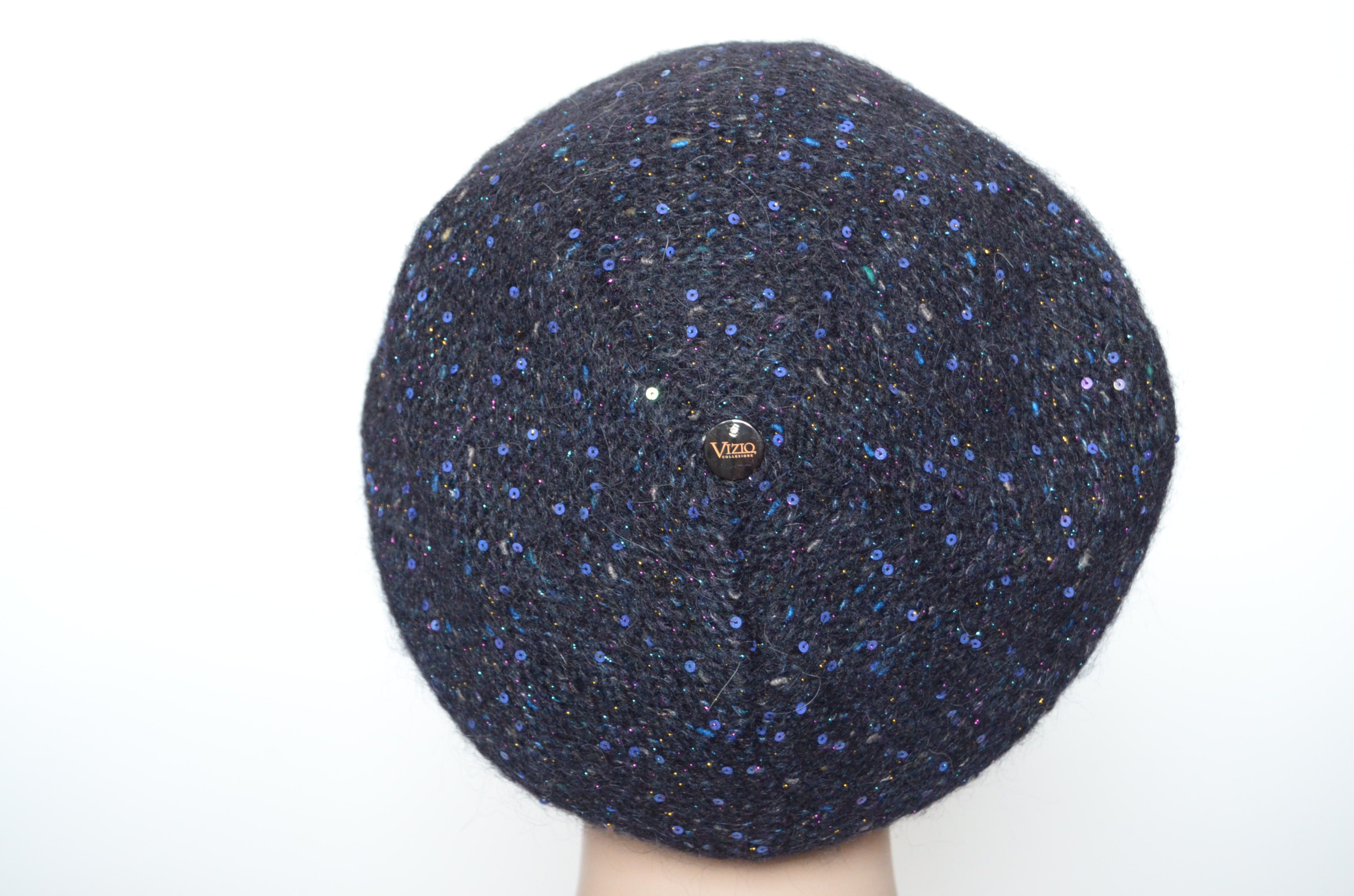 Вязаный меланжевый берет синего цвета с пайетками зима 2022 - 2023 Vizio Италия 6926 ( 8023) купить в магазине итальянских женских шапок и беретов в Москве и с доставкой по России