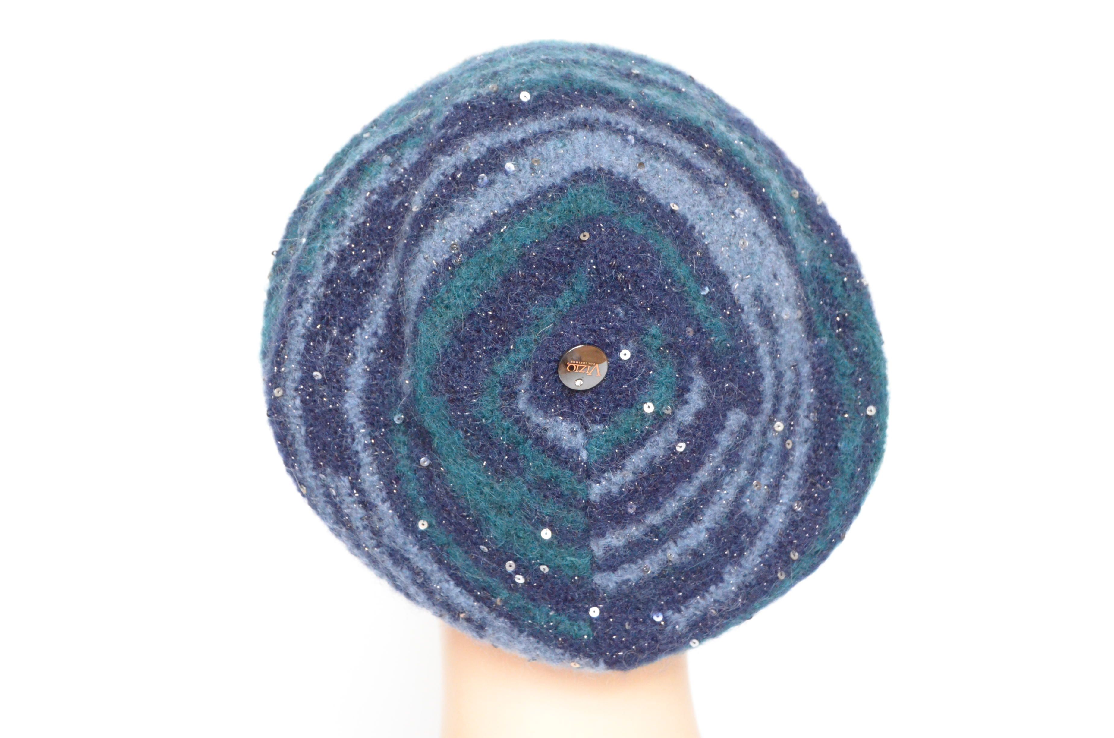 Вязаный женский берет синего цвета с пайетками Vizio Италия 8066 В зимний берет итальянского производителя Визио осень - зима 2022 - 2023