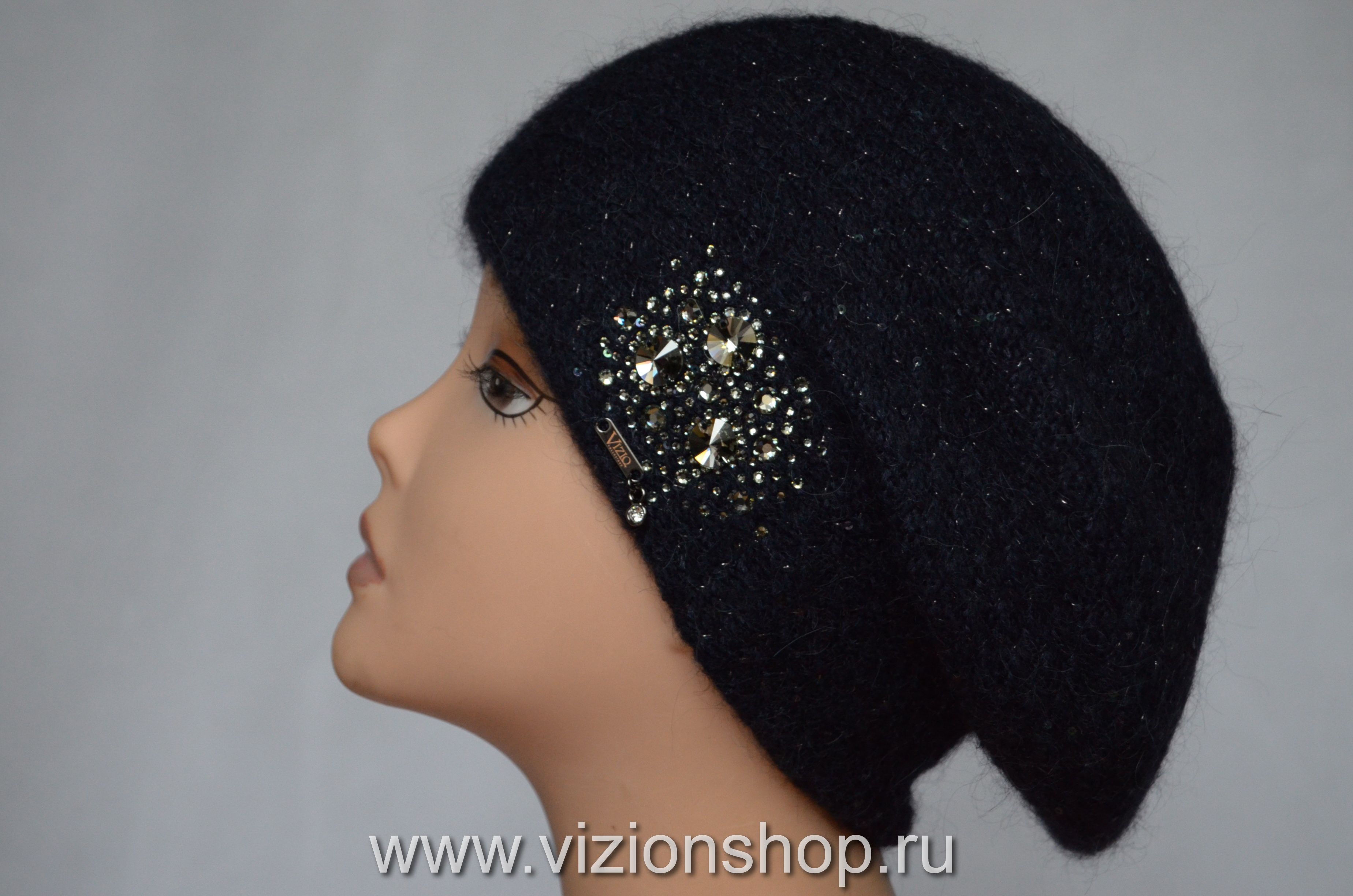 Вязаный итальянский берет синего цвета с украшениями для женщин зима 2019 - 2020 Vizio Италия 6465 коллекция женских беретов и шапок Италии зима 2020 купить в интернет магазине итальянских вязаных головных уборов для женщин Москва и Россия