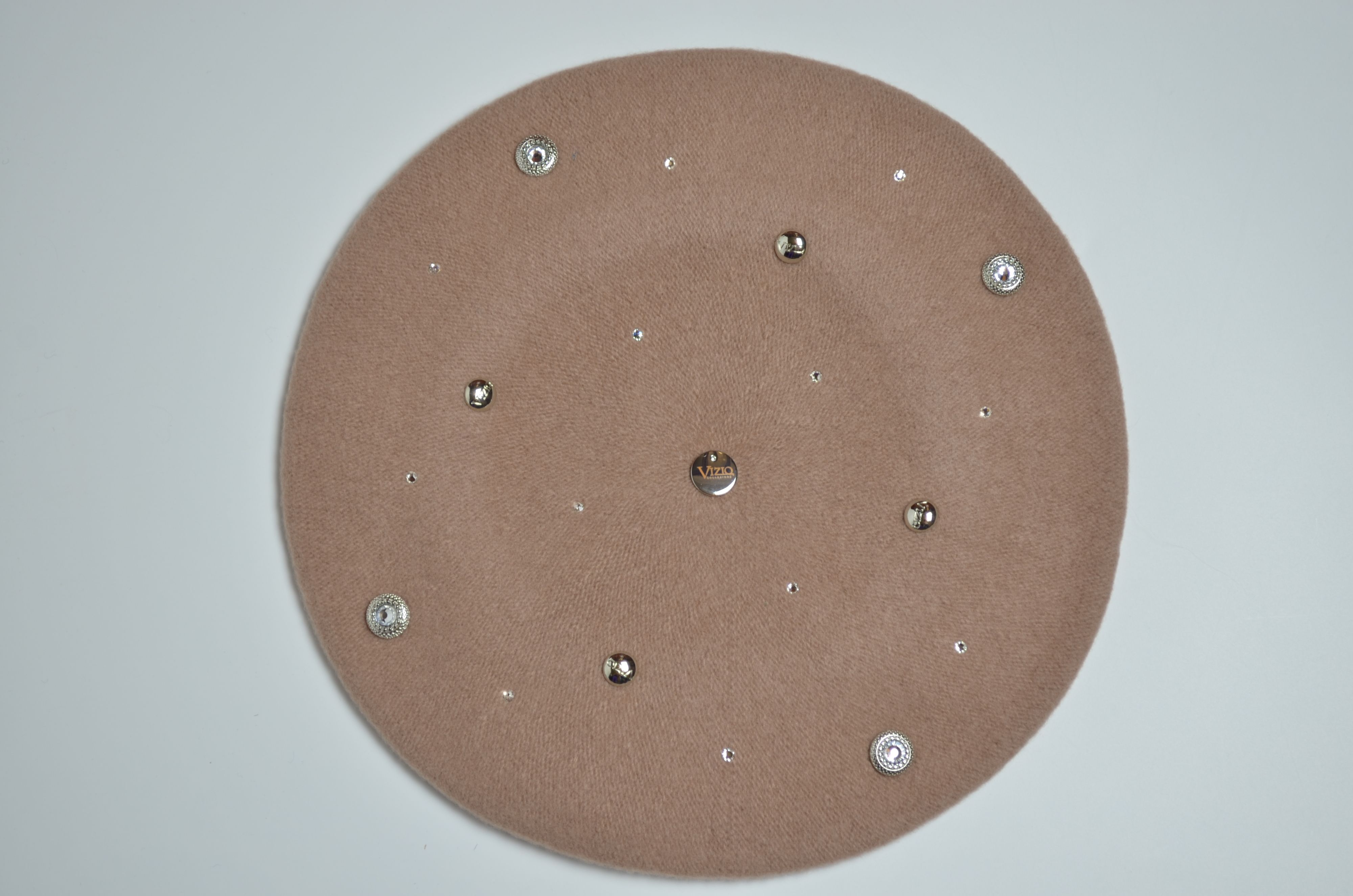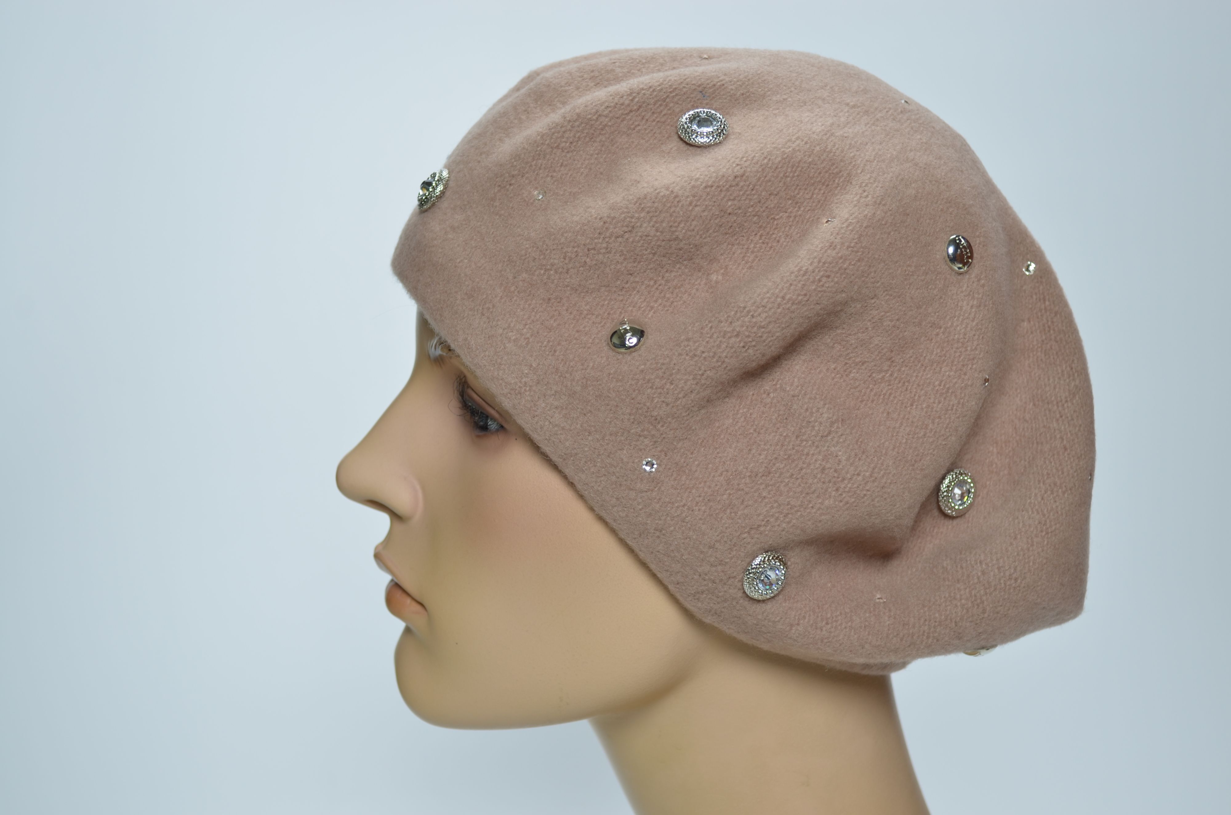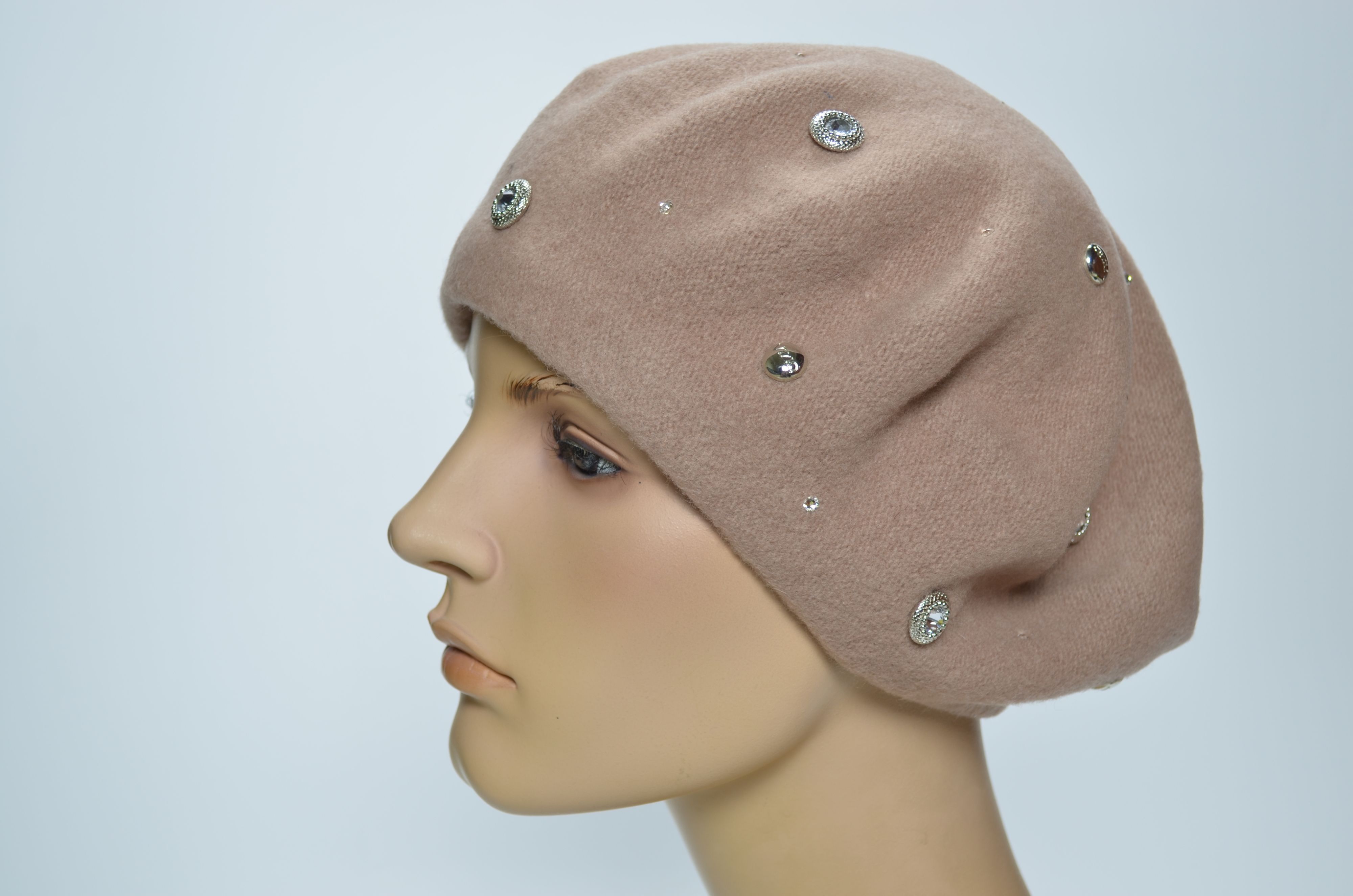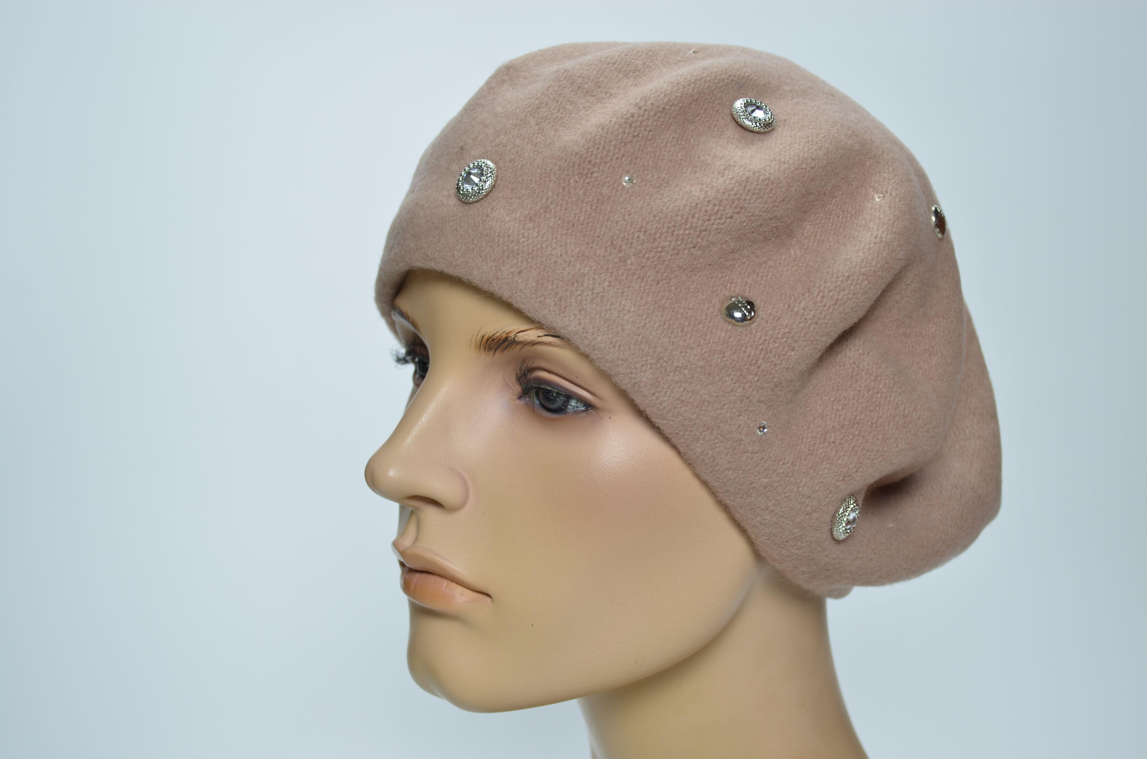 Горчичный светло - коричневый берет фетровый со стразами для женщин