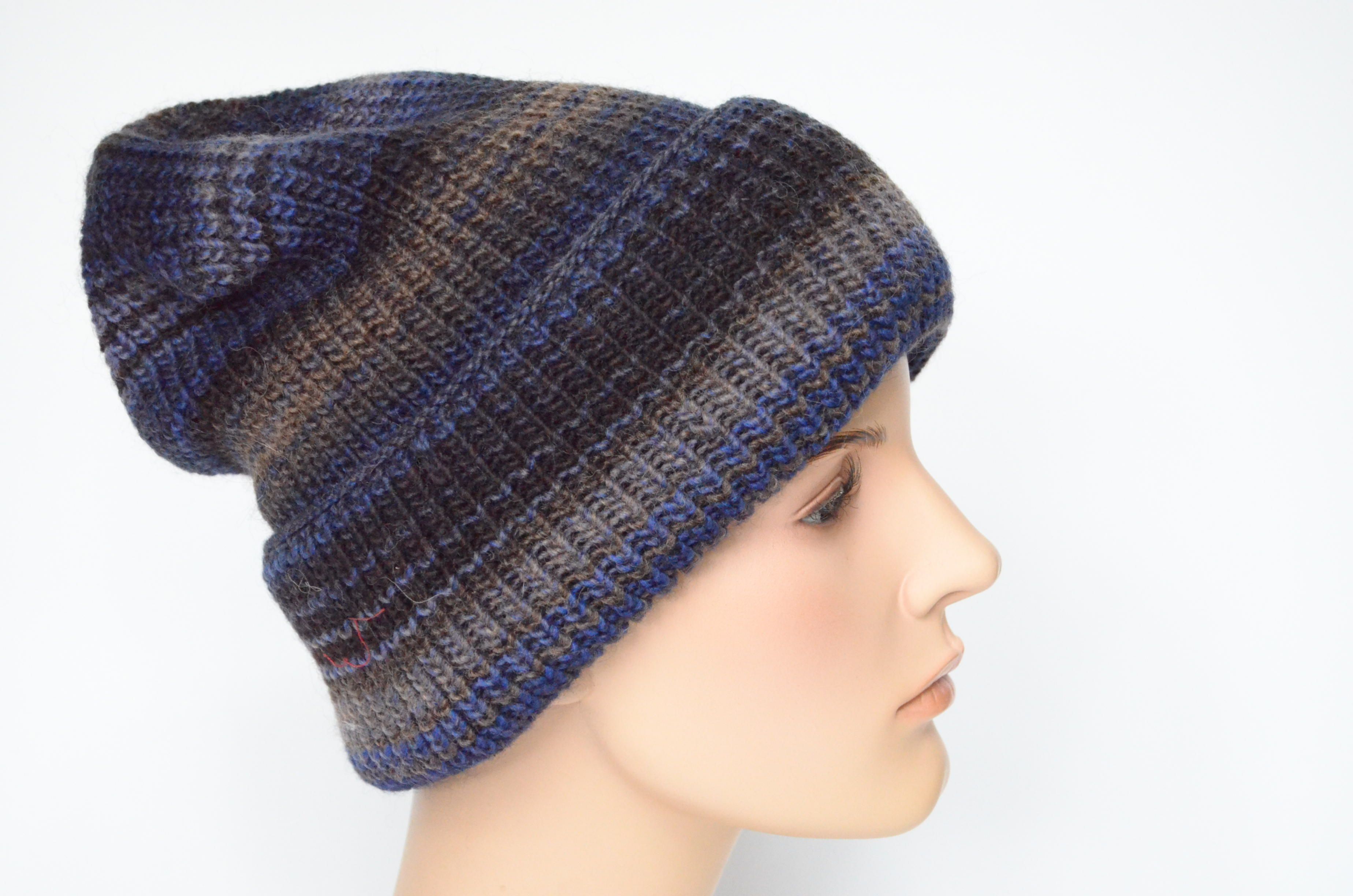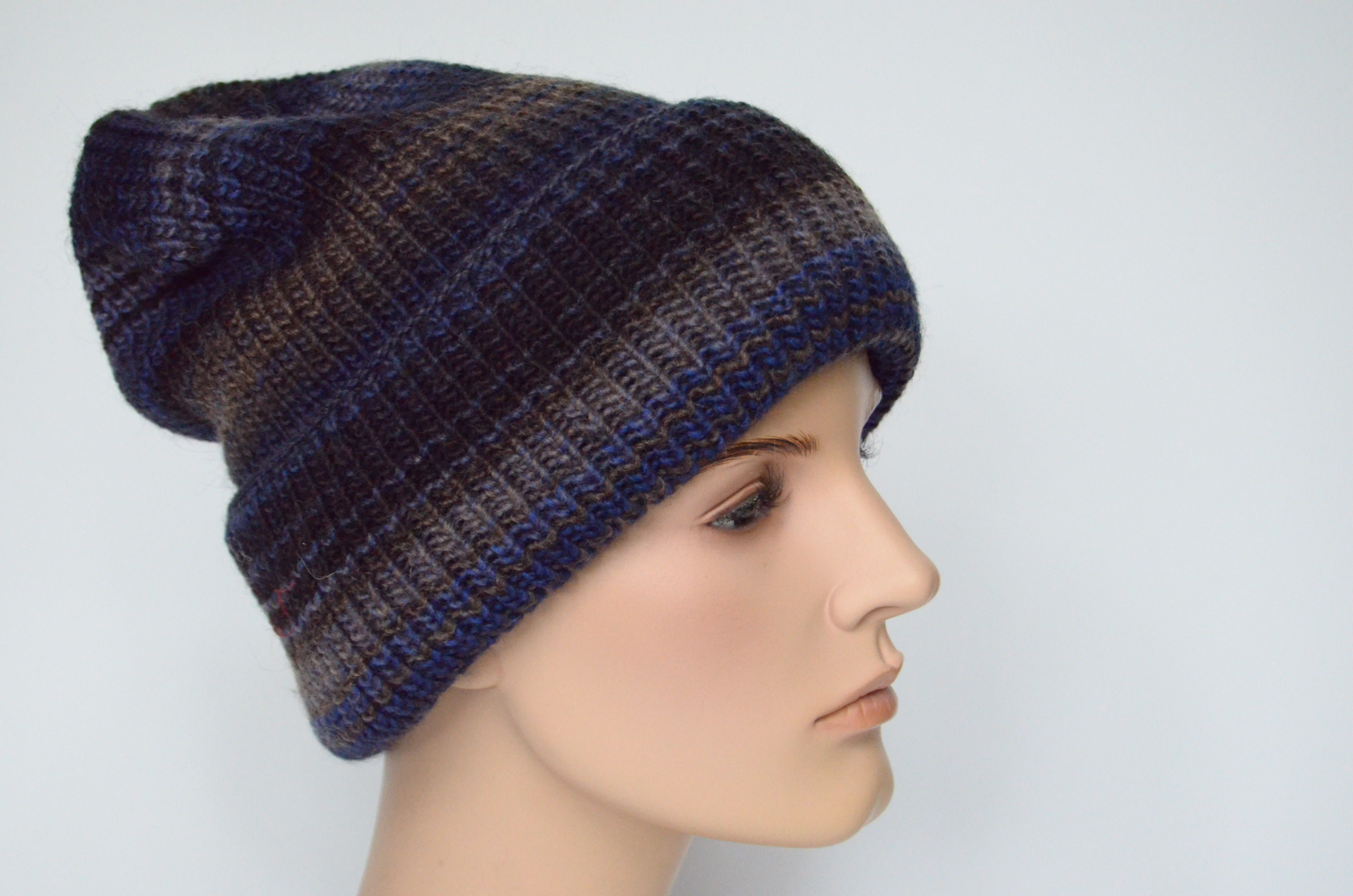 Вязаная женская темносиняя шапка с отворотом двойная с вязаным подкладом