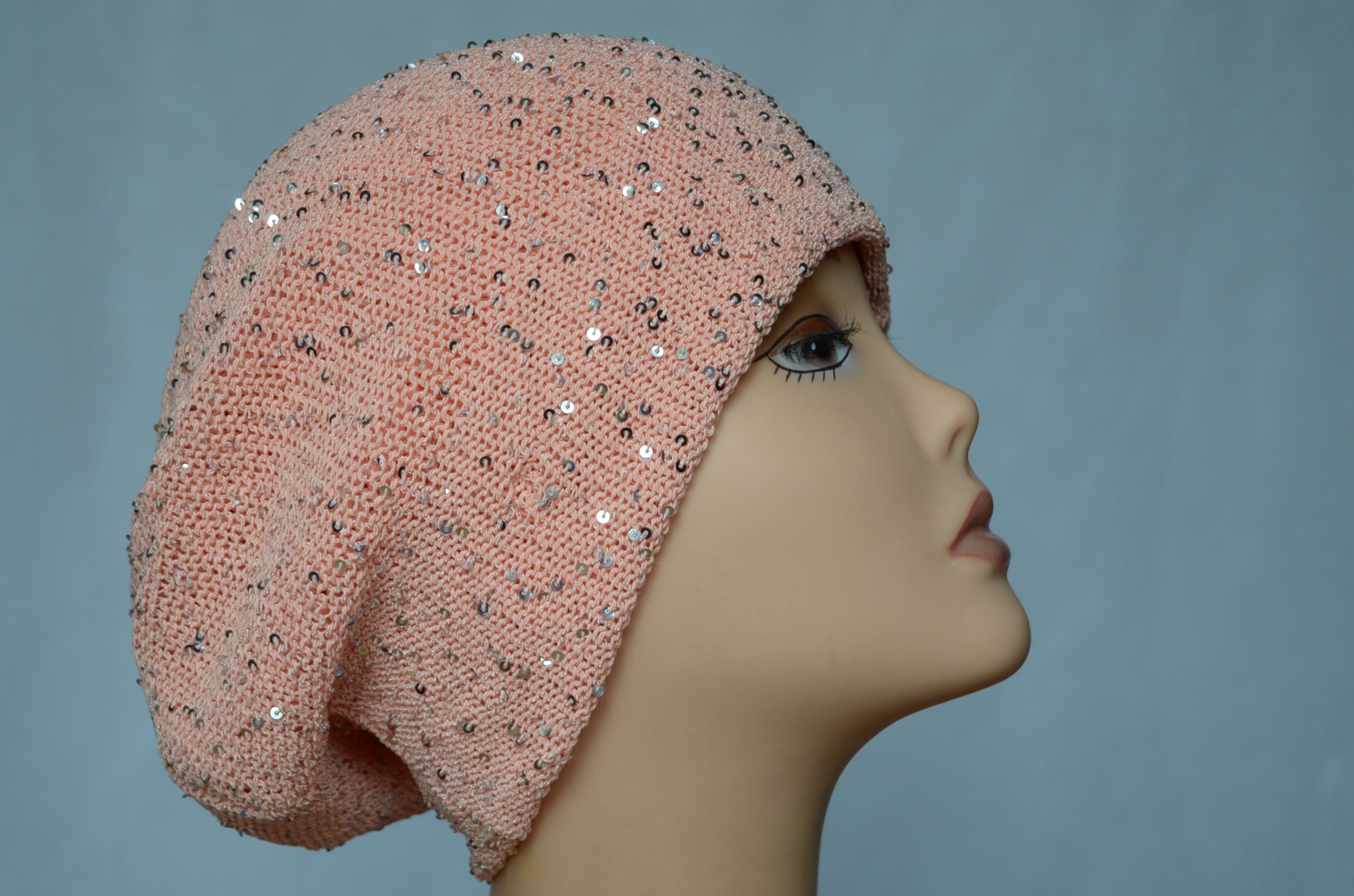 Берет весенний с пайетками вязаный Италия Vizio S A 4 персиковый из новой коллекции беретов весна - лето