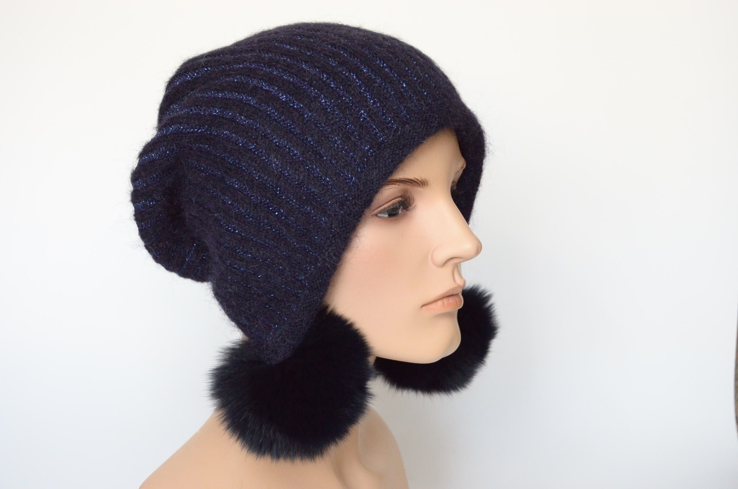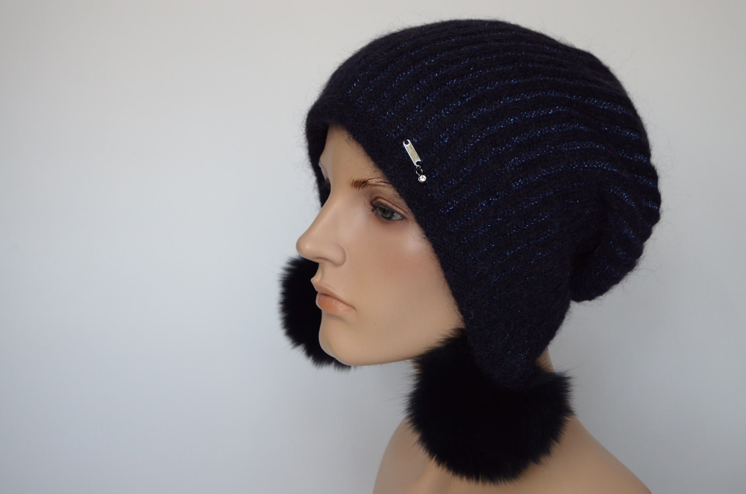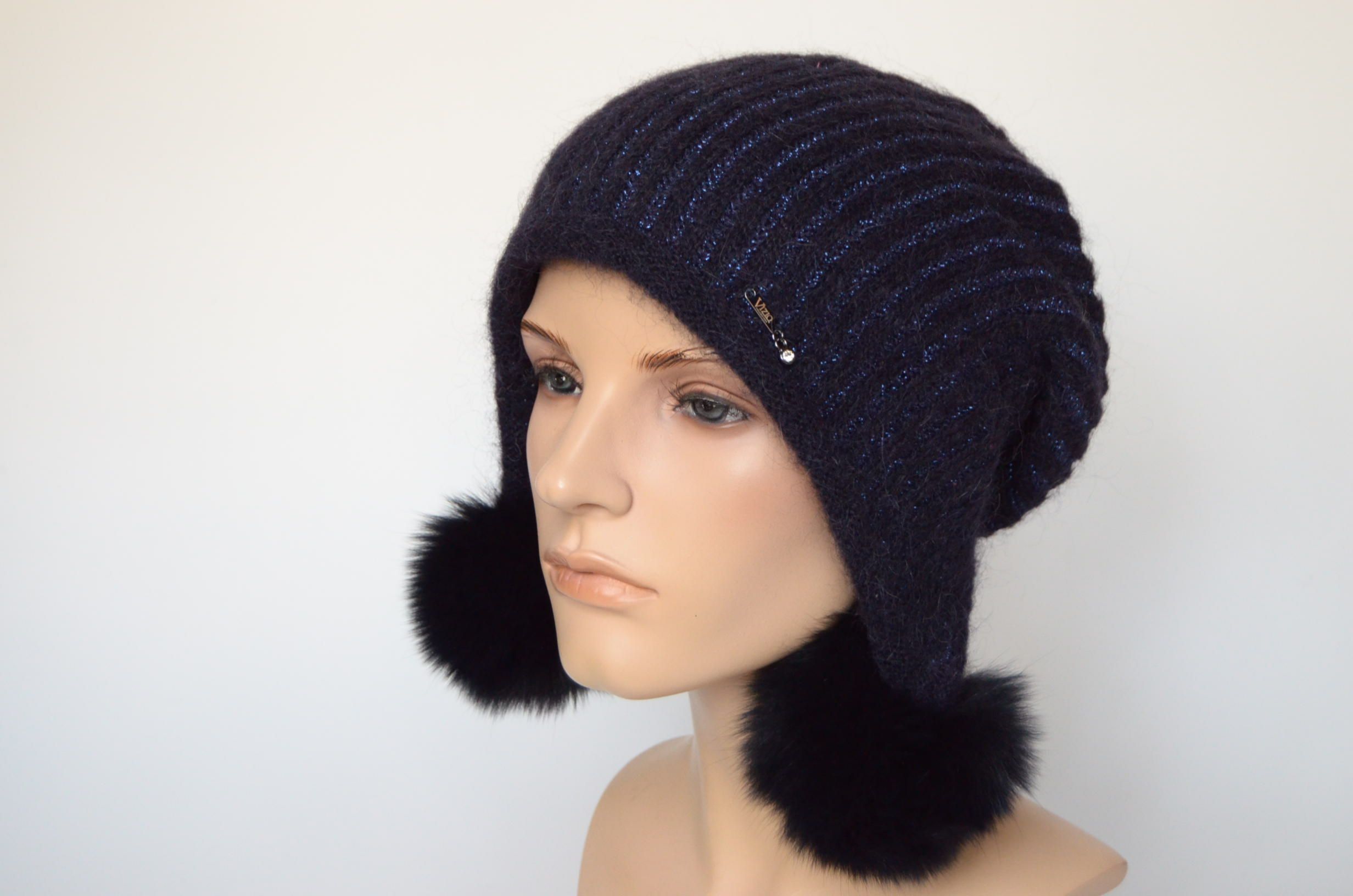 Купить синюю вязаную шапку ушанку с помпонами зима 2023 - 2024 Визио Италия Вы можете в интернет магазине вязаных головных уборов для женщин