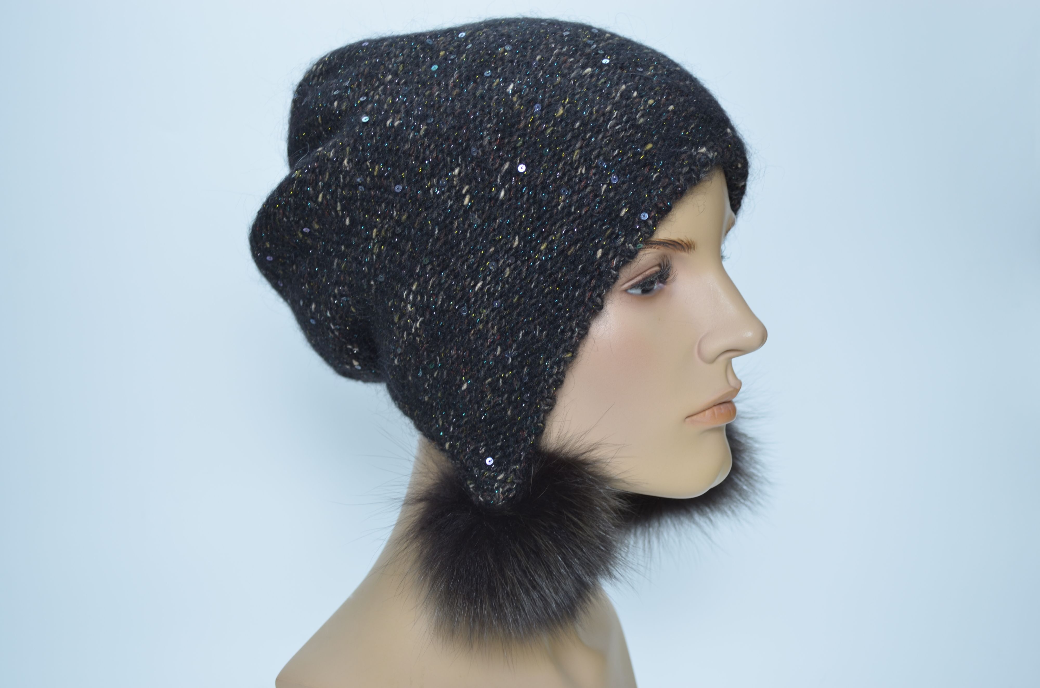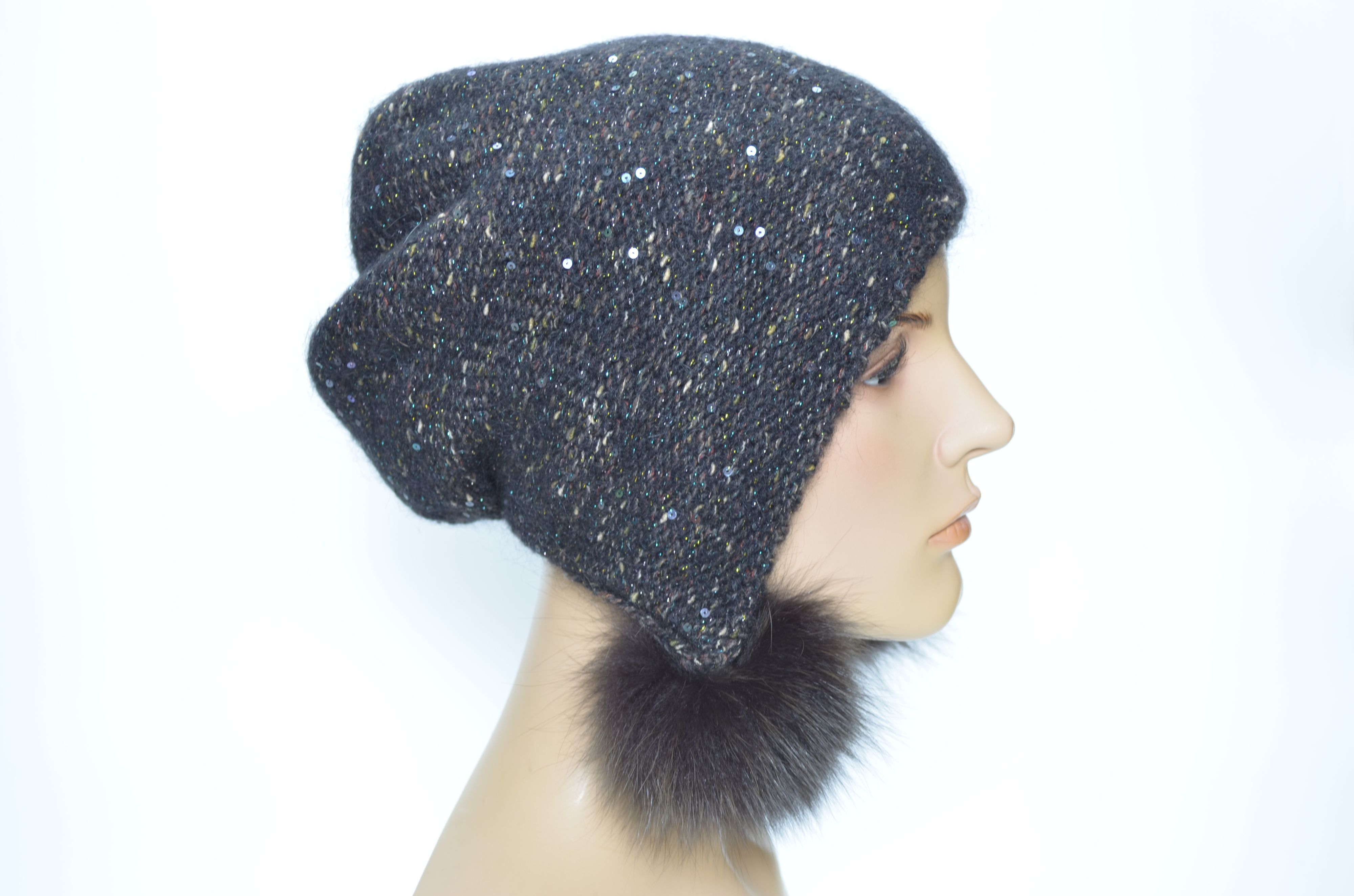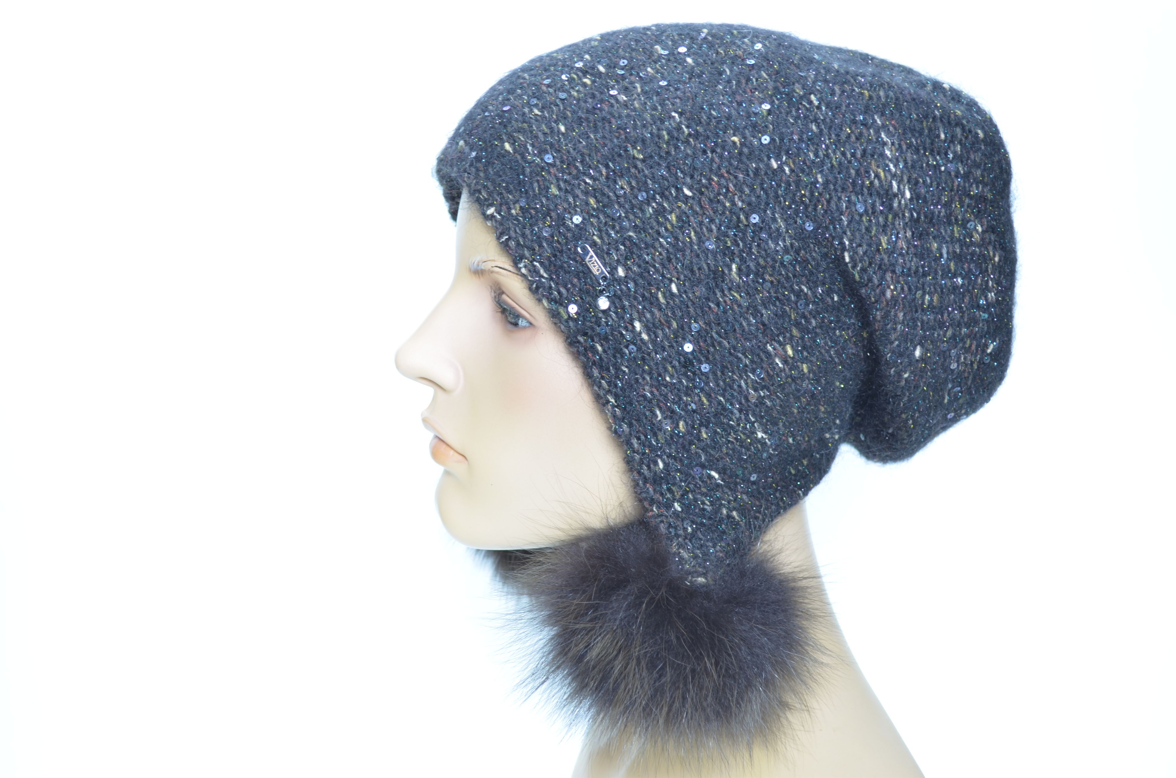 Вязаная разноцветная меланжевая коричневая шапка ушанка с помпонами и пайетками женская зима 2024 - 2025 Vizio Италия 1010 коллекция вязаных шапок ушанок Италии для женщин