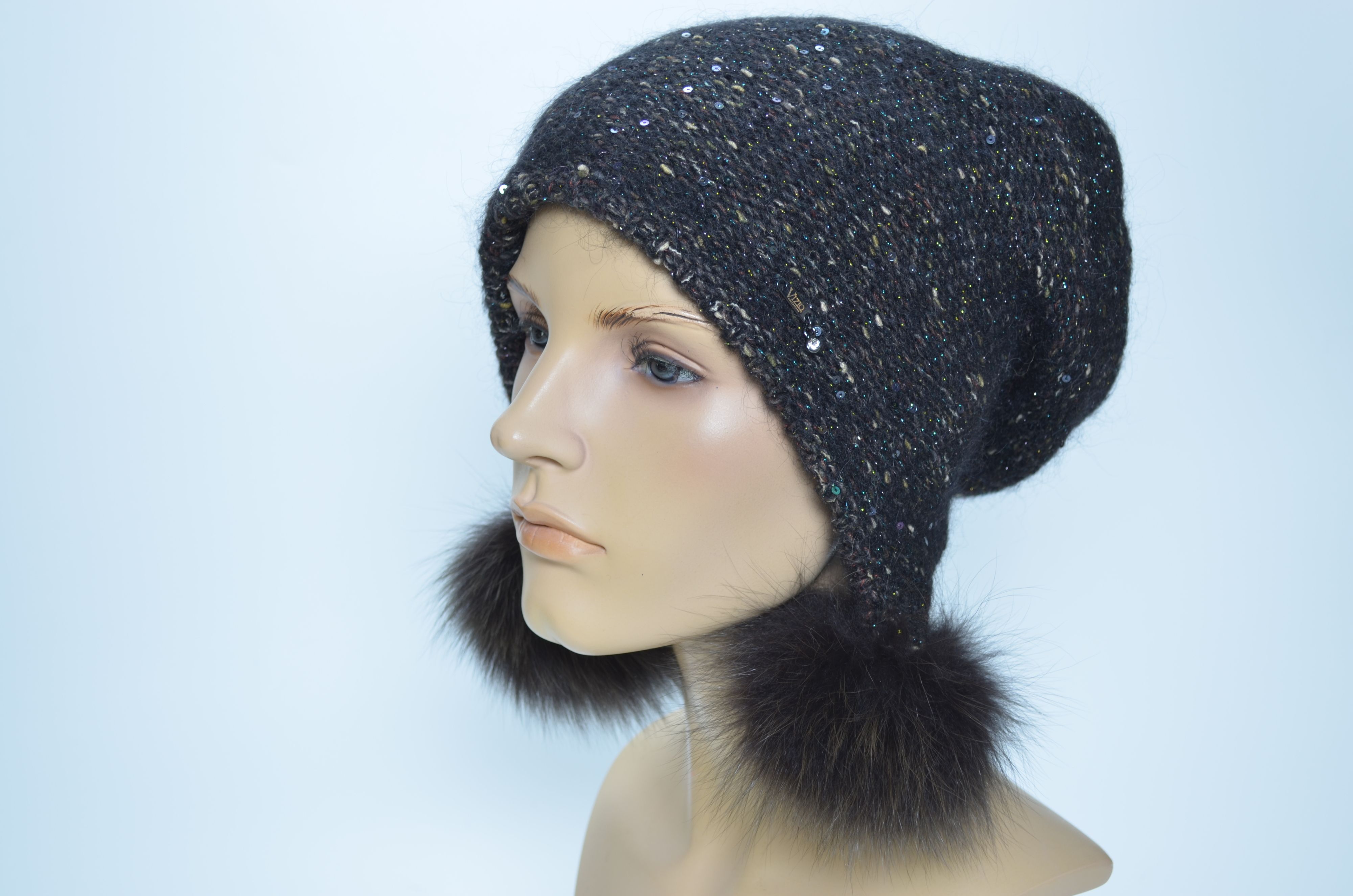 Купить черную вязаную шапку ушанку с помпонами зима 2024 - 2025 Визио Италия Вы можете в интернет магазине модных головных уборов для женщин