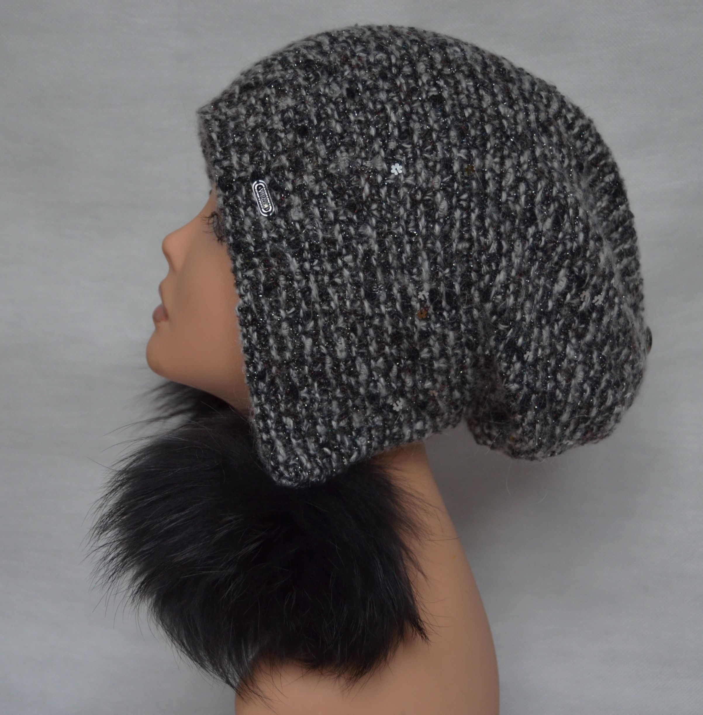 Вязаная белая с черным шапка ушанка из меланжевой пряжи с помпонами и пайетками для женщин зима 2019 Vizio Италия 6147 из коллекции вязаных ушанок от итальянского производителя модных головных уборов Vizio Collezione
