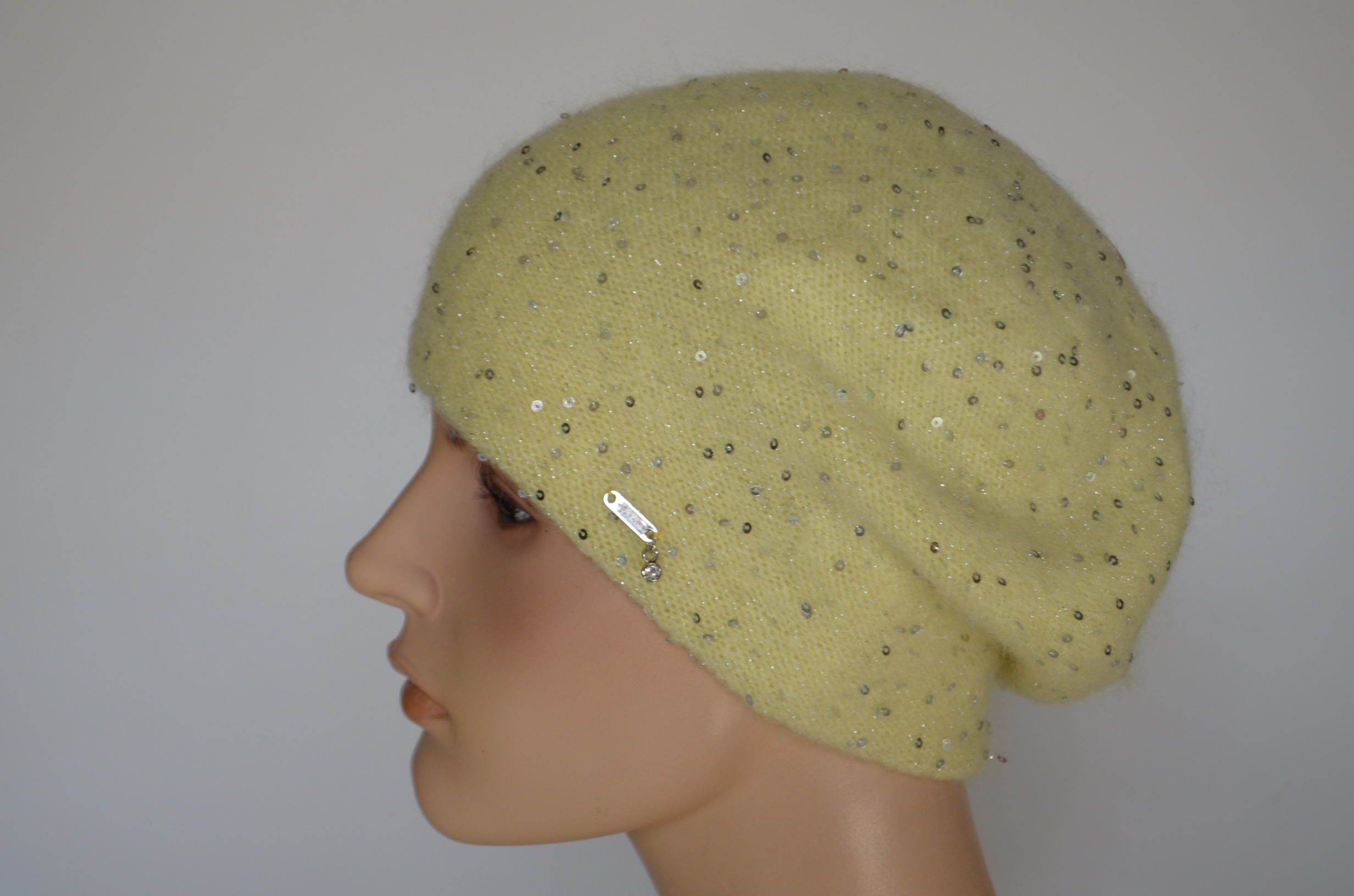 Желтый женский берет вязаный с пайетками на зиму