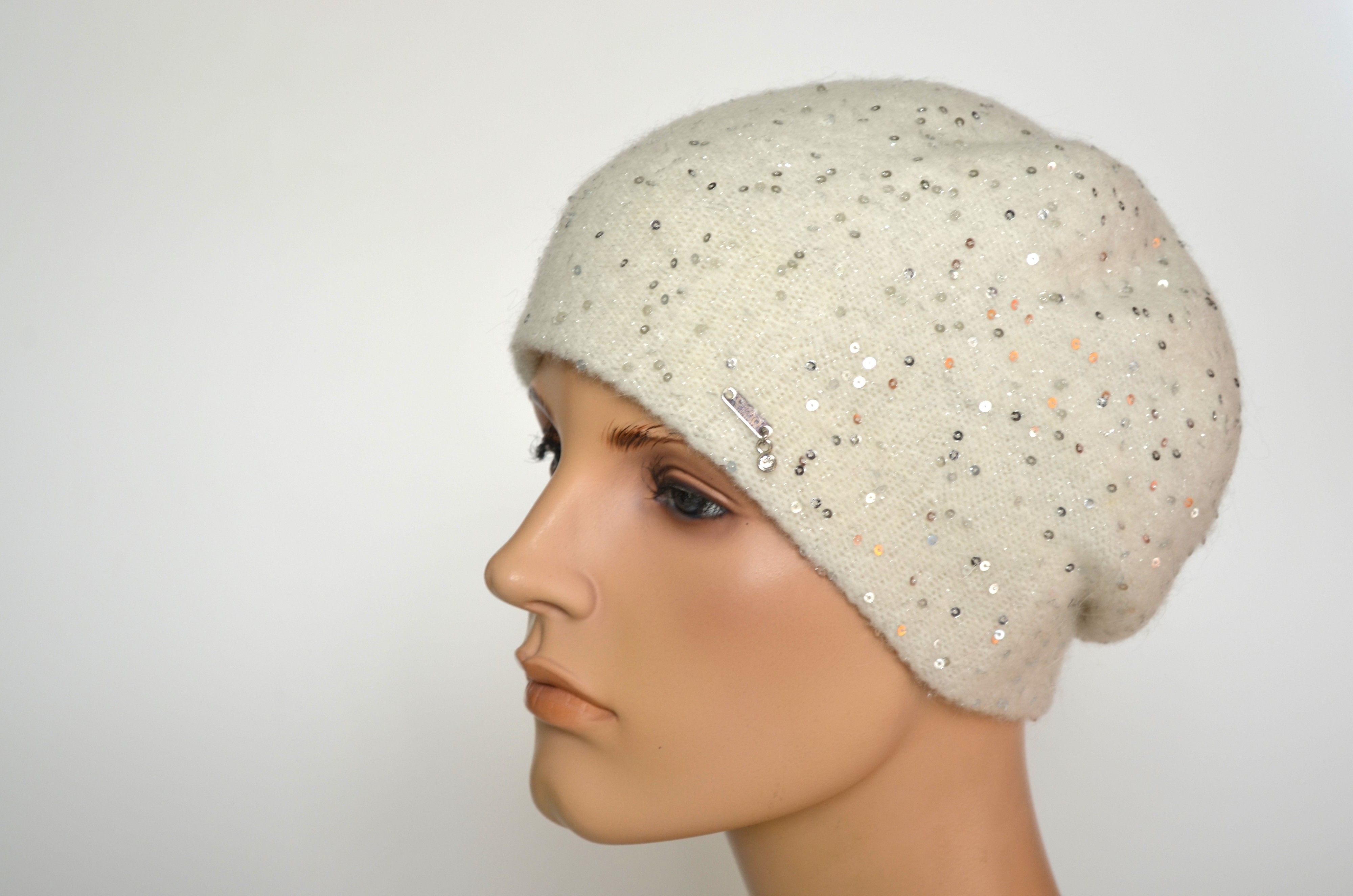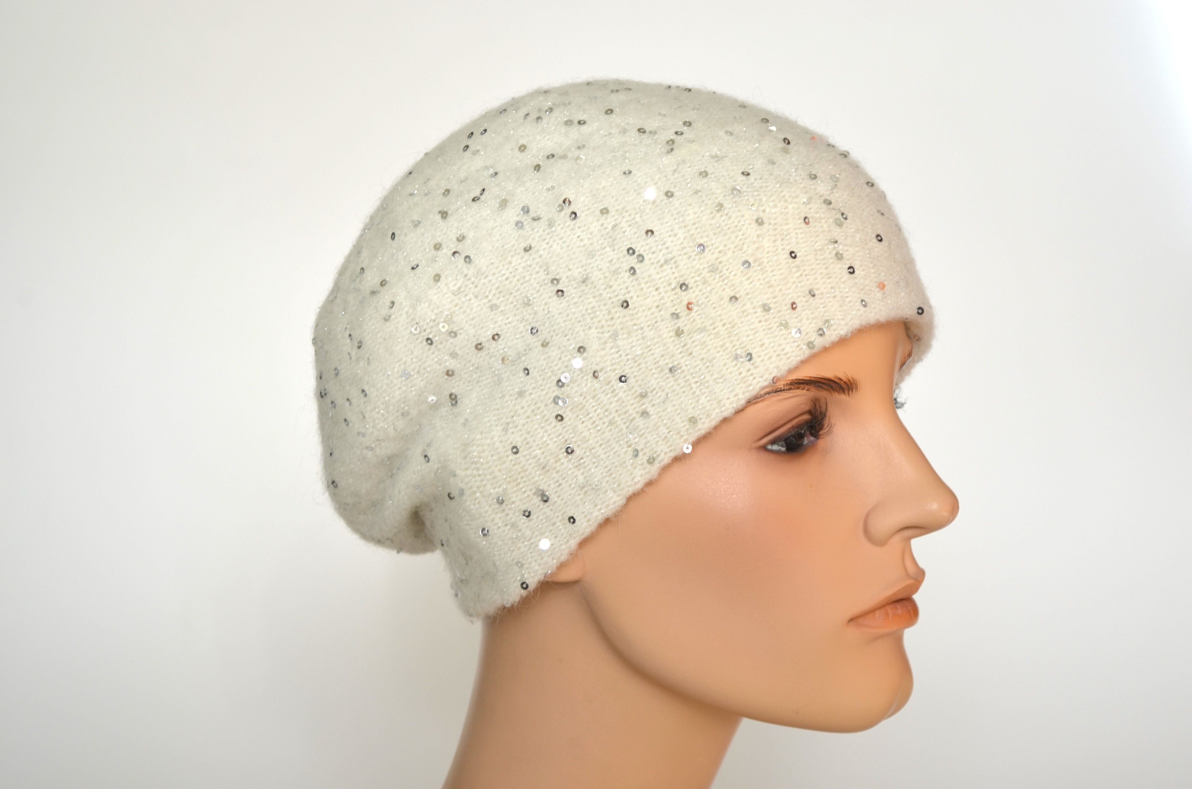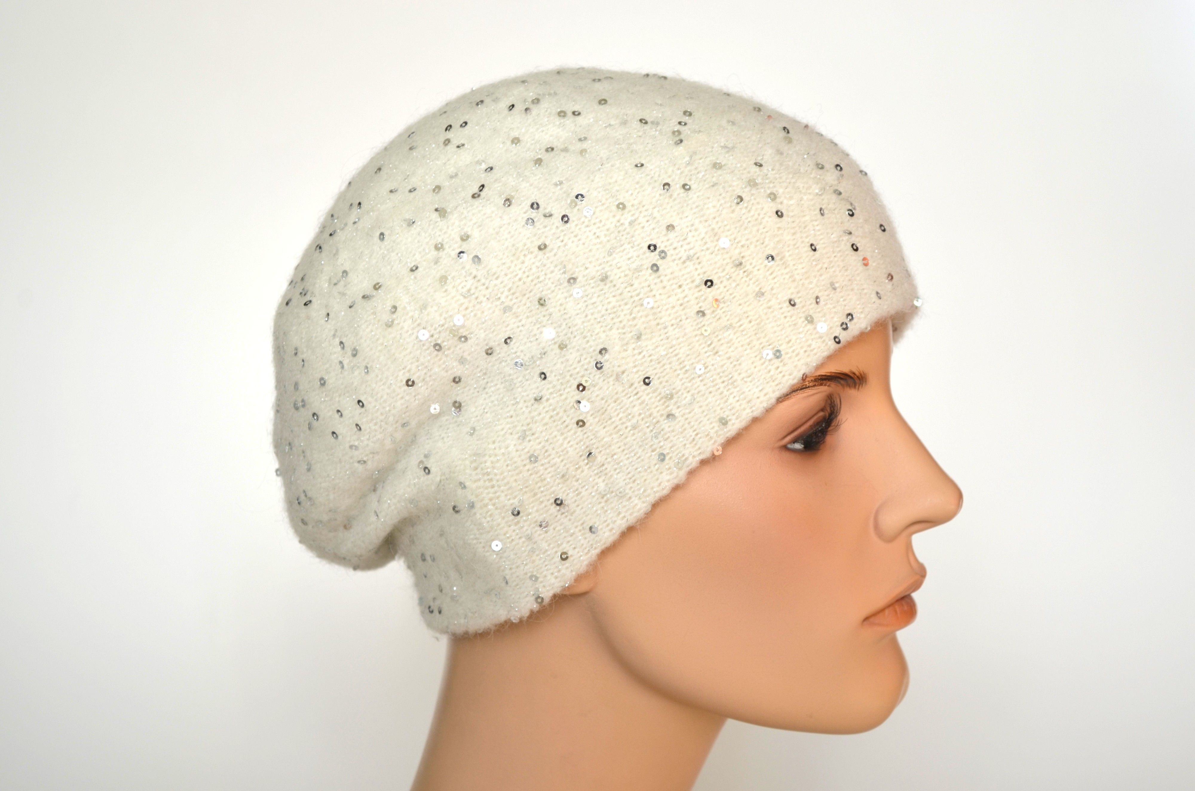 Зимний вязаный берет с пайетками белого цвета женский с вязаным подкладом