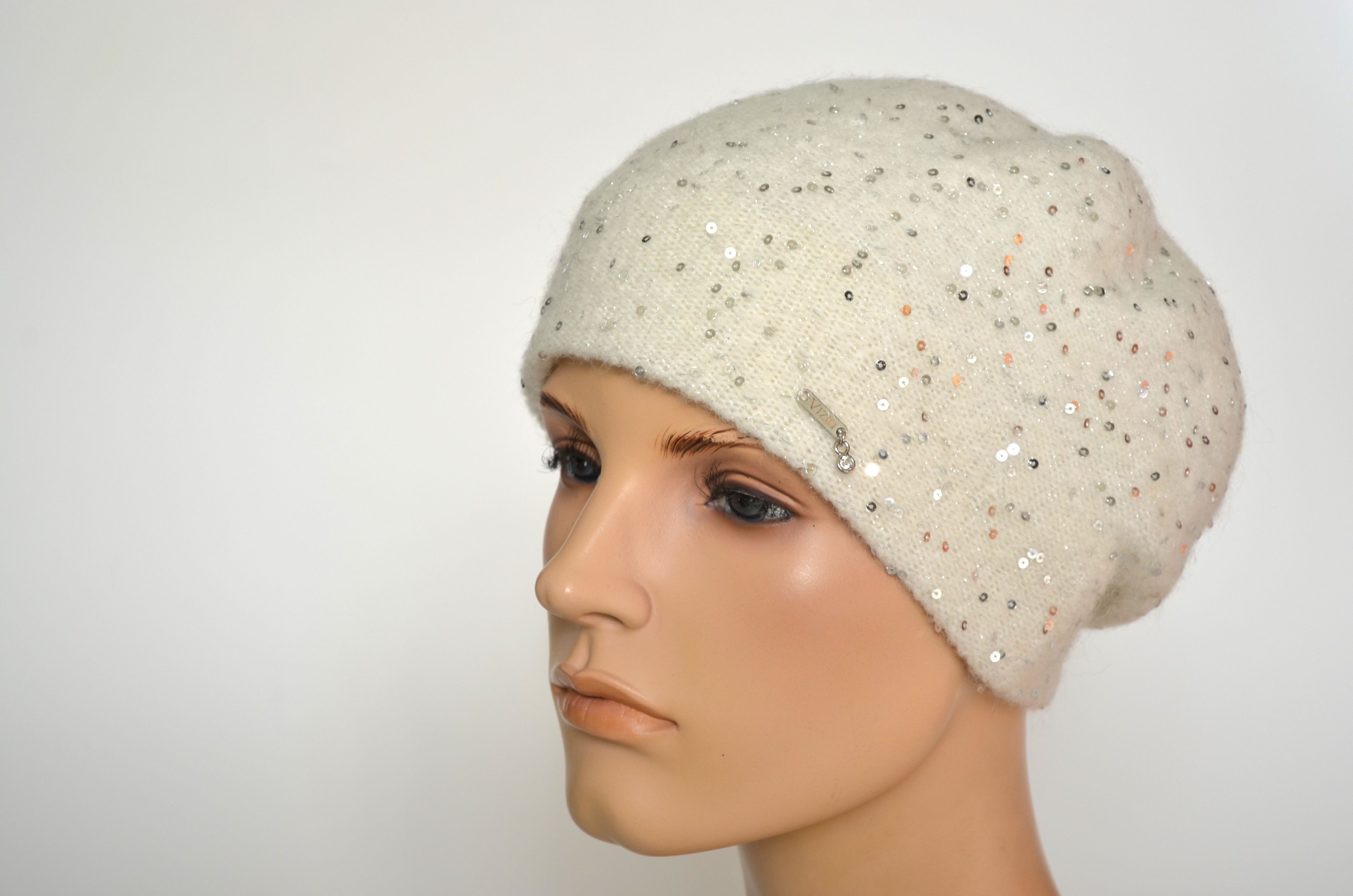 Вязаный зимний белый берет с пайетками для женщин Vizio Италия 1051 B купить в интернет магазине итальянских беретов и шапок Визио с доставкой по России и Москве