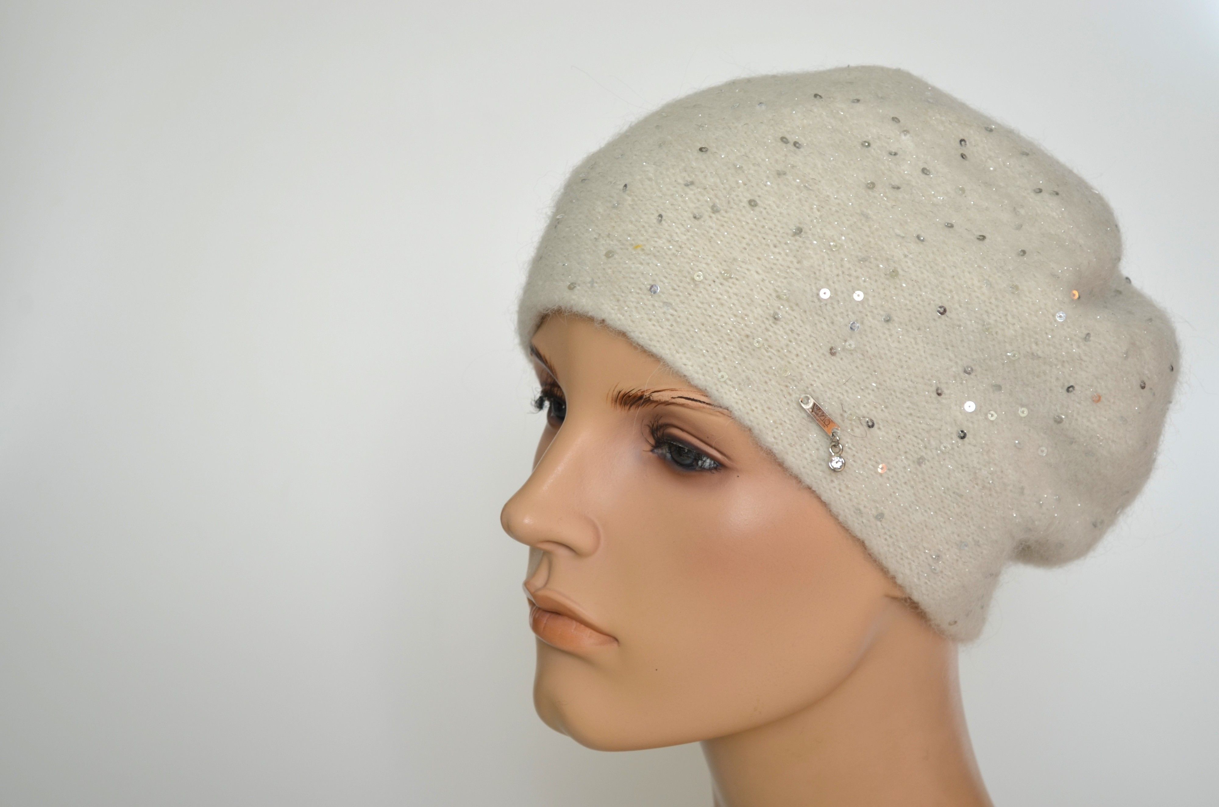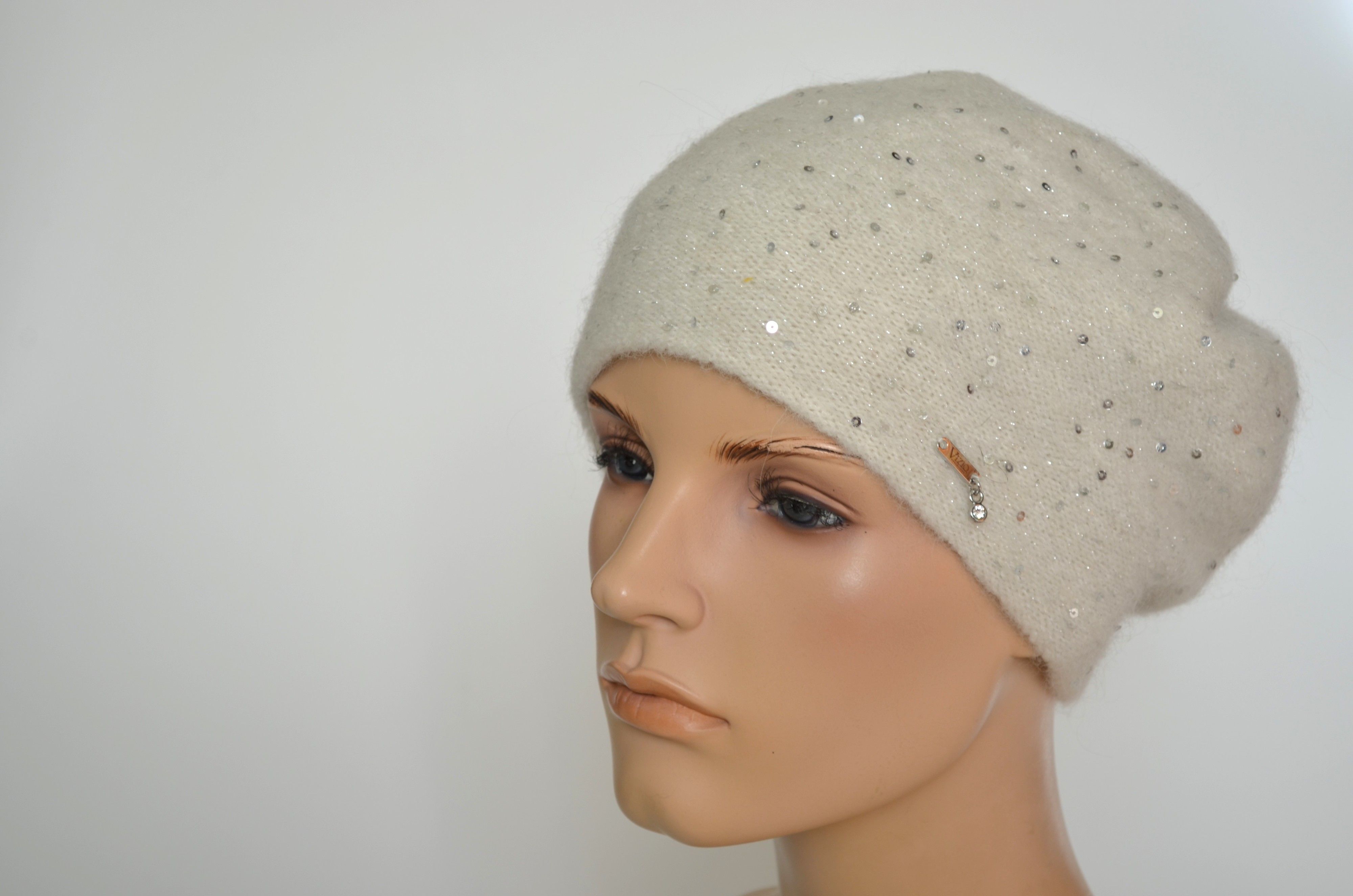 Вязаный зимний белый берет с пайетками женский Vizio Италия 1065 B купить в интернет магазине итальянских беретов и шапок Визио с доставкой по России и Москве