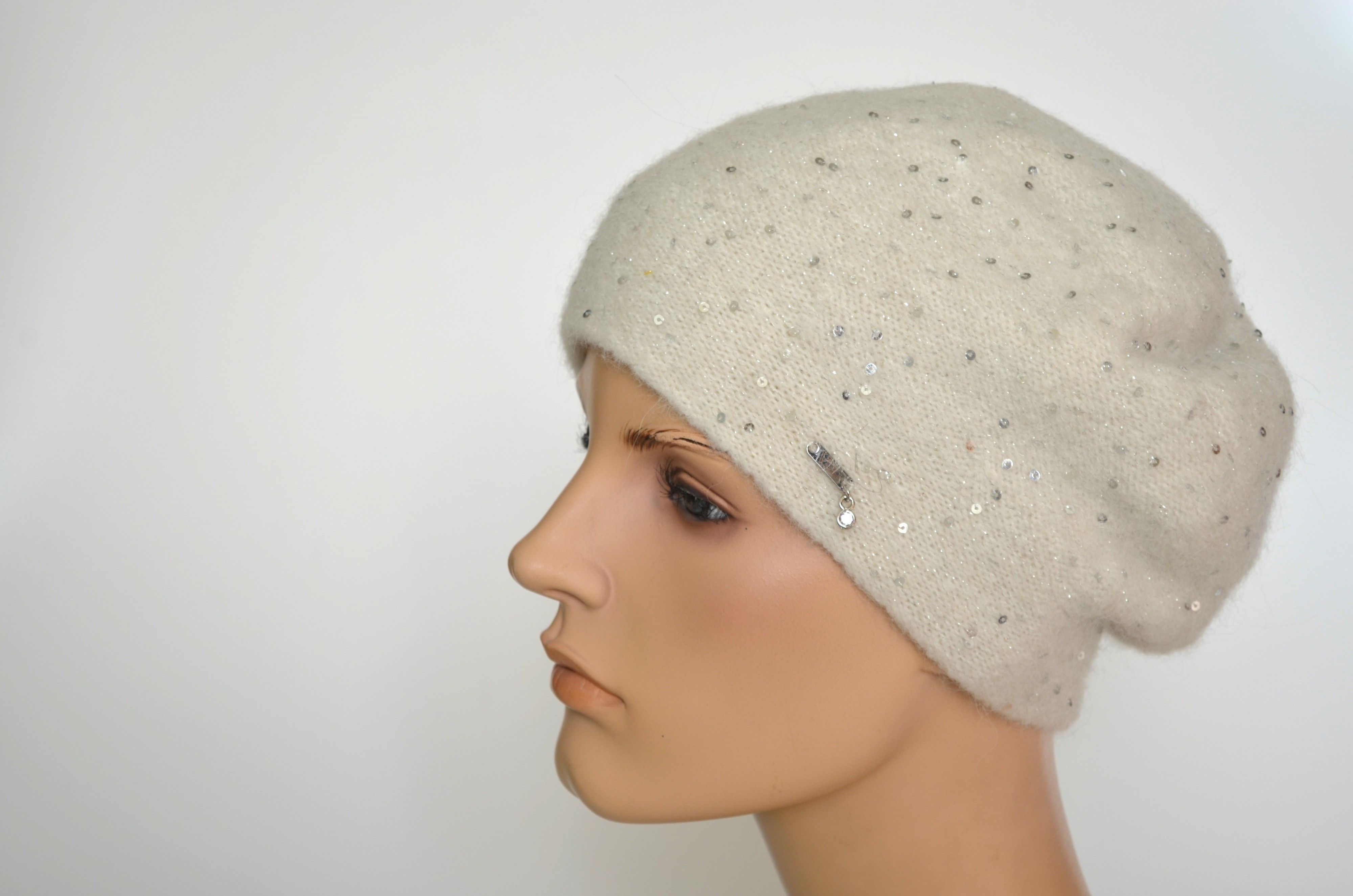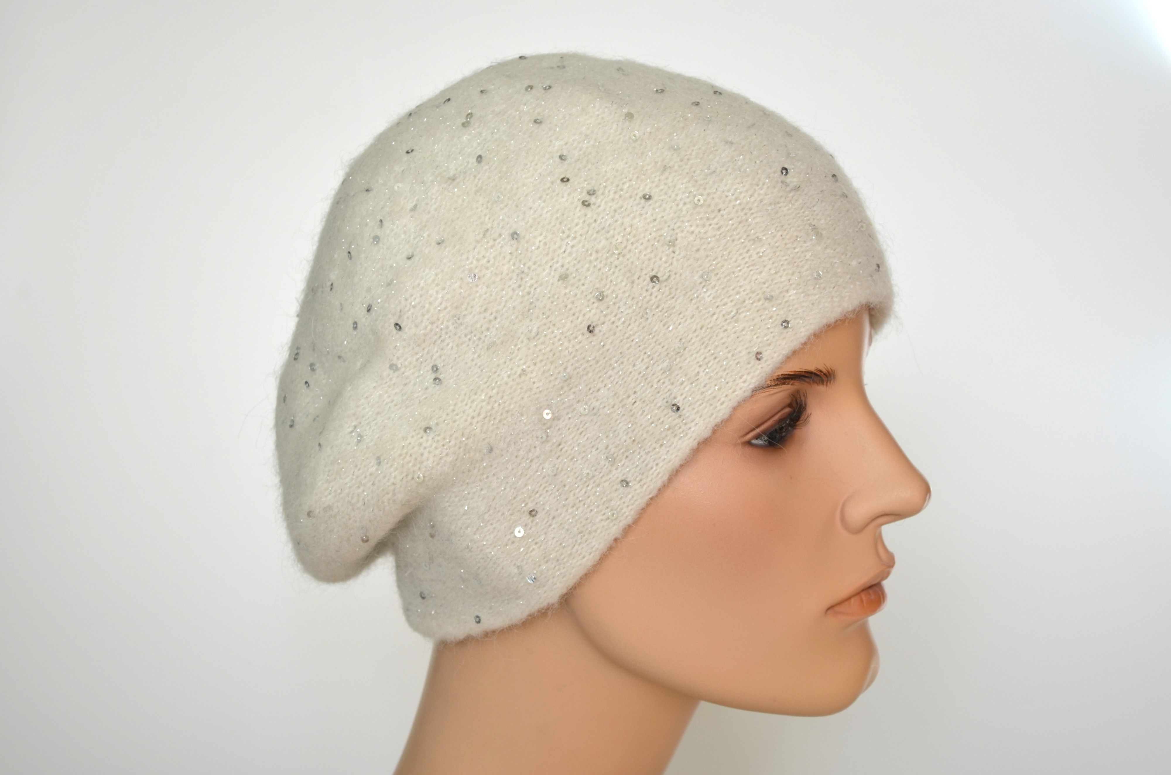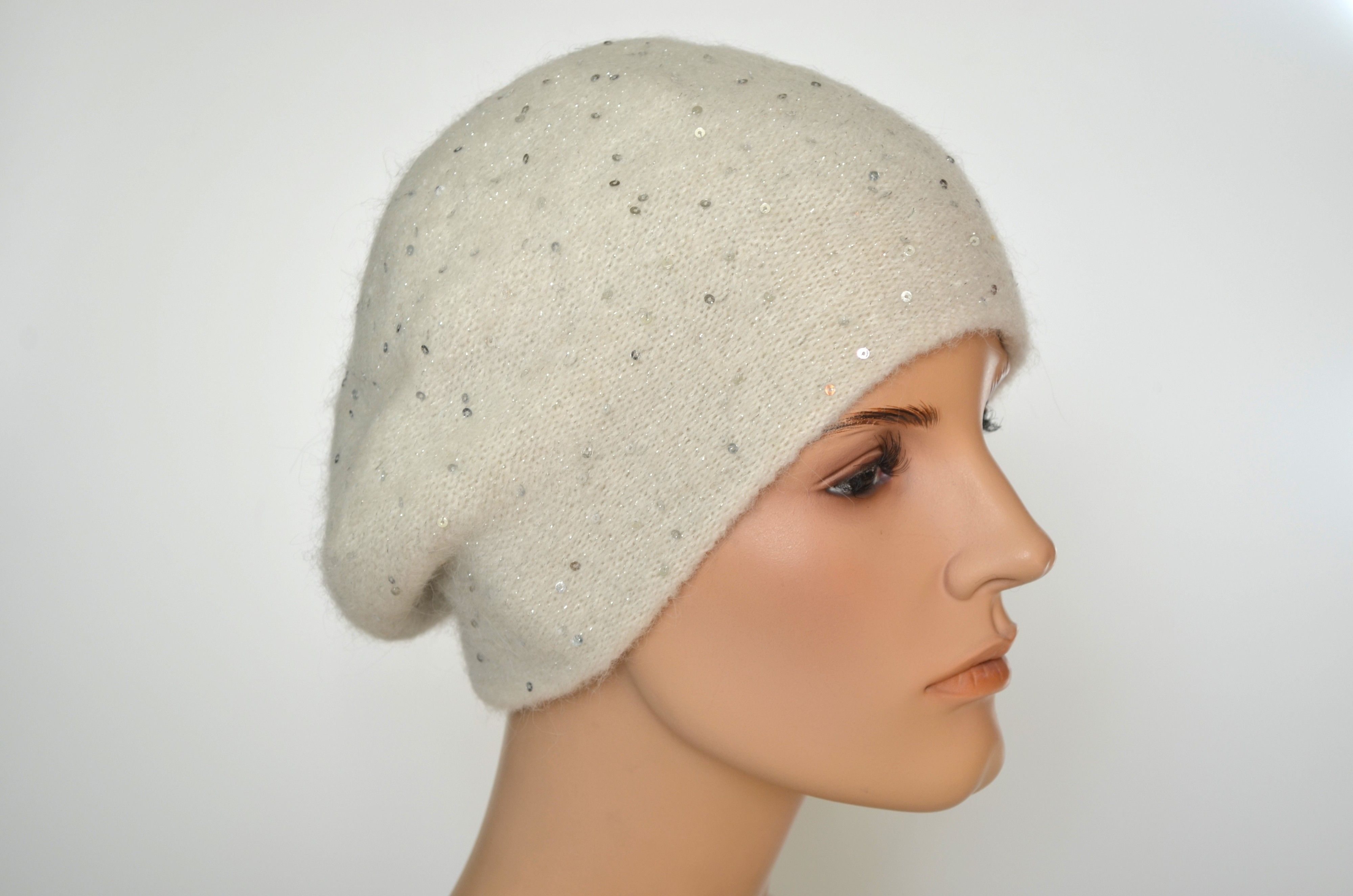 Зимний вязаный берет с пайетками белый женский с вязаным подкладом
