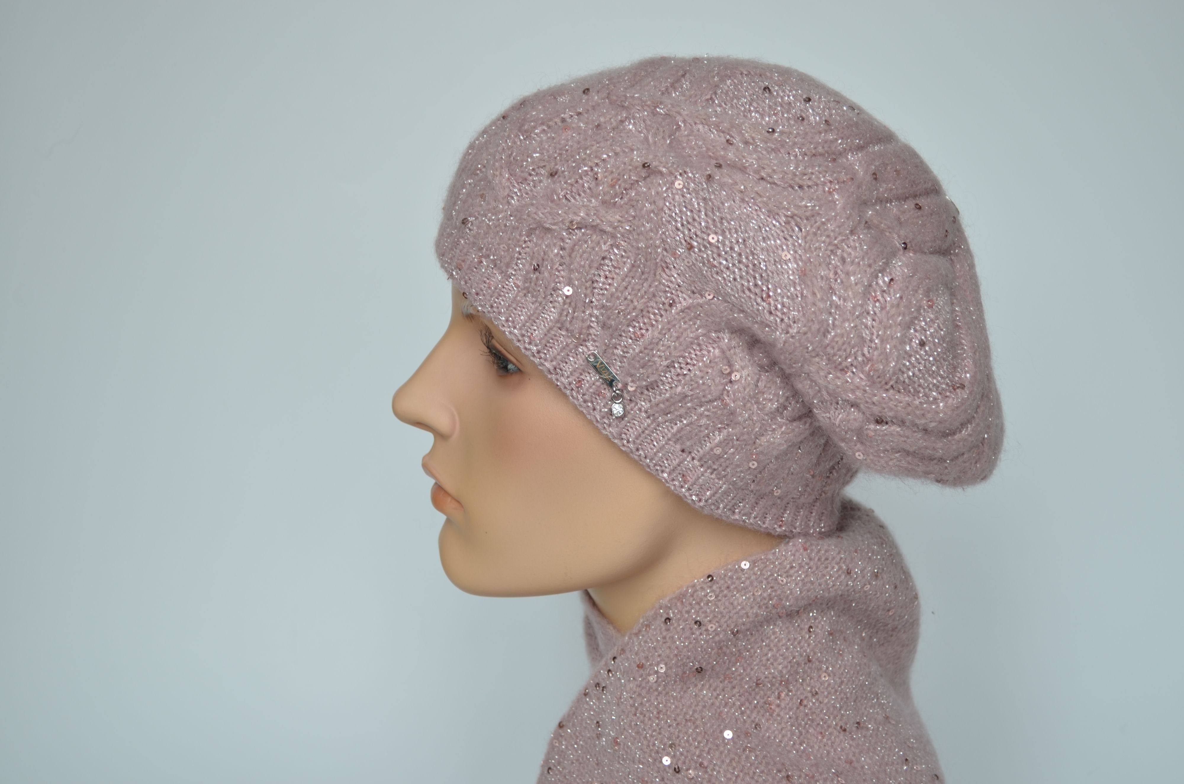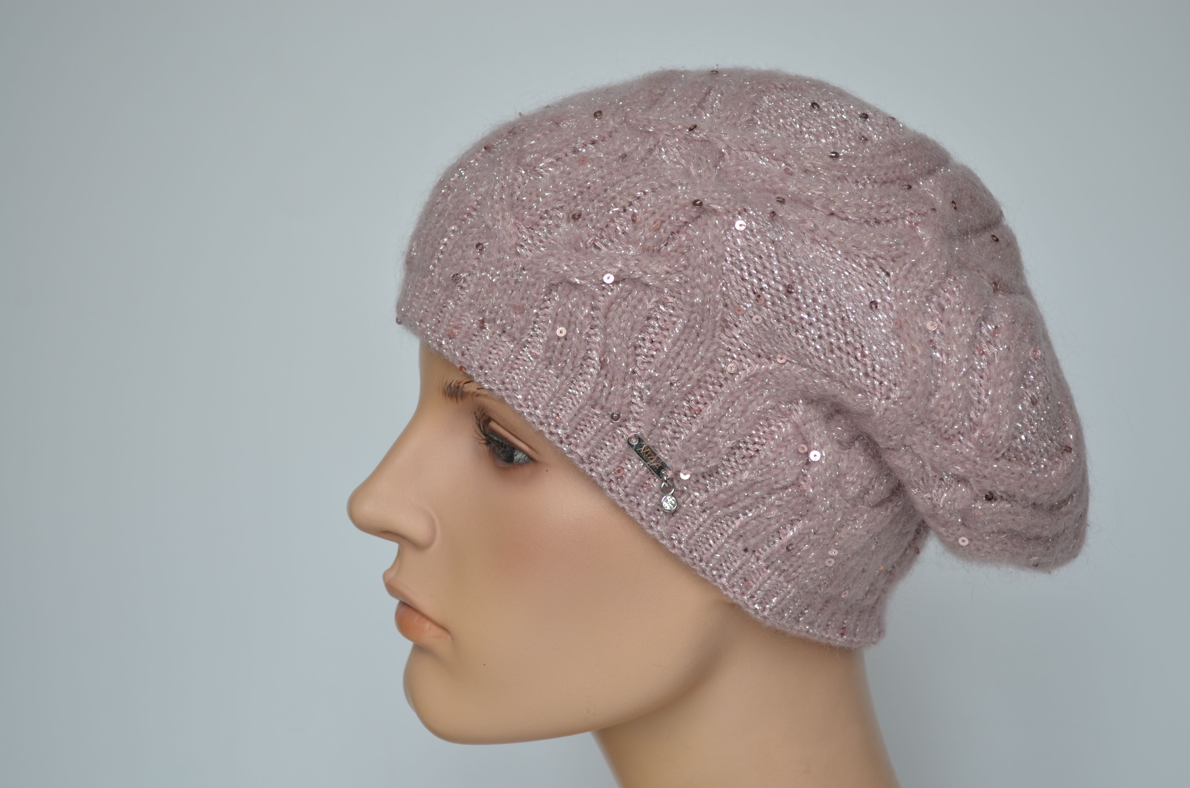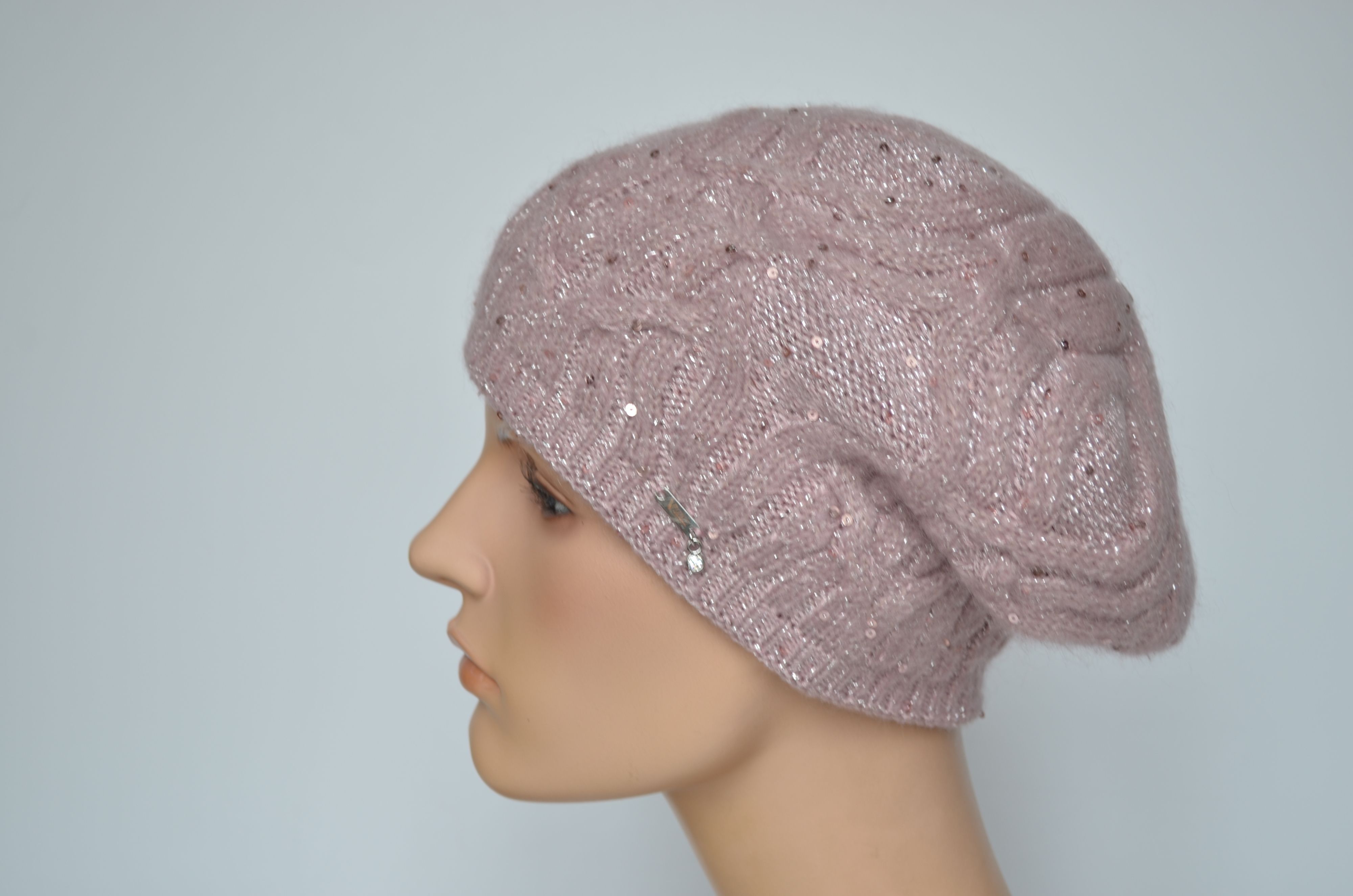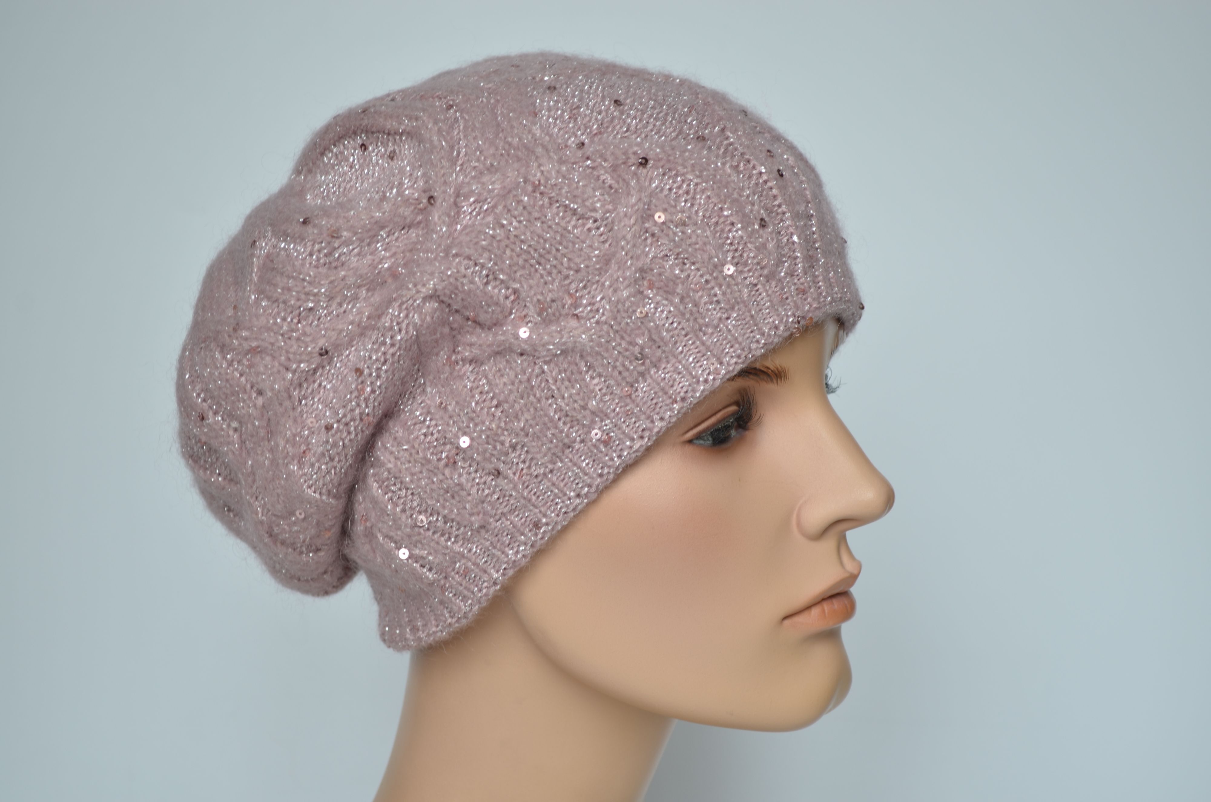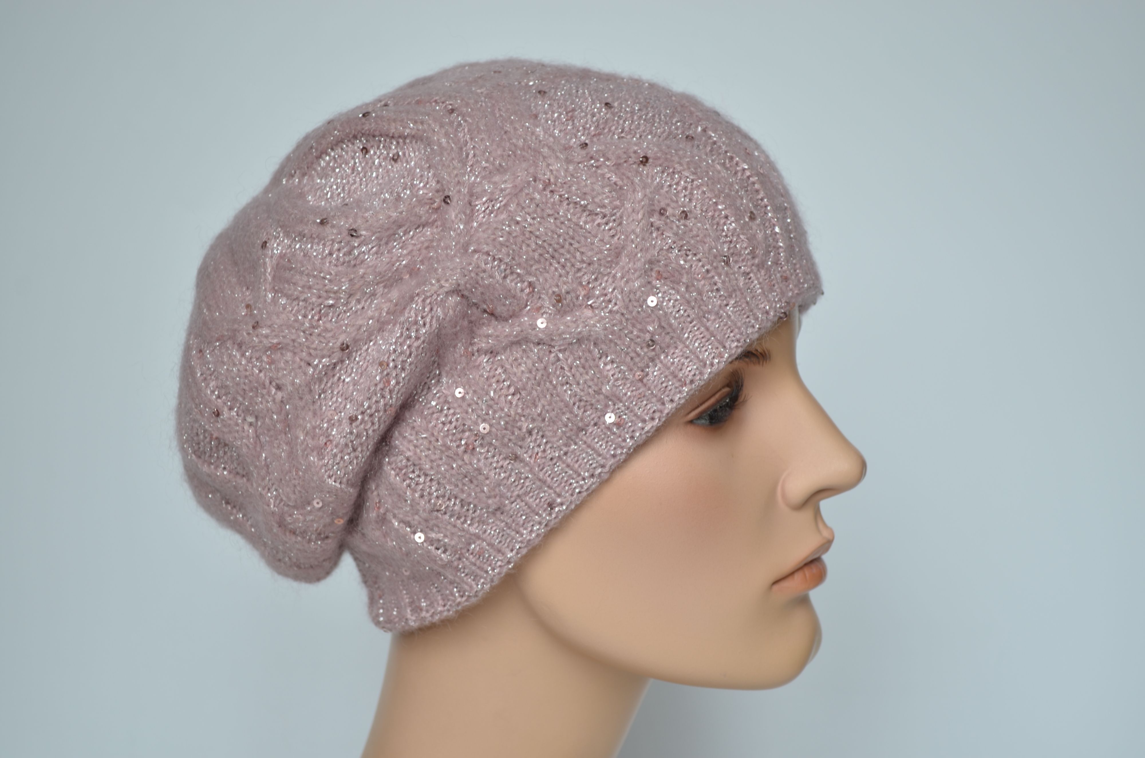 Женский берет вязаный косами зимний двойной розового цвета с пайетками