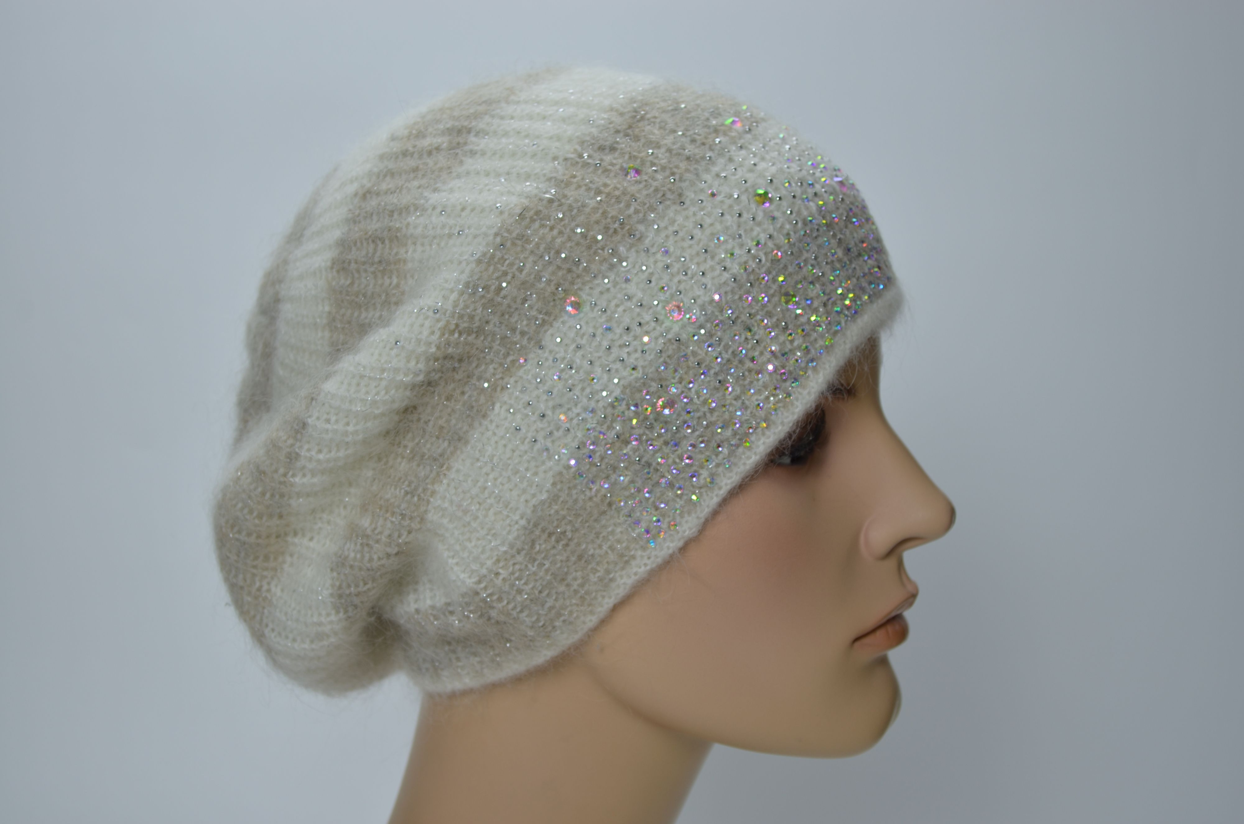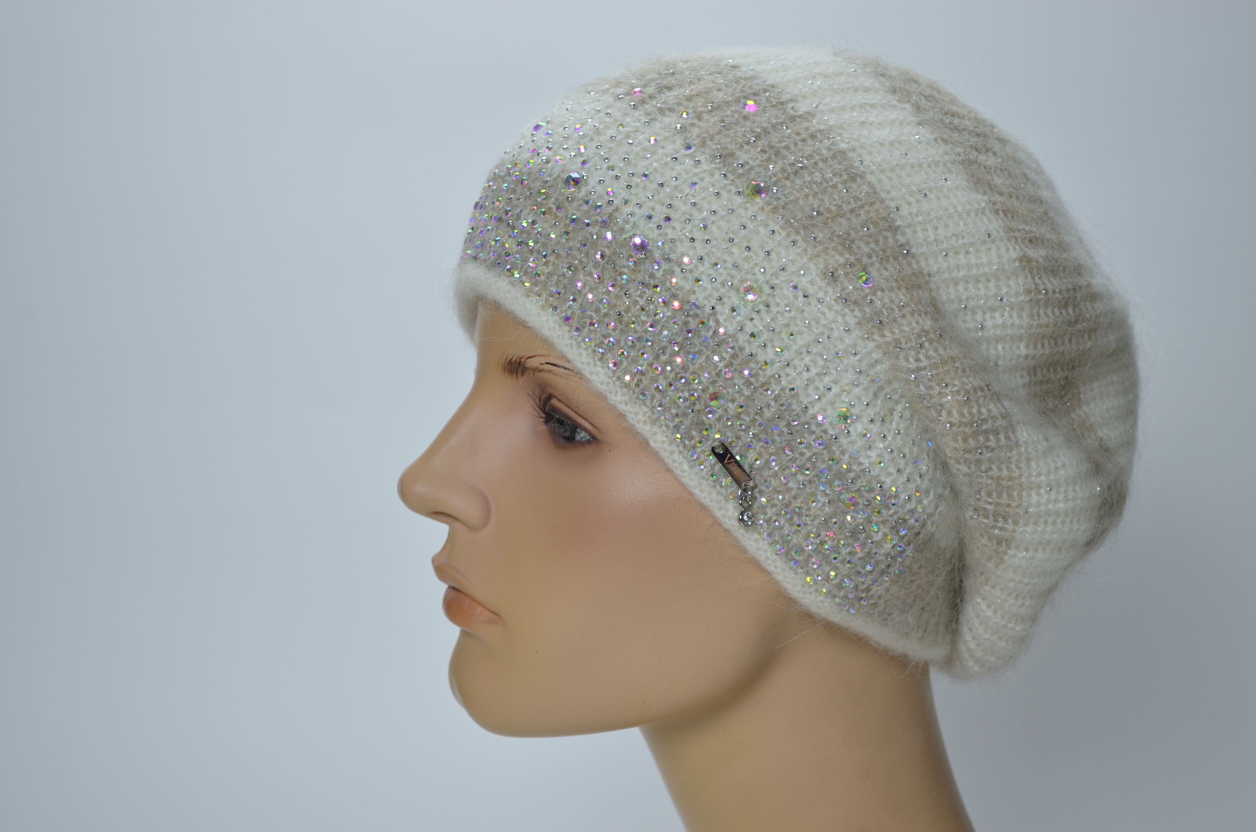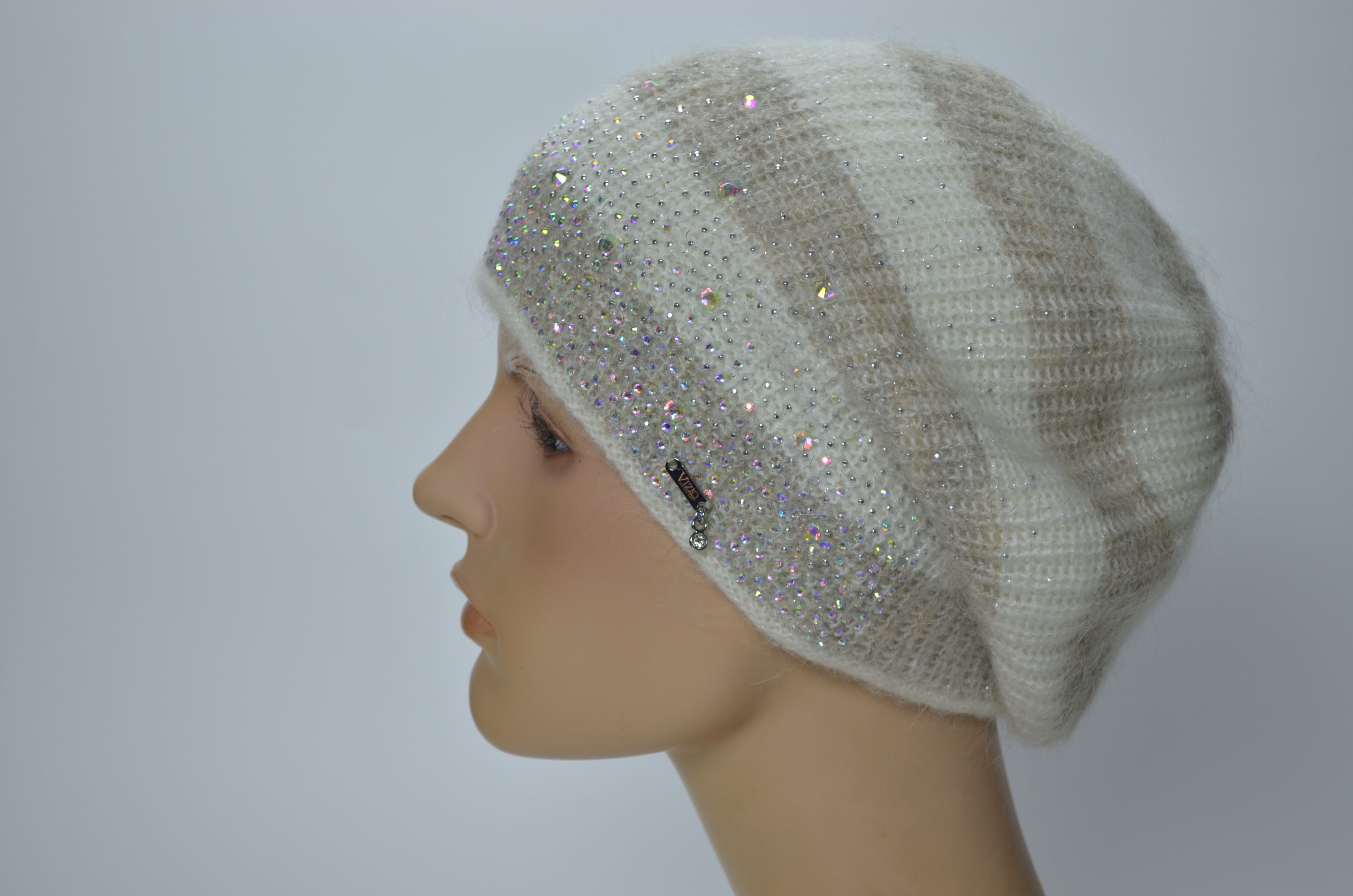 Женский вязаный берет в серо бежевую полоску со стразами Италия Vizio 1414 купить в интернет магазине итальянских беретов и шапок Визио