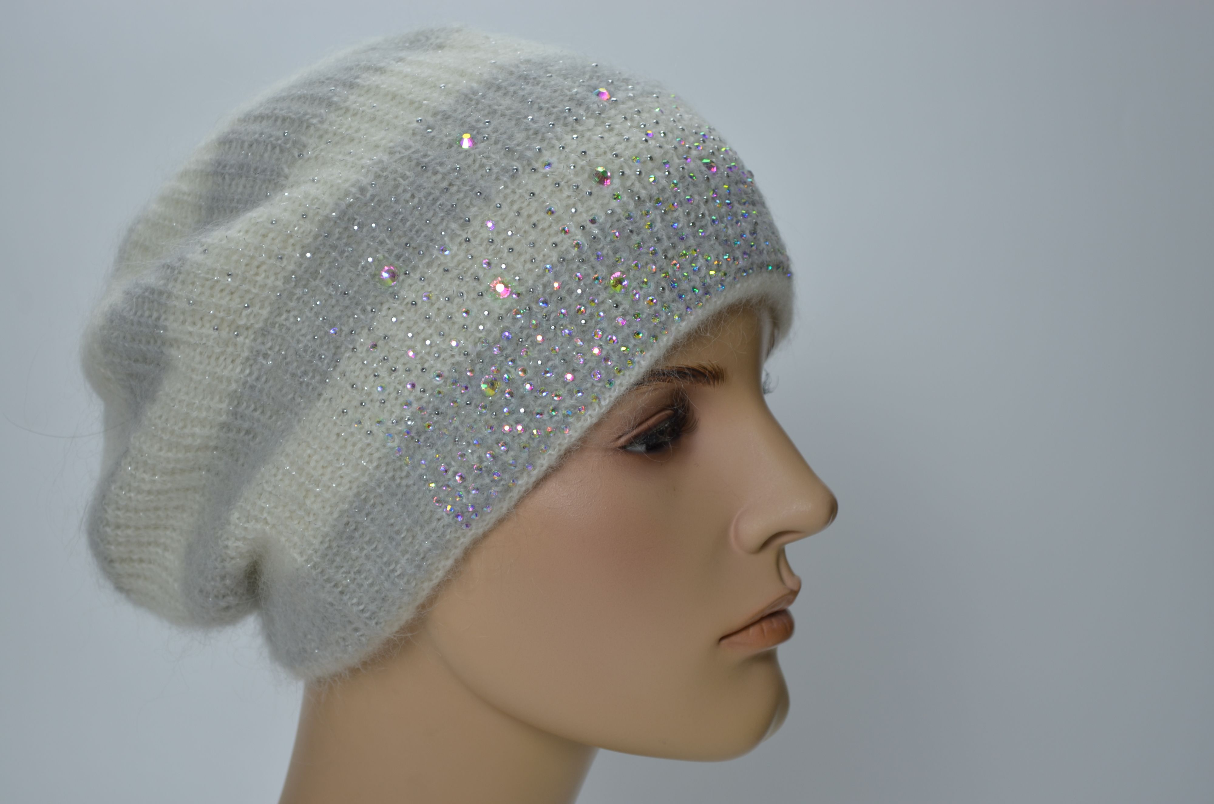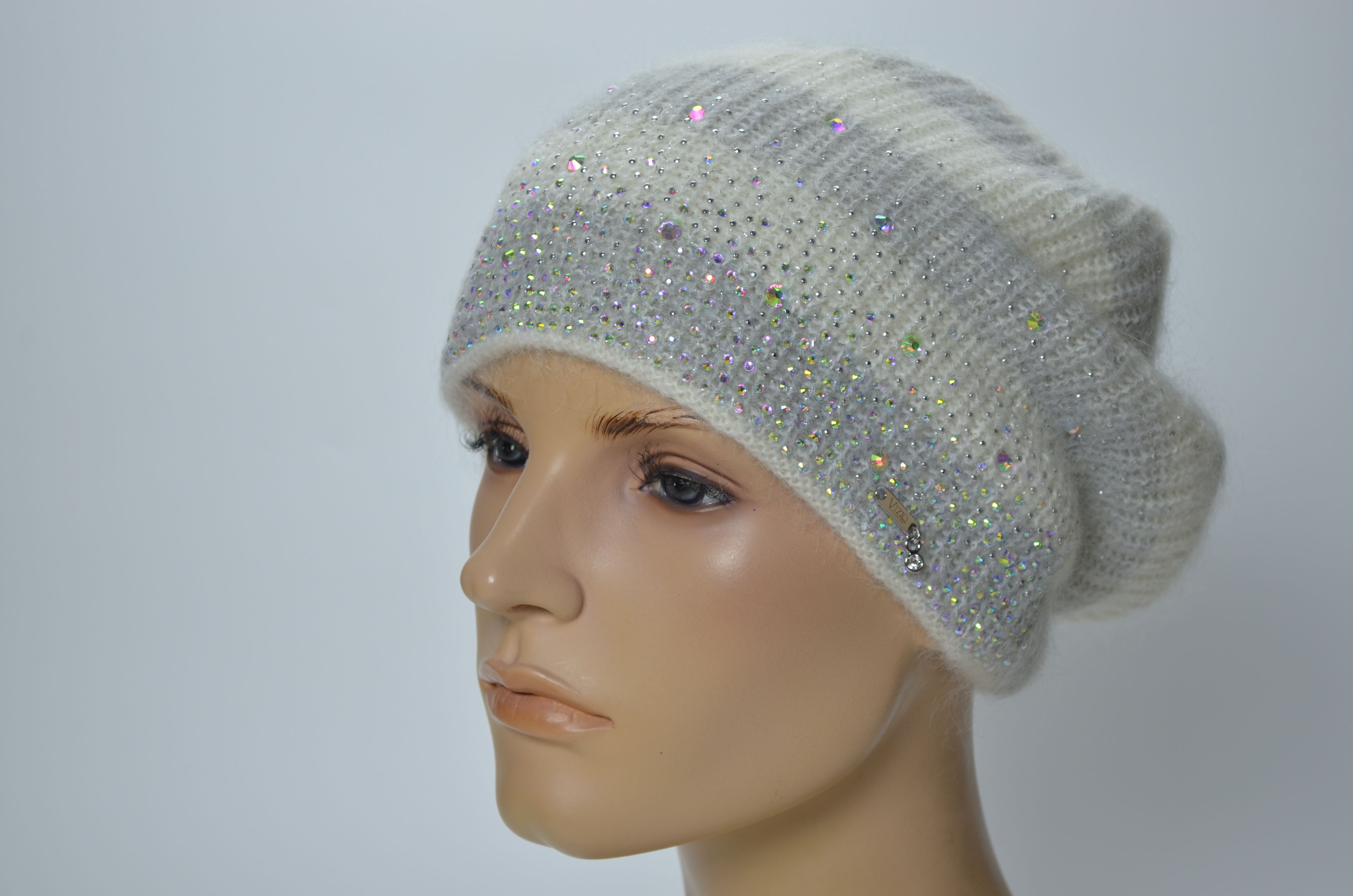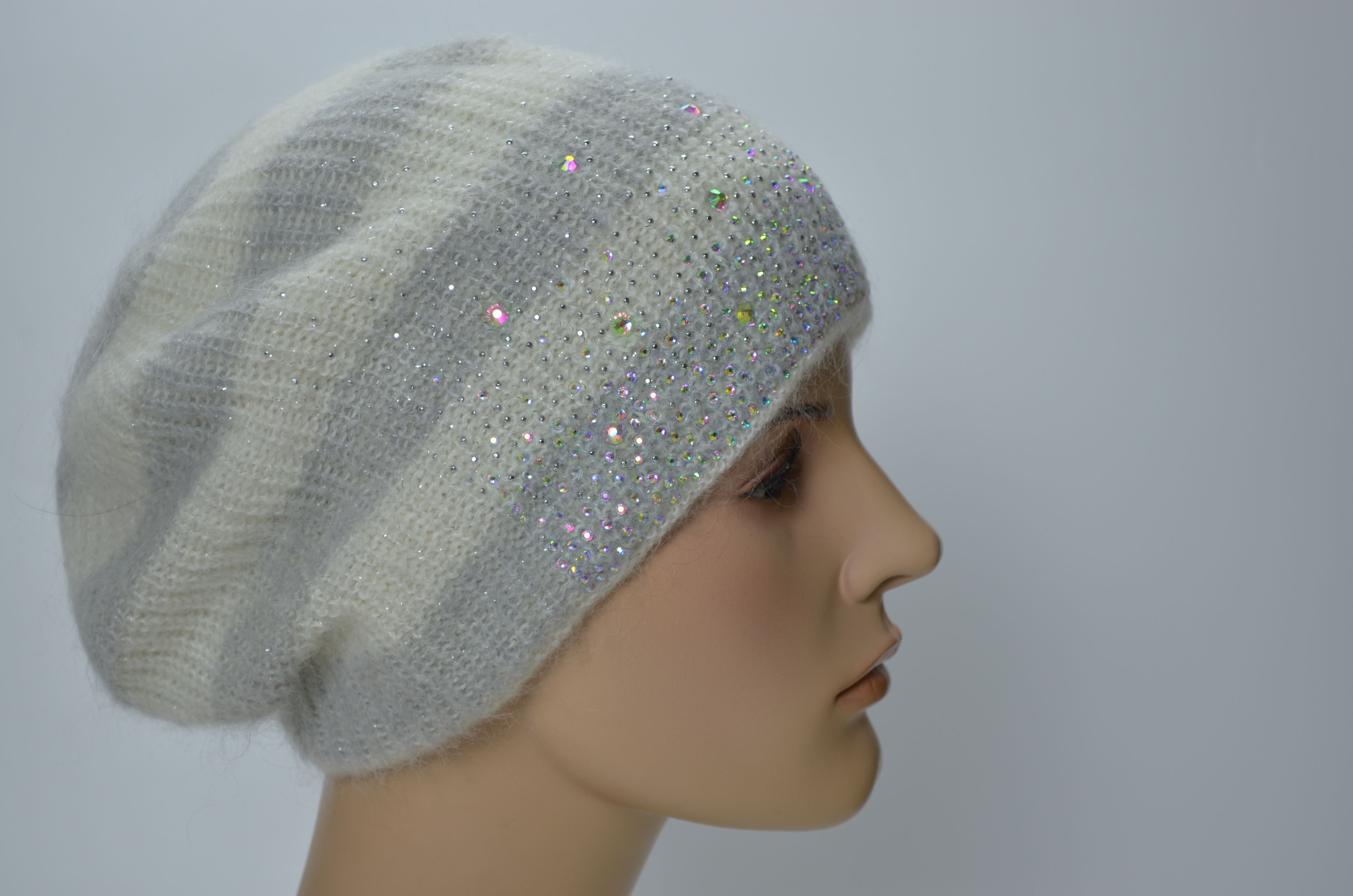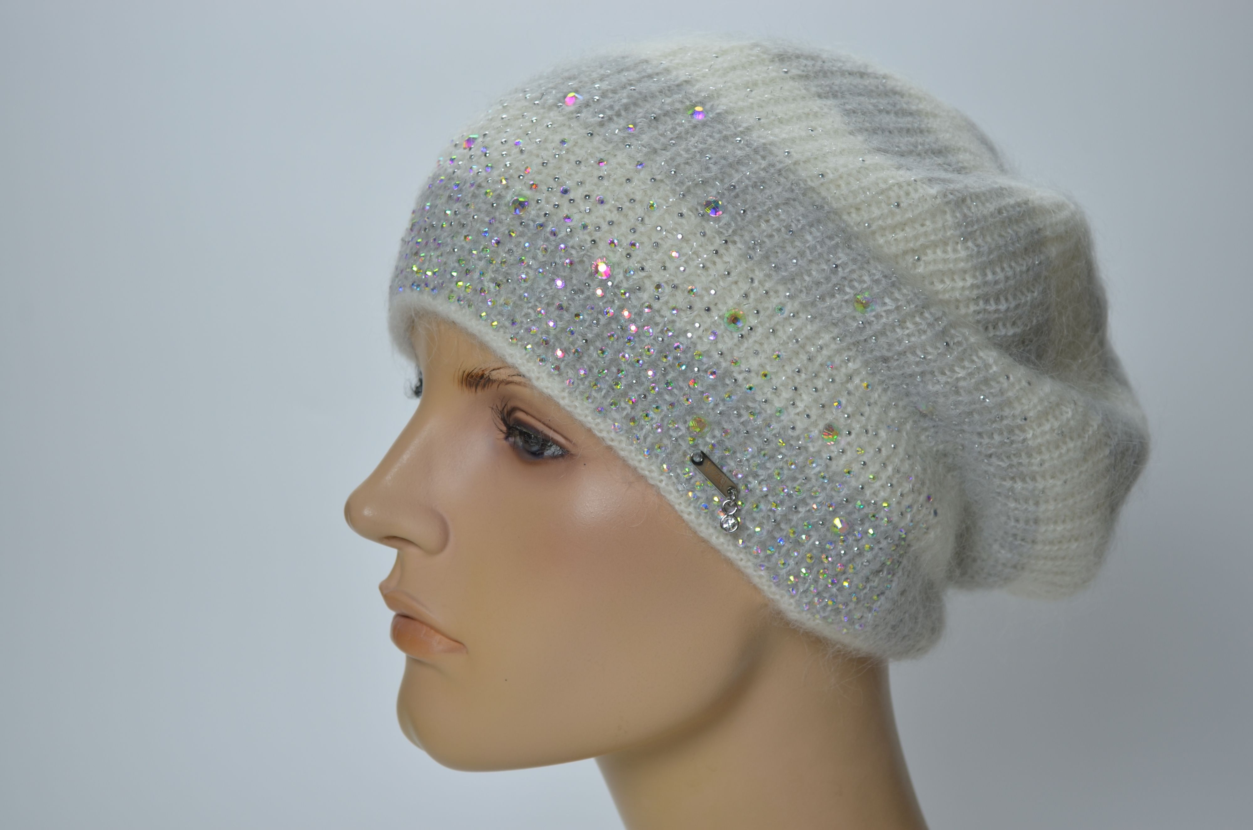 Женский вязаный берет в серо белую полоску со стразами Италия Vizio 1414 купить в интернет магазине итальянских беретов и шапок Визио