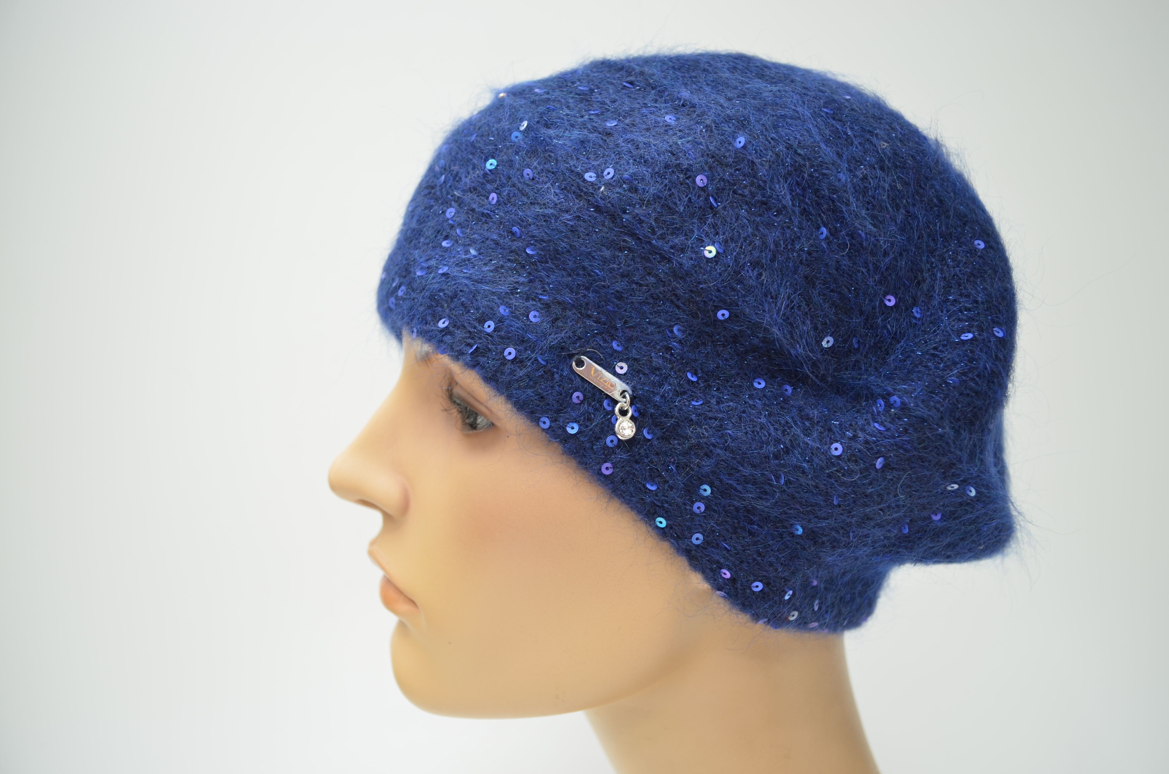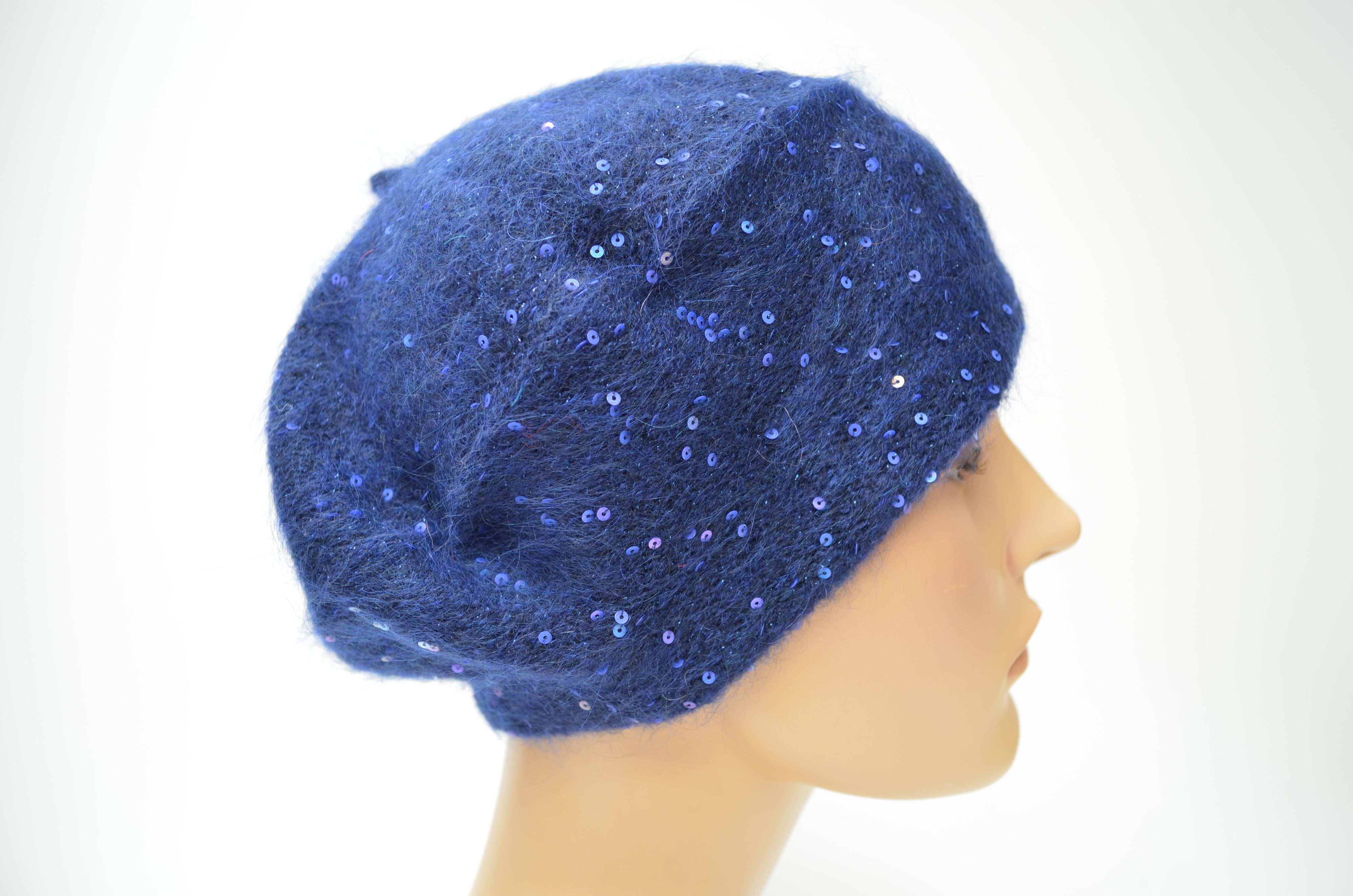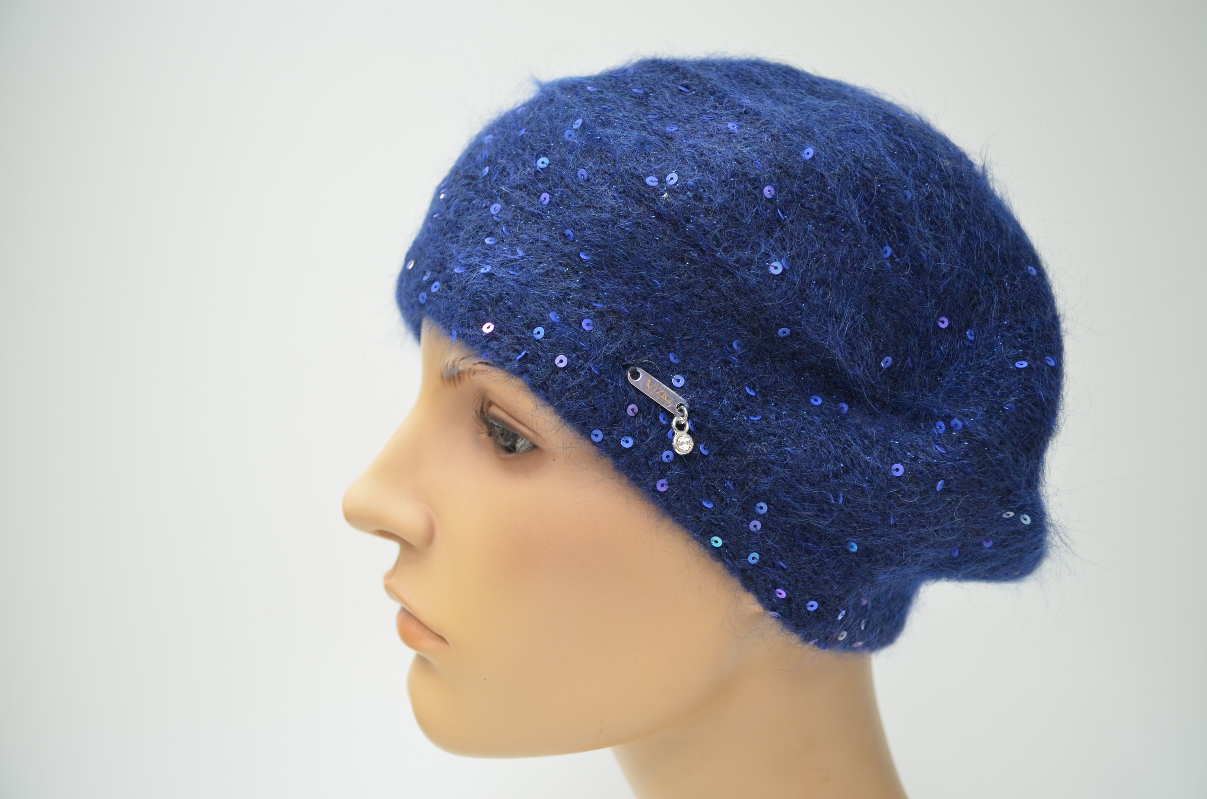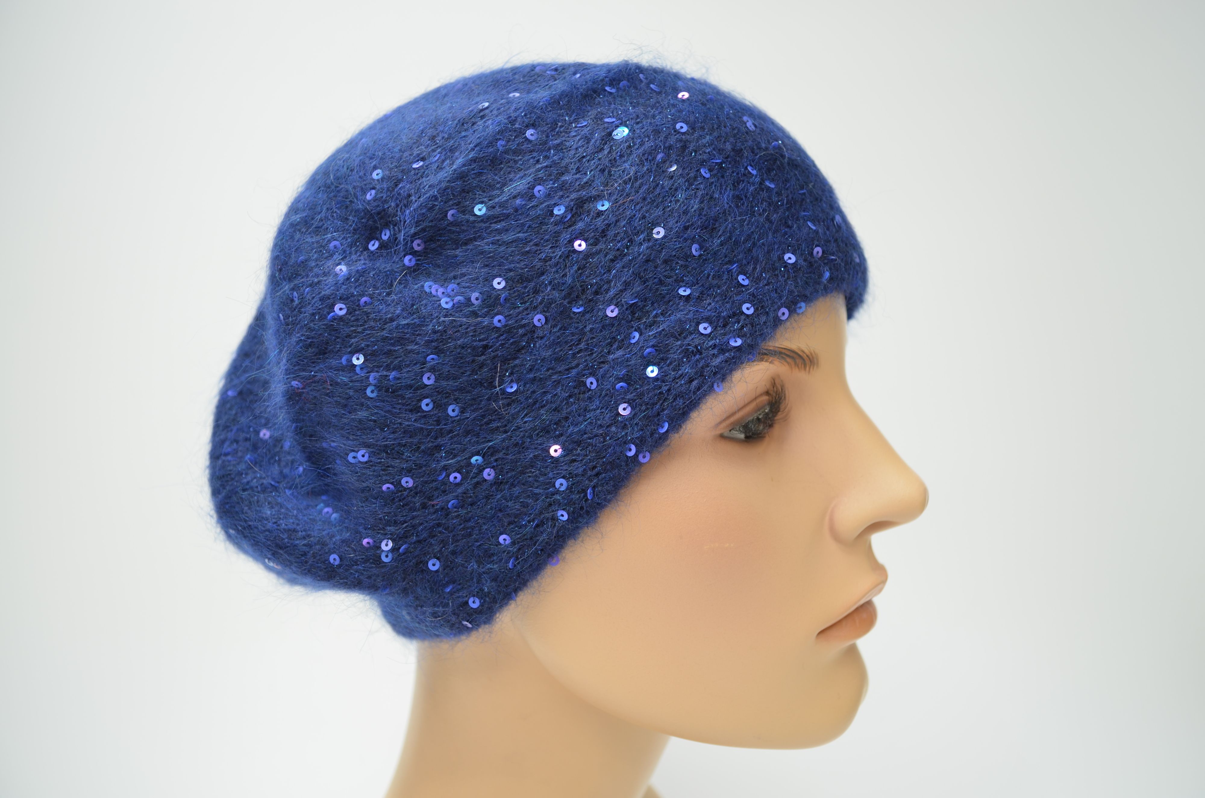 Одинарный синий женский зимний берет вязаный из мохера и мериноса с пайетками осень зима 2025 2026