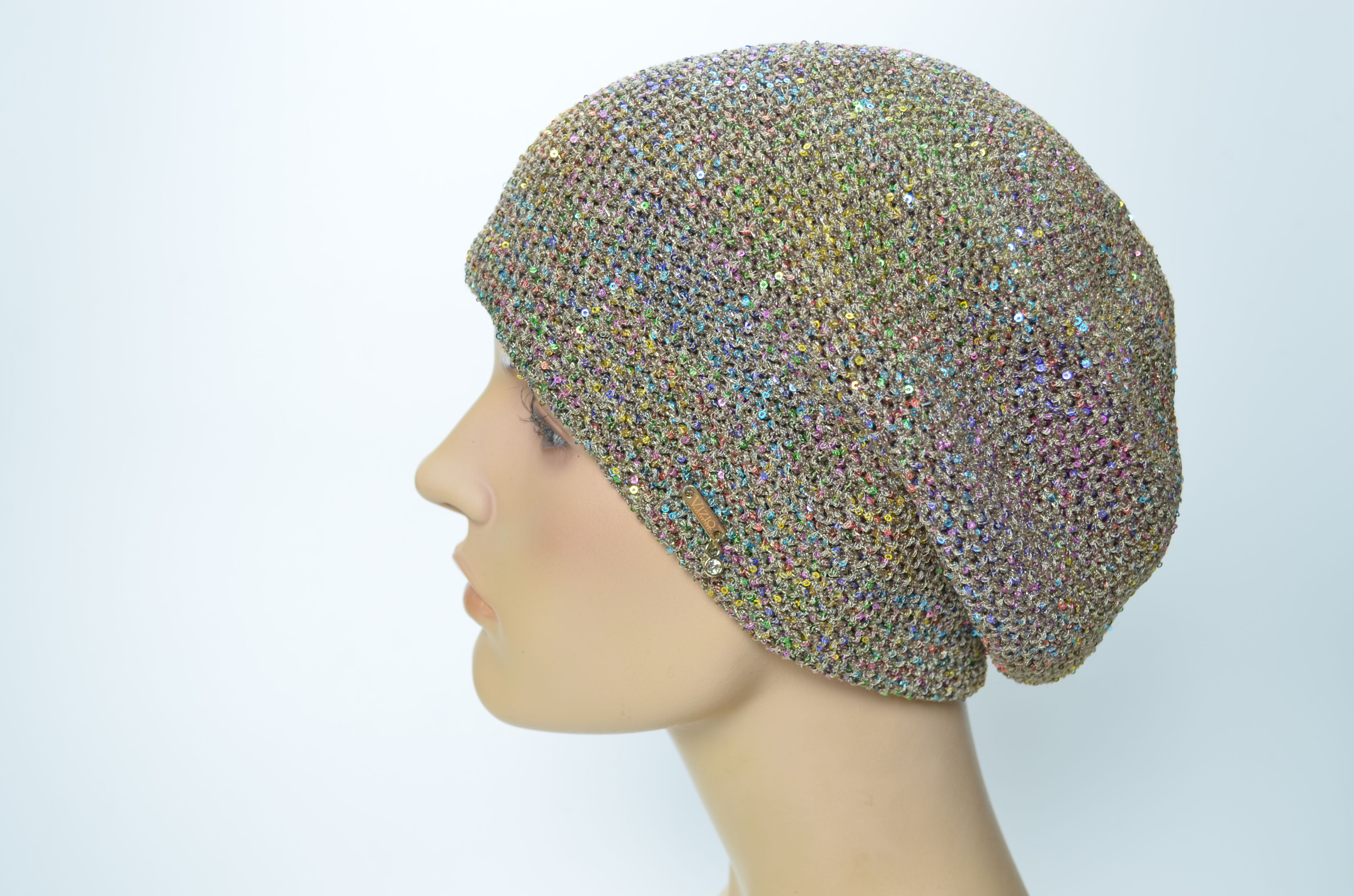 Золотистый вязаный берет с украшениями микропайетками Vizio Италия 6814 купить в интернет магазине женских головных уборов Италии Vizio Collezione с доставкой по Москве и России