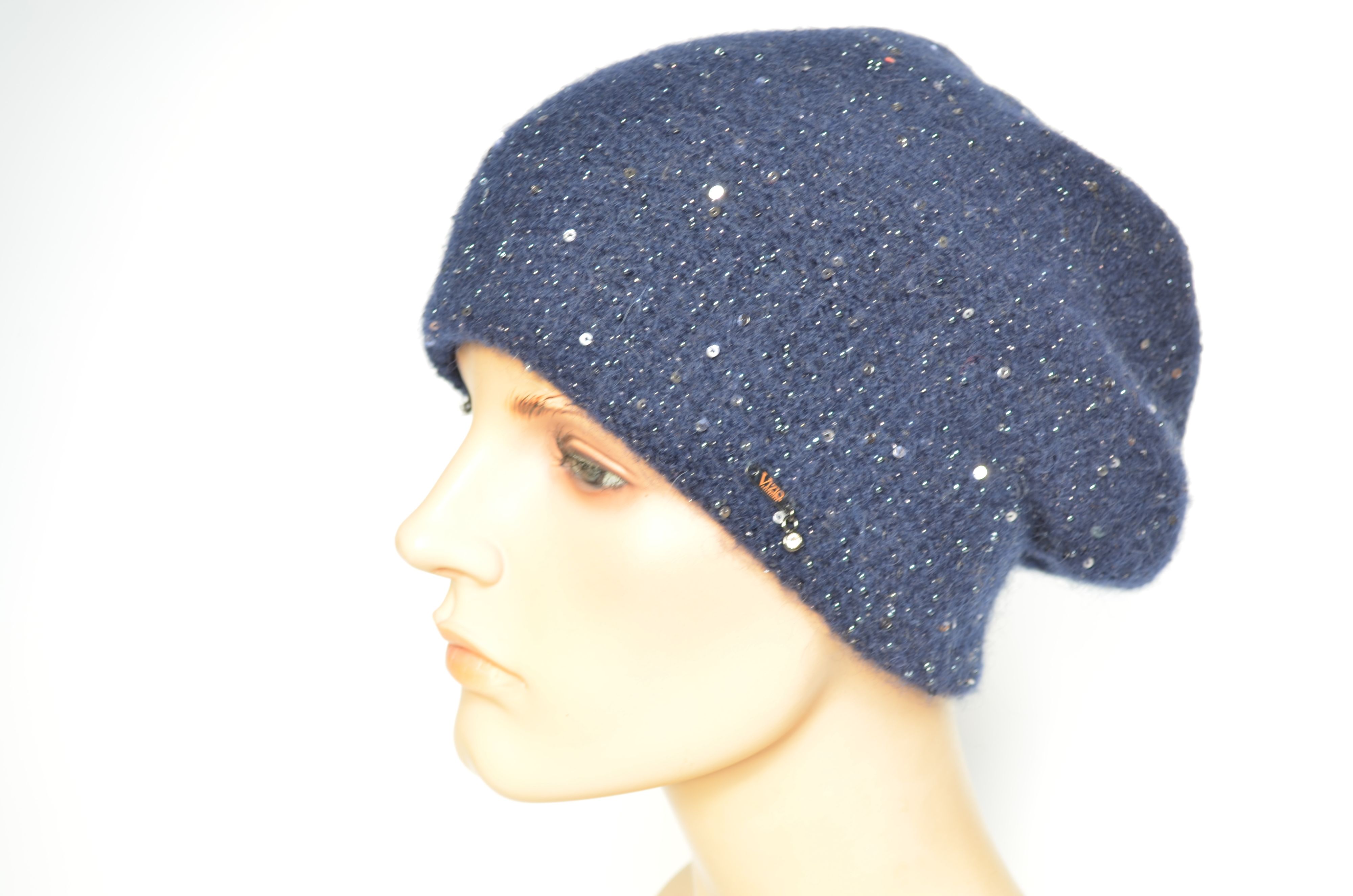 Синий берет женский вязаный с пайетками Vizio Италия 1126 зимняя коллекция итальянских беретов и шапок с пайетками Визио