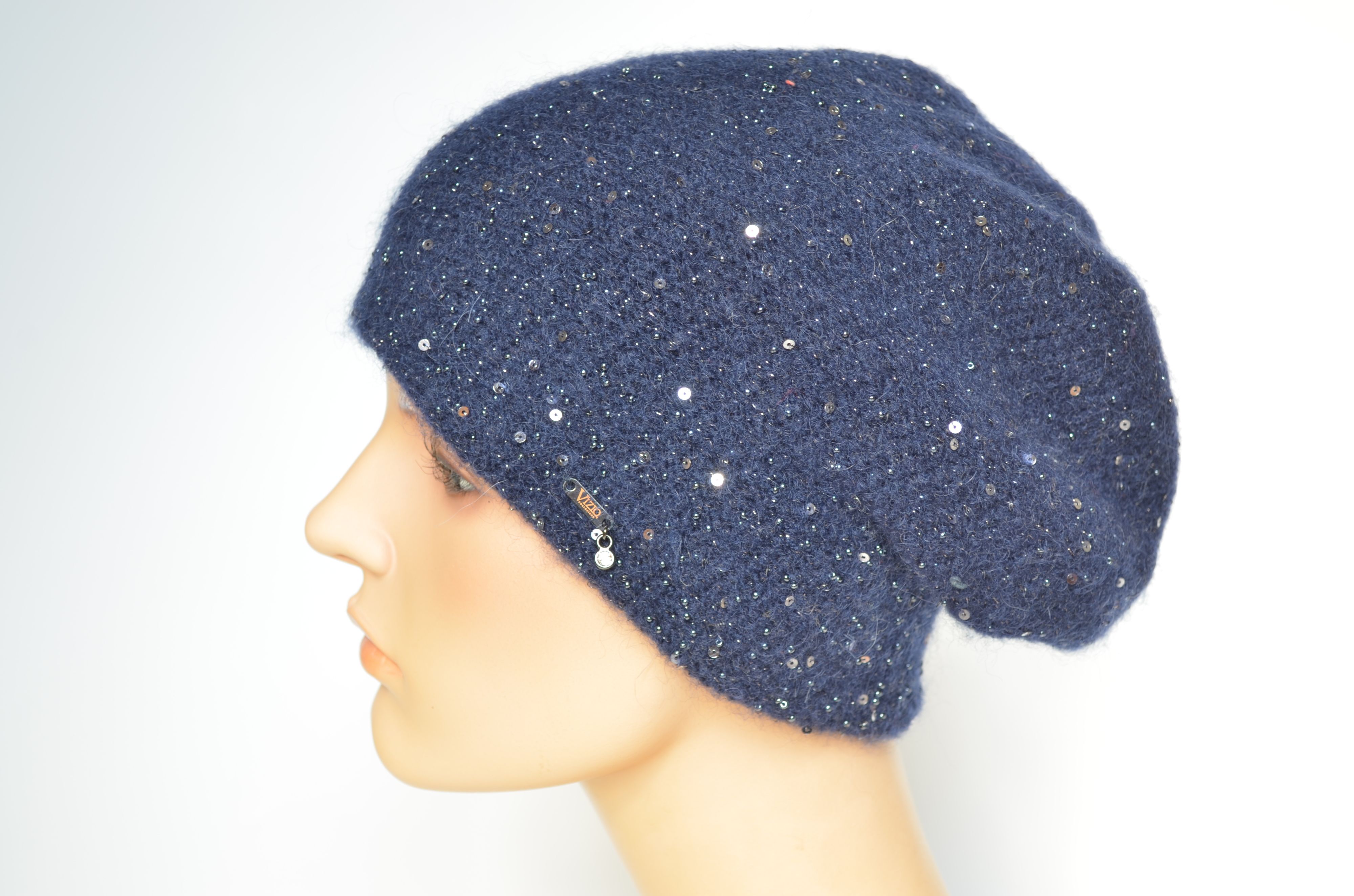 Синий женский берет вязаный с пайетками зимний с вязаным подкладом