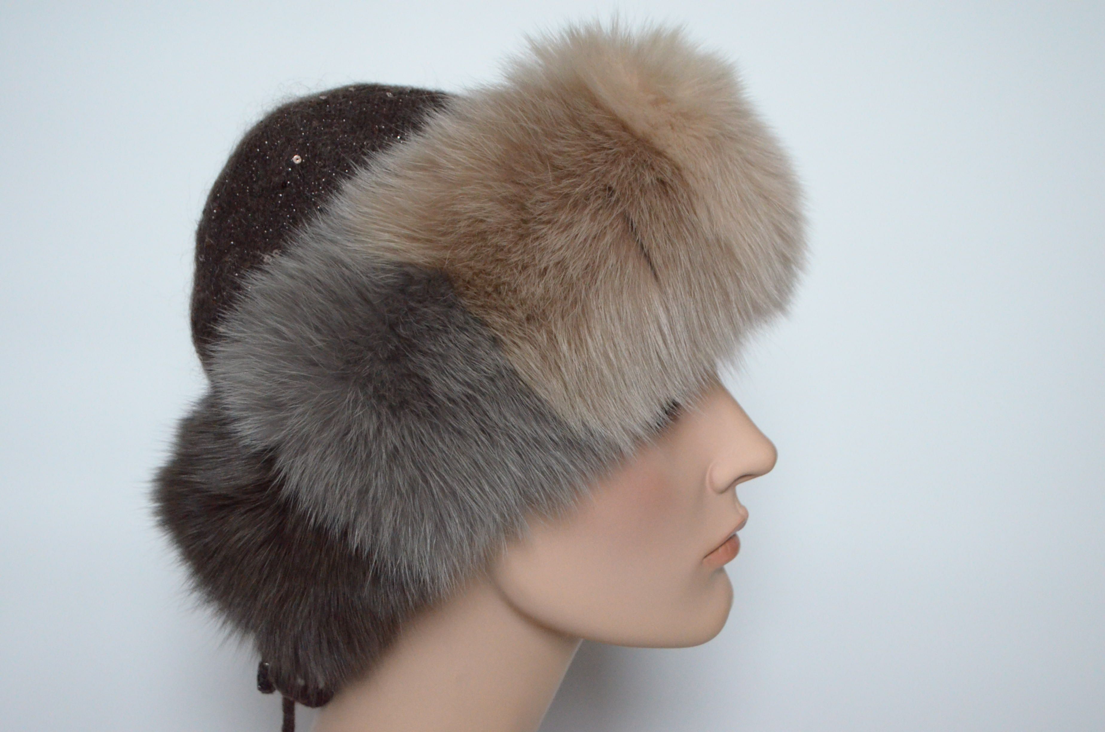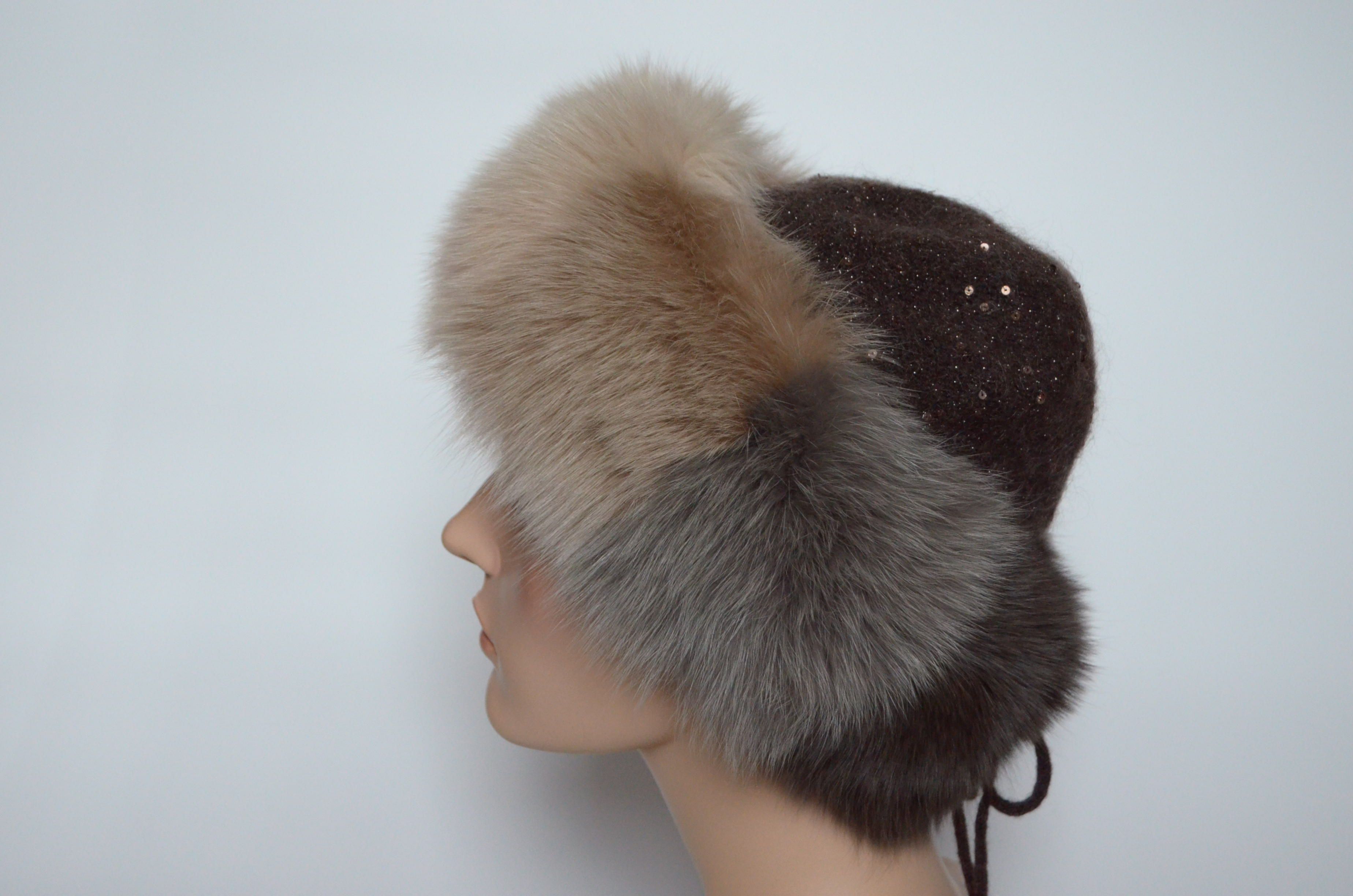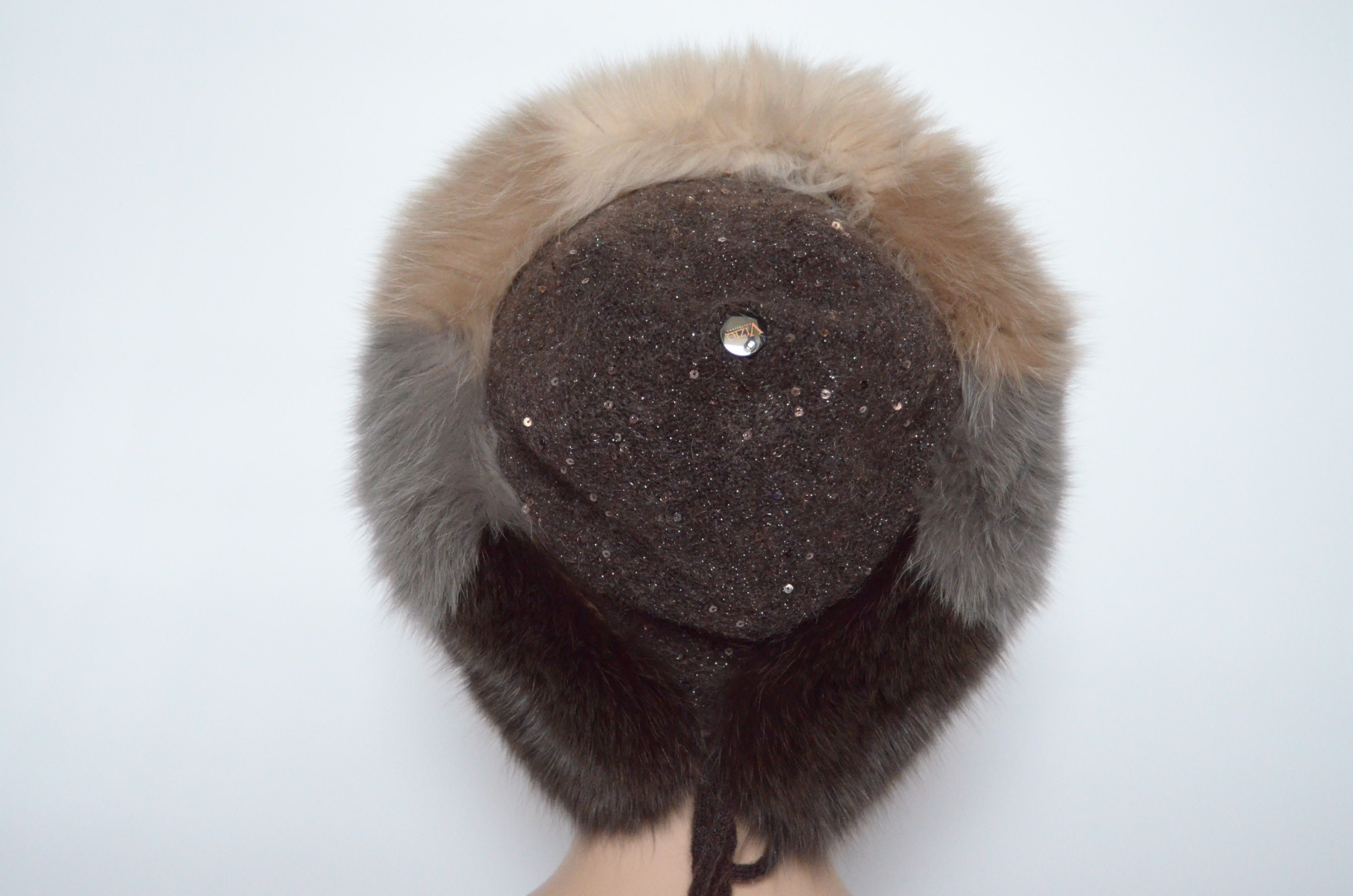 Женская вязаная коричневая шапка с пайетками и разноцветными вставками из меха песца Vizio Италия 6725 CCP купить в магазине дизайнерских головных уборов для женщин с доставкой по Москве и России