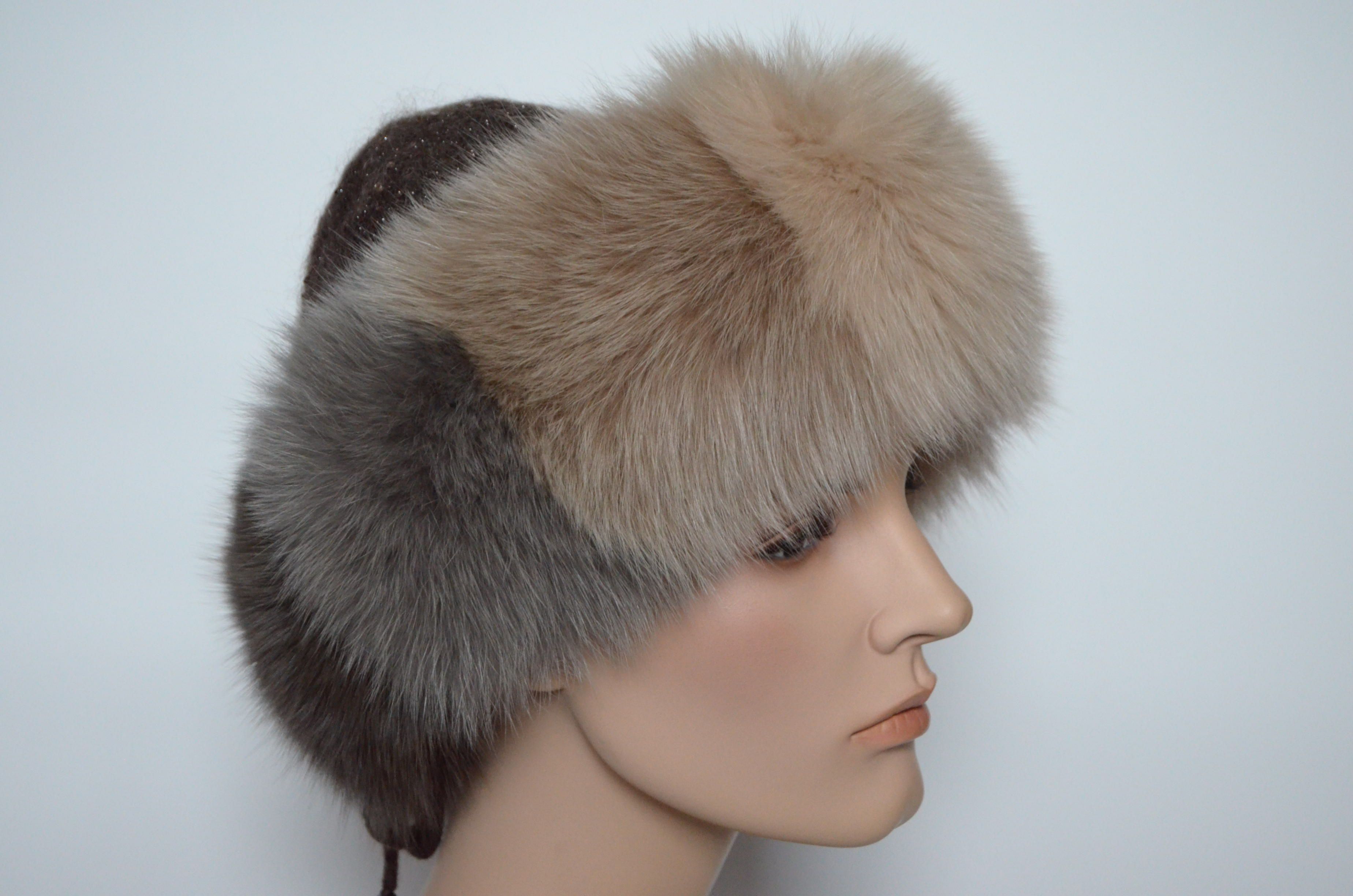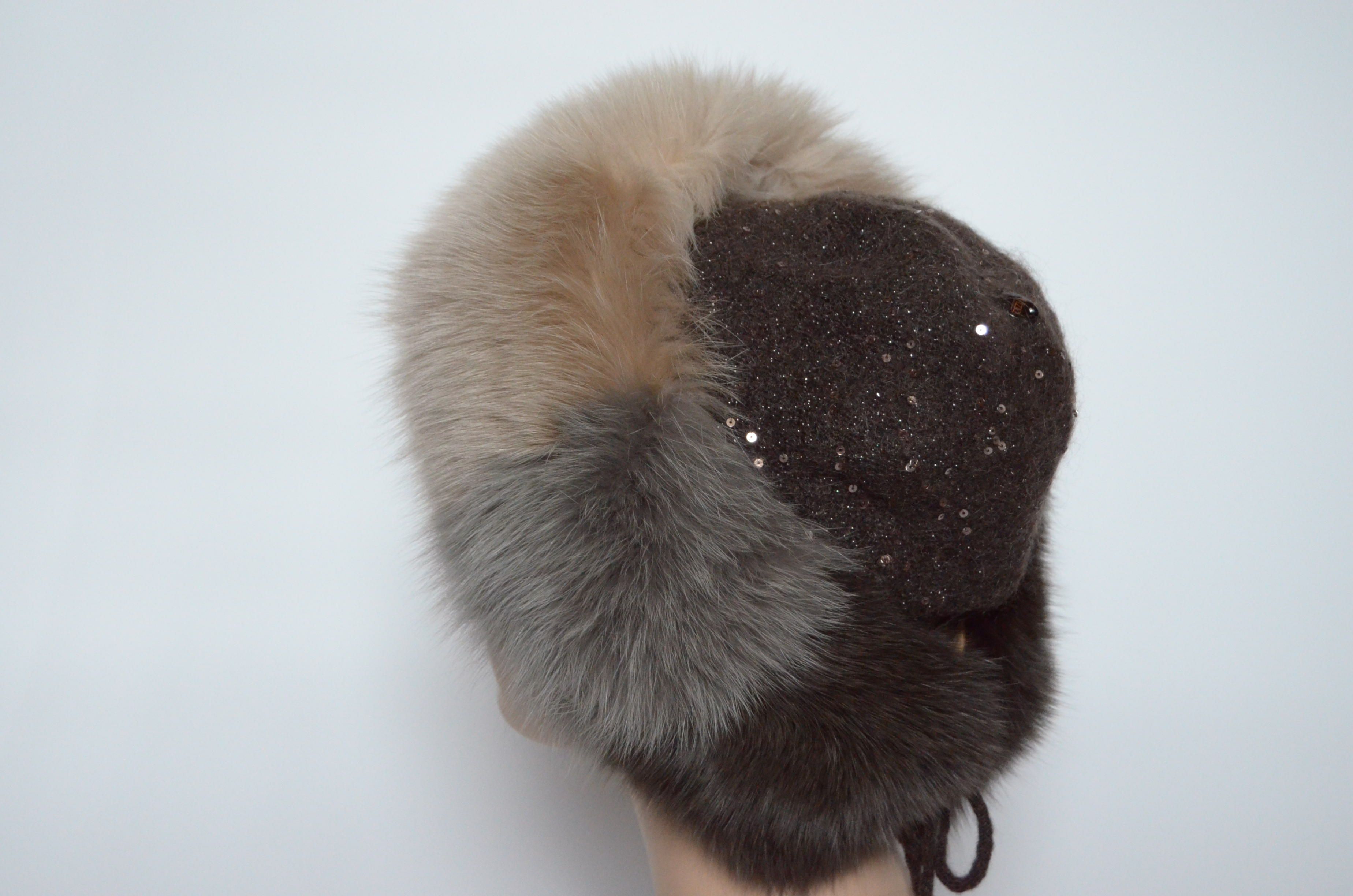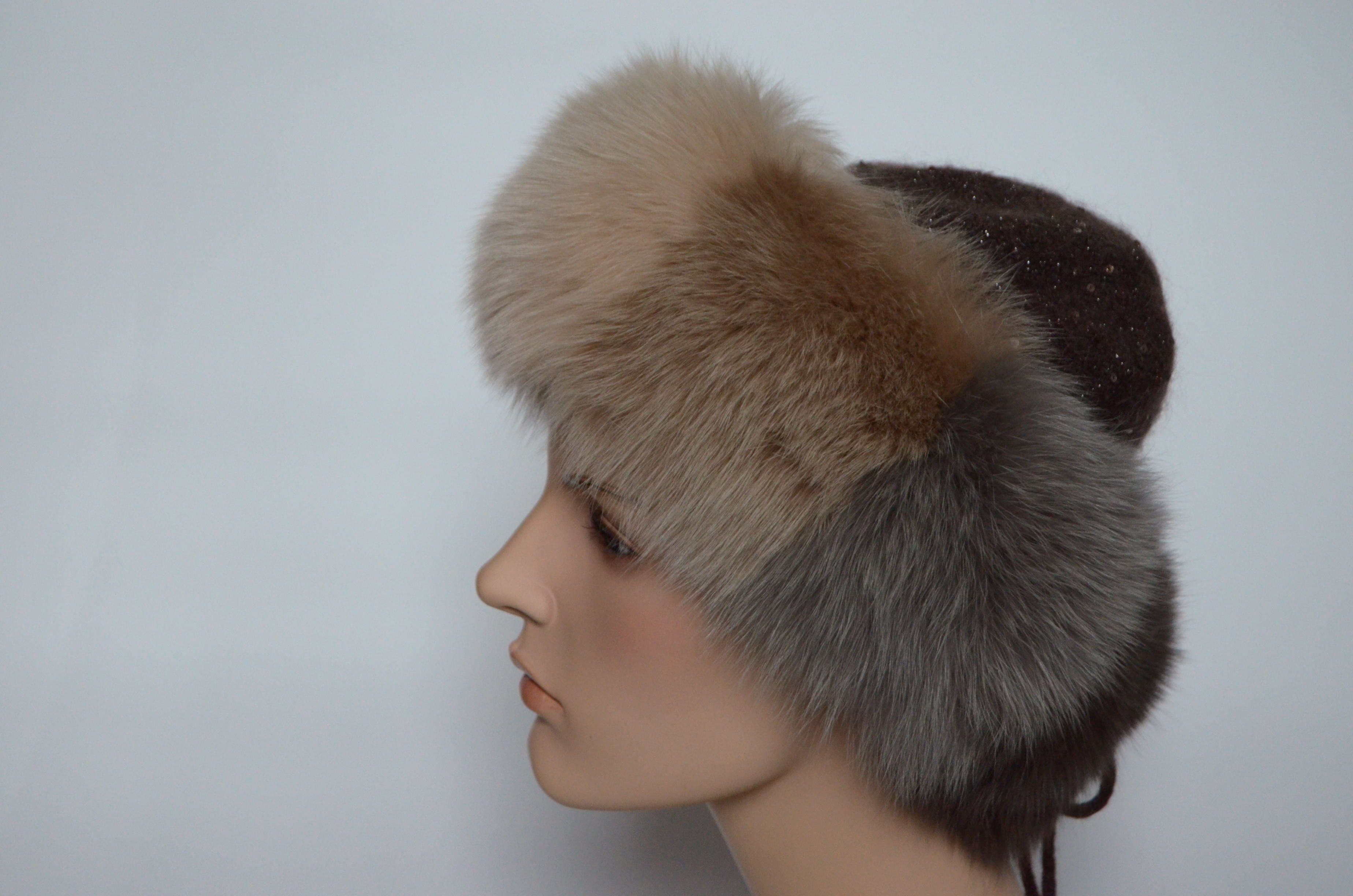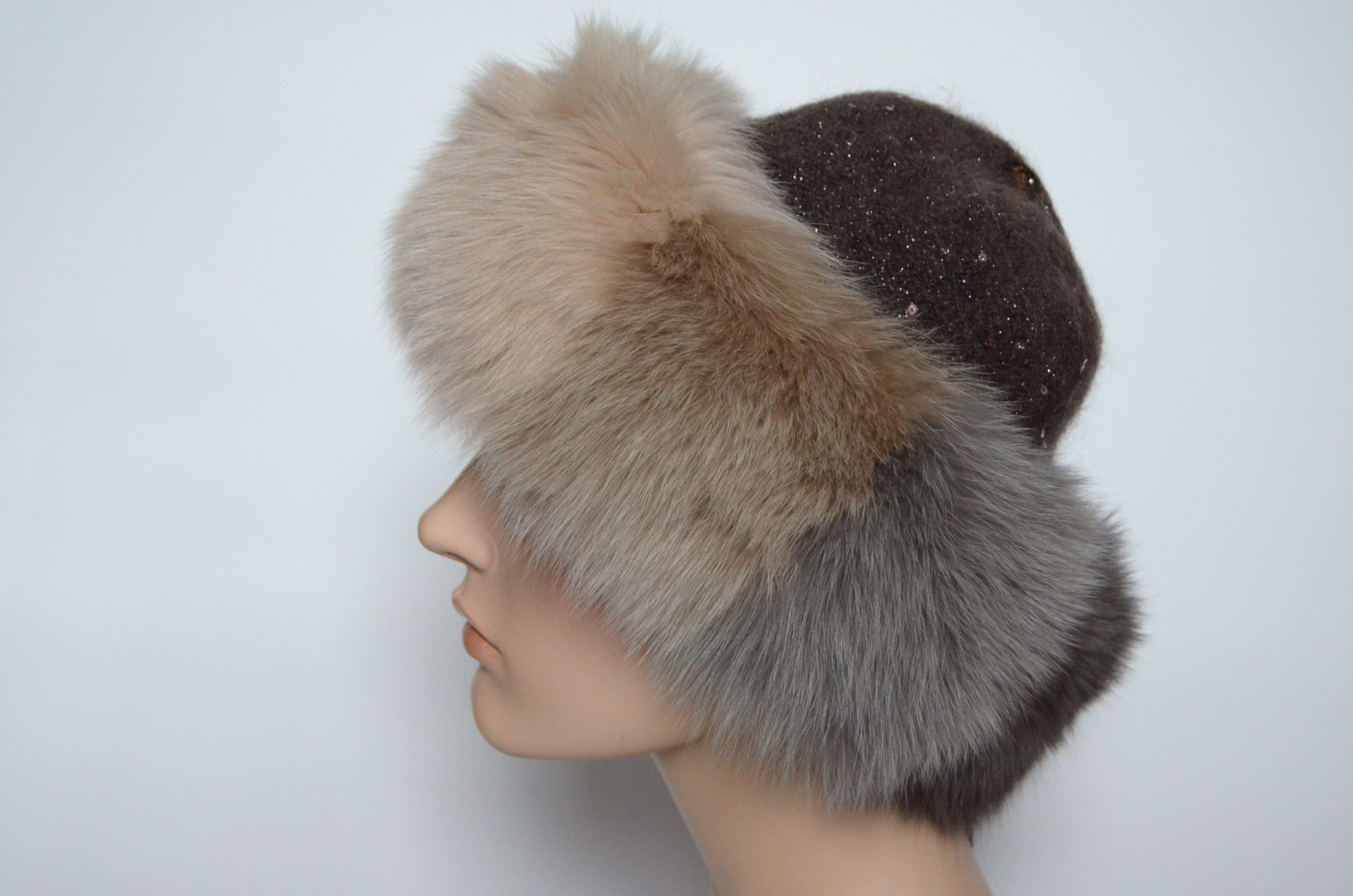 Женская вязаная коричневая шапка с пайетками и разноцветными вставками из меха песца Vizio Италия 6725 CCP купить в магазине дизайнерских головных уборов для женщин с доставкой по Москве и России