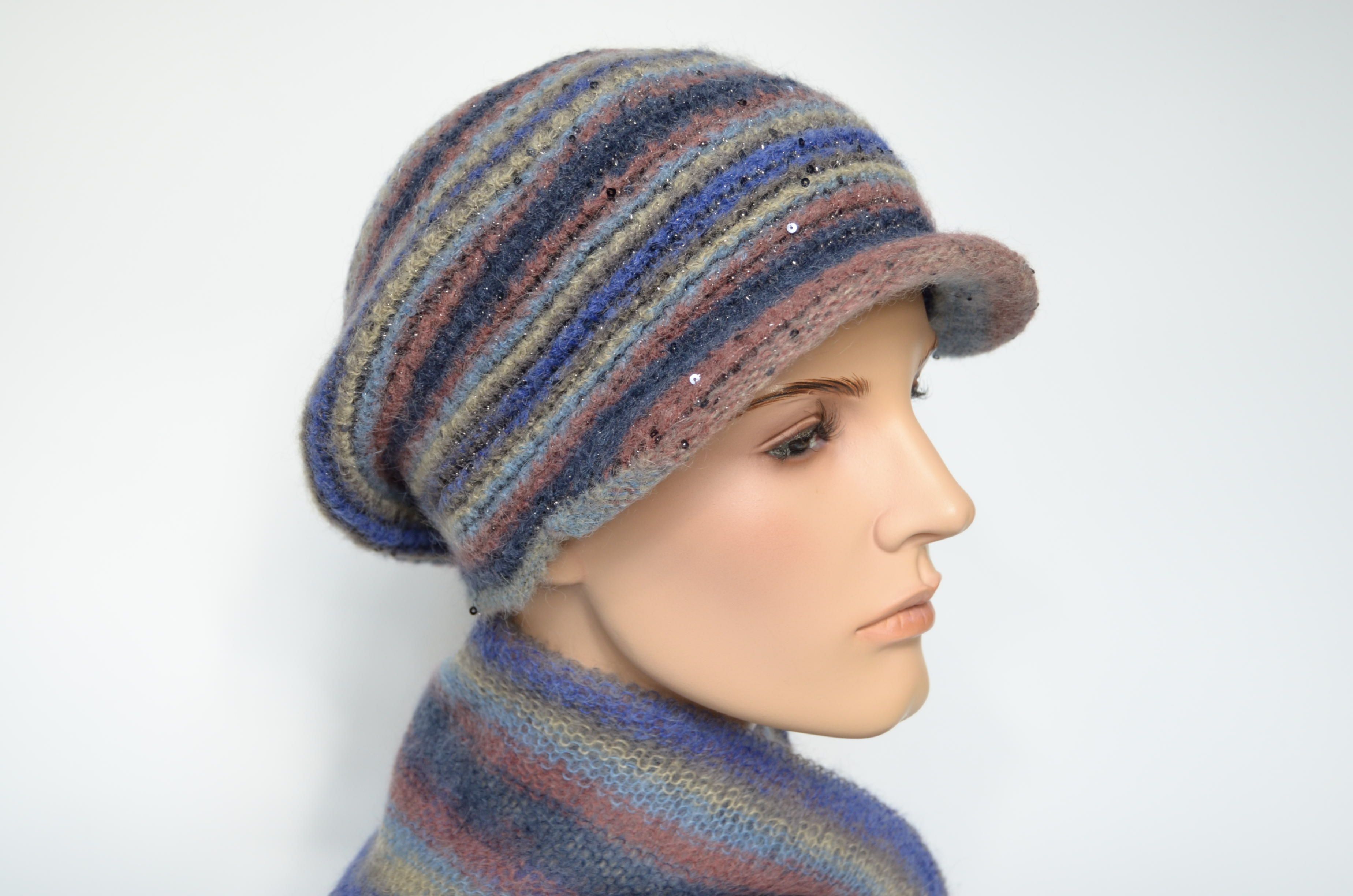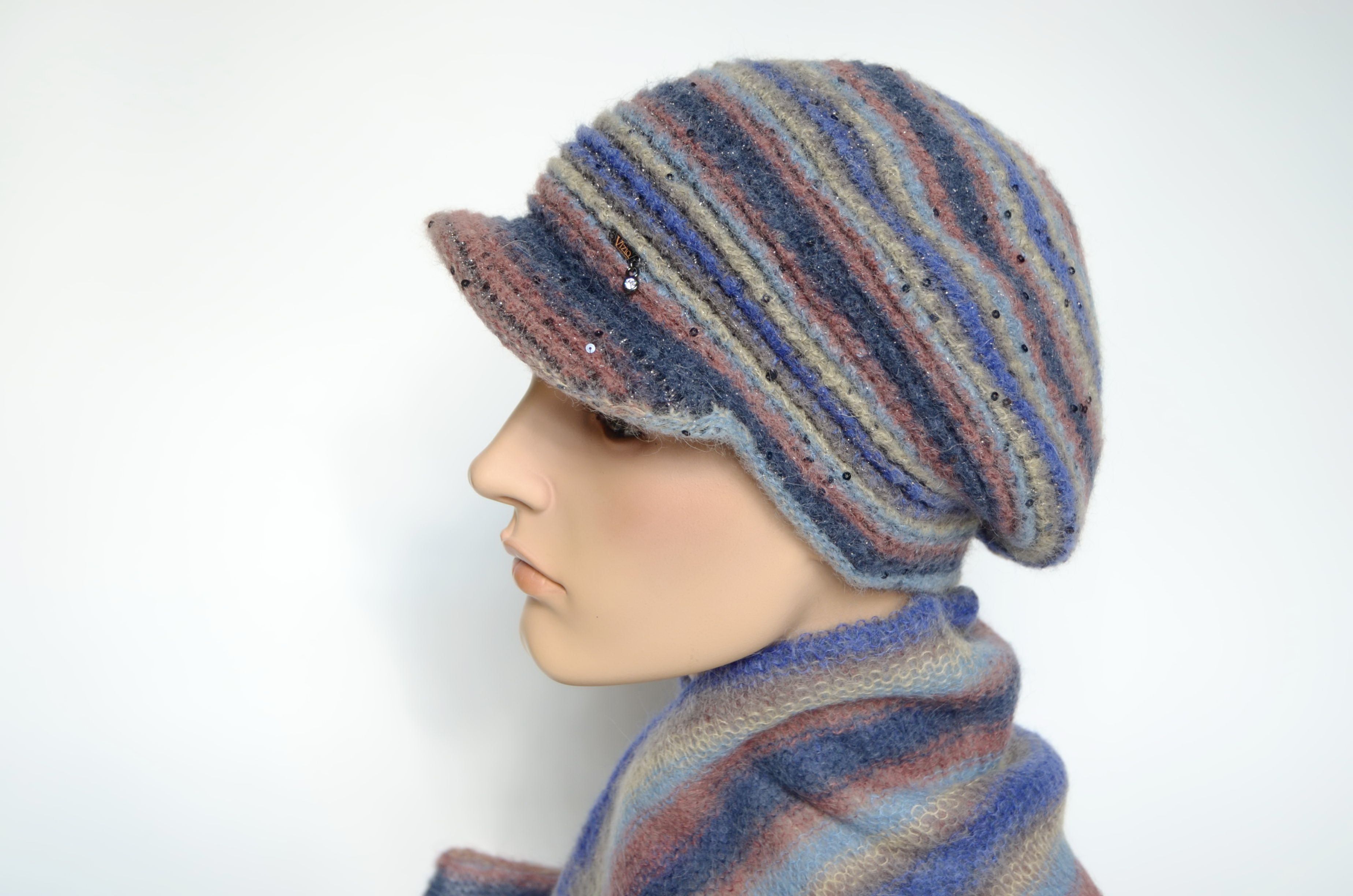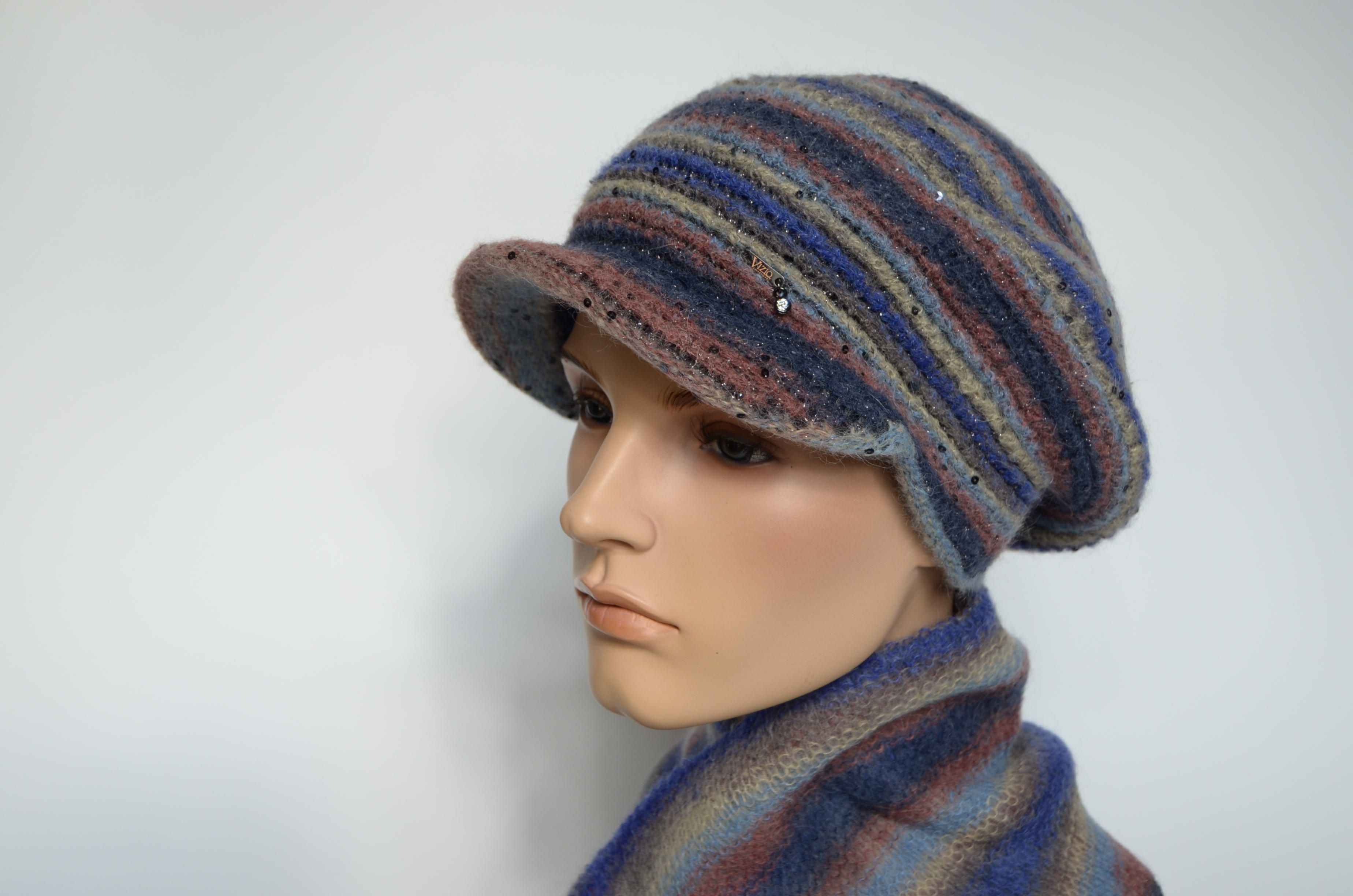 Приобрести синюю разноцветную кепку вязаную зима 2022 - 2023 итальянского производителя модных женских кепок и беретов с козырьком Vizio Collezione в интернет магазине женских головных уборов с доставкой по Москве и России