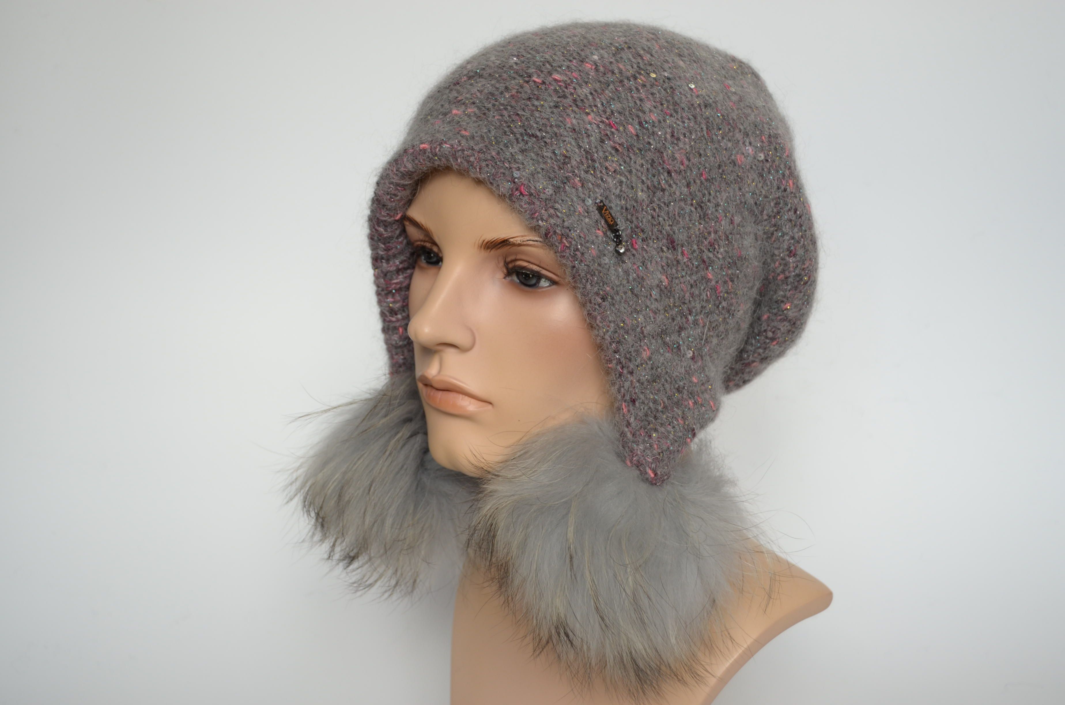 Купить вязаную серо - розовую шапку ушанку с помпонами зима 2022 - 2023 Визио Италия Вы можете в интернет магазине вязаных головных уборов для женщин