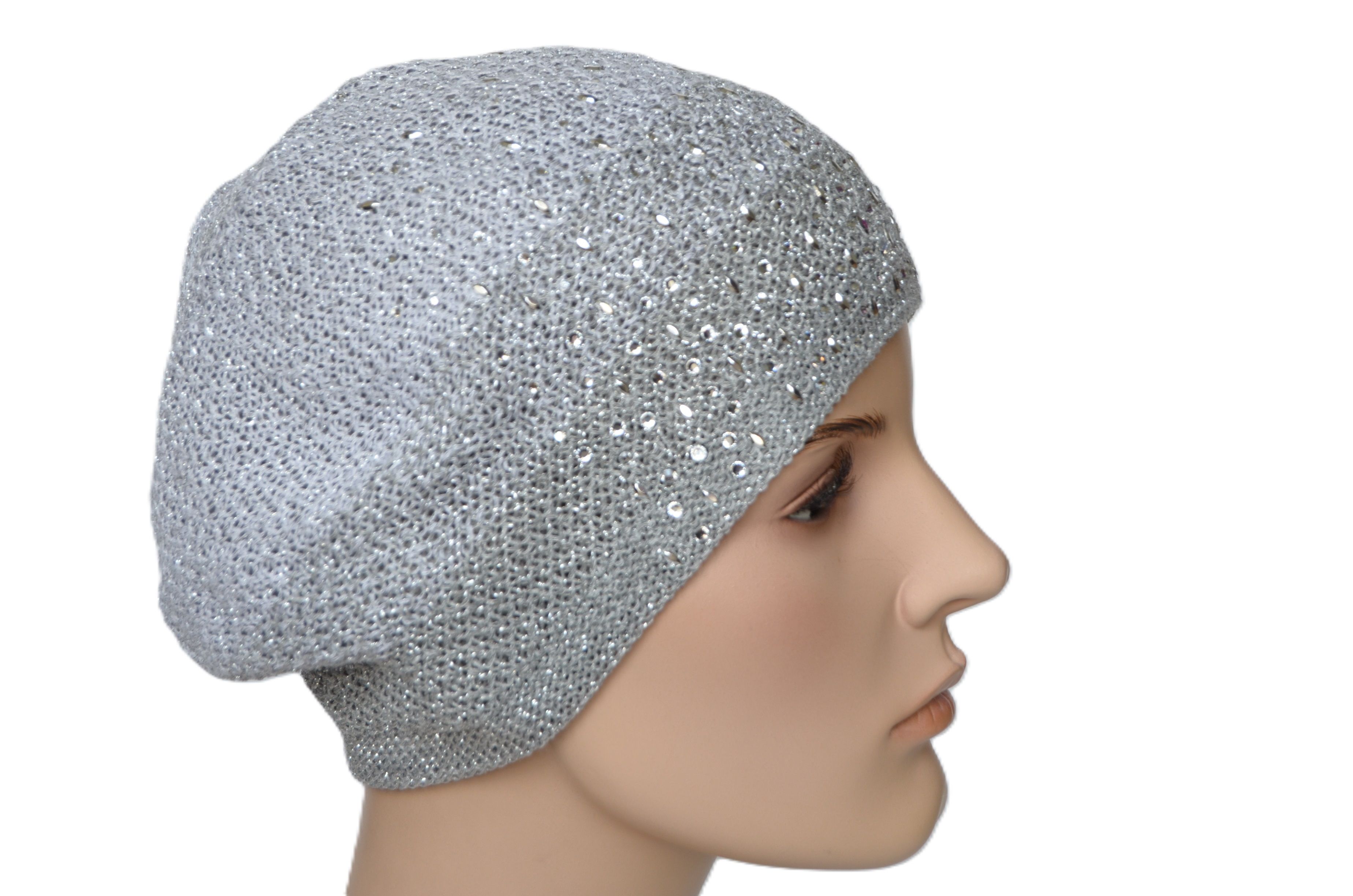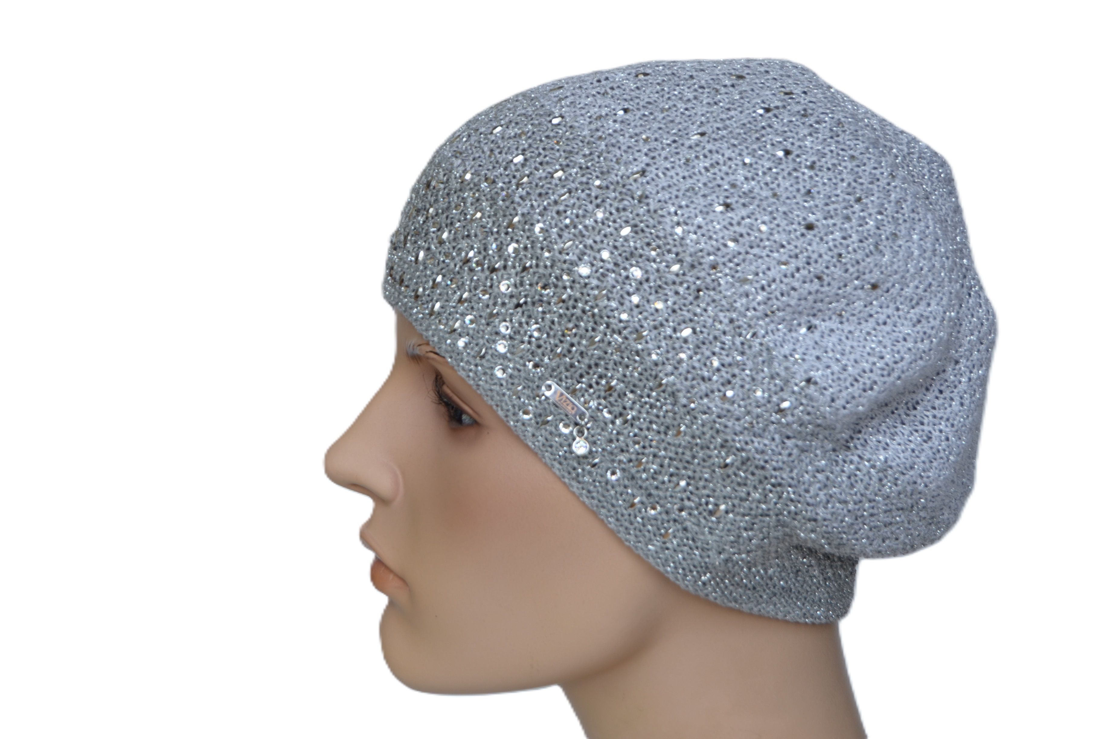 Серебрристо серый демисезонный берет со стразами женский вязаный Vizio Италия 1203 в интернет магазине итальянских головных уборов с доставкой по Москве и России