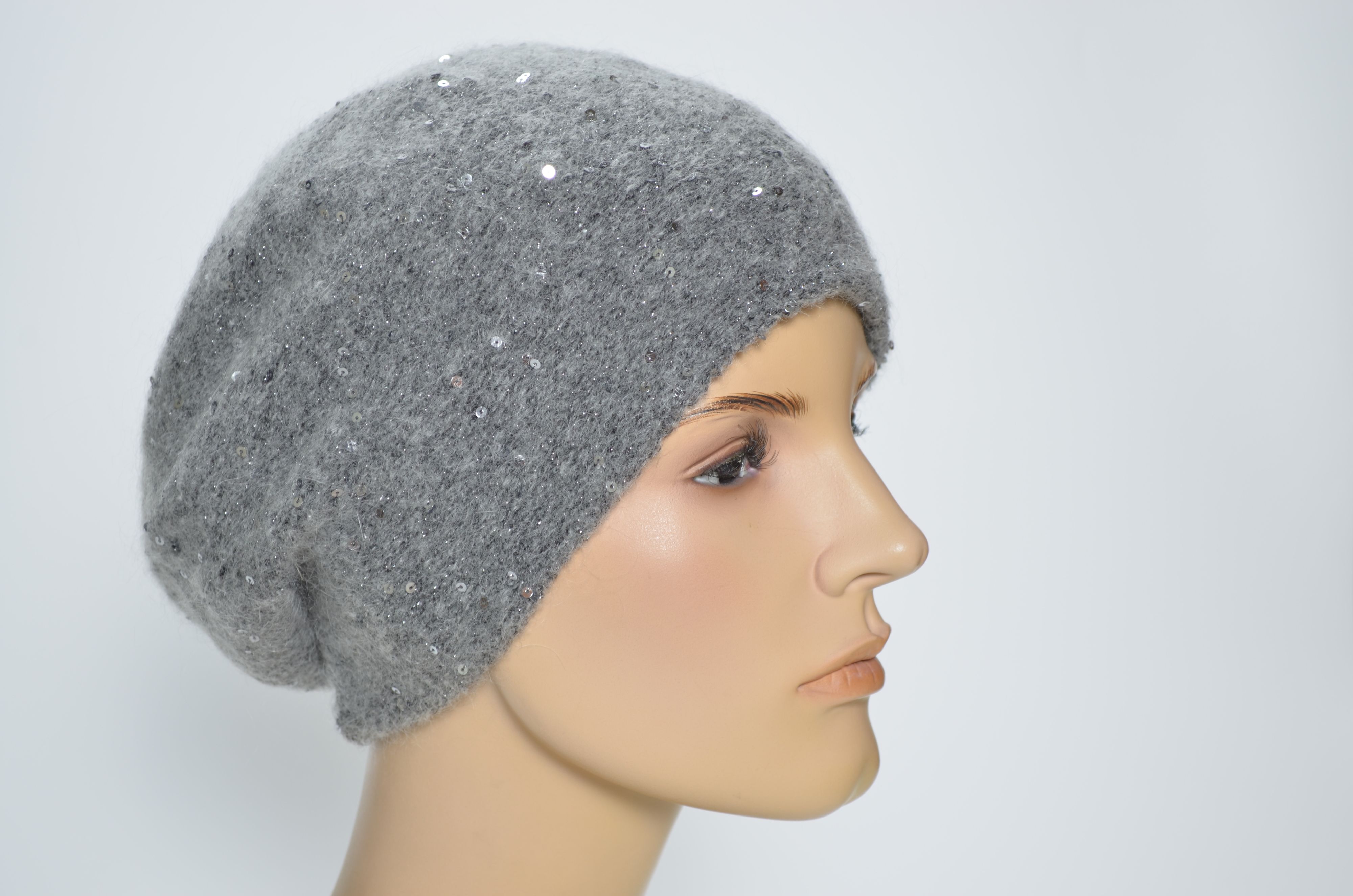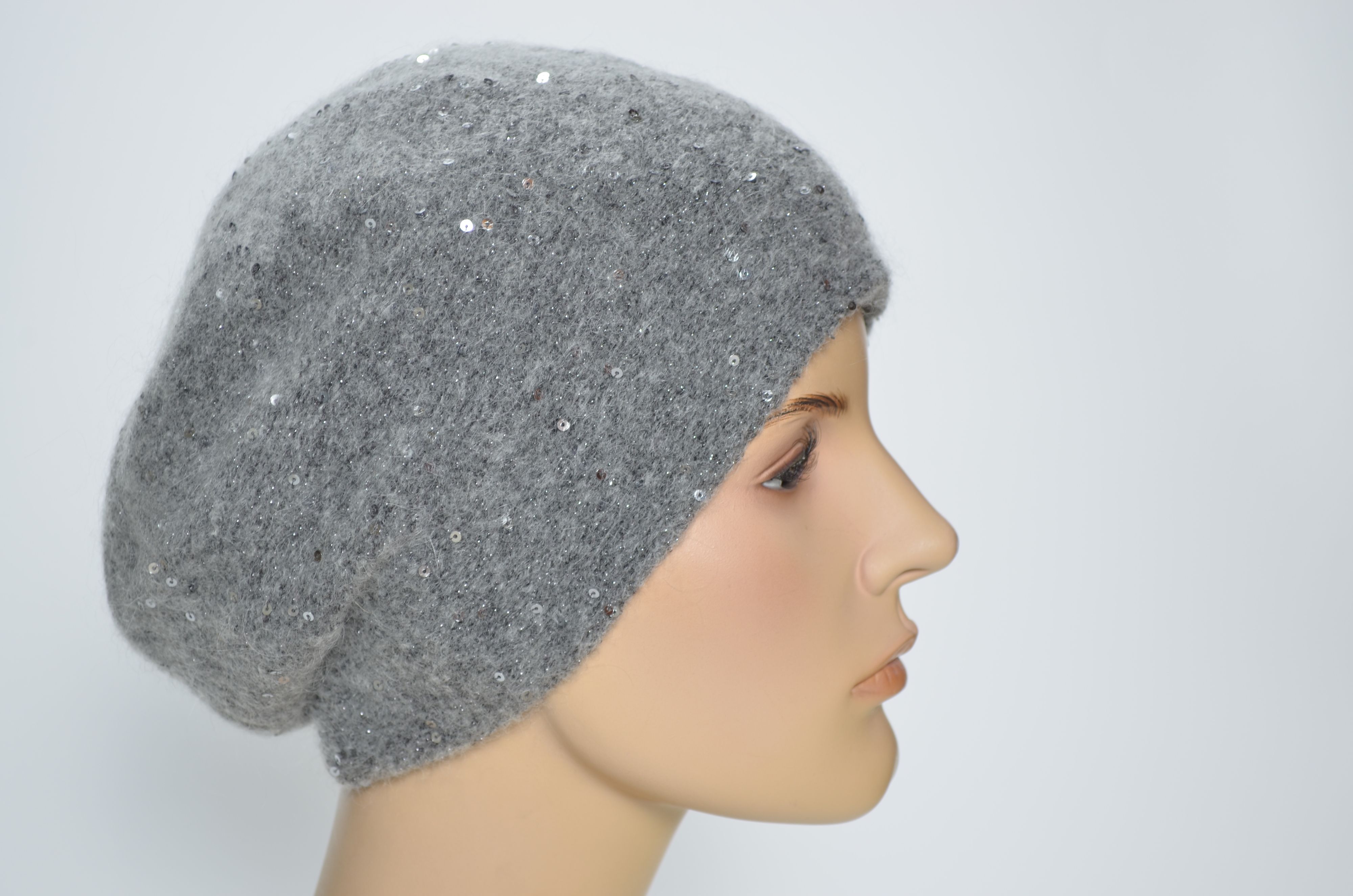 Серый зимний берет с пайетками вязаный из мохера с вязаным подкладом