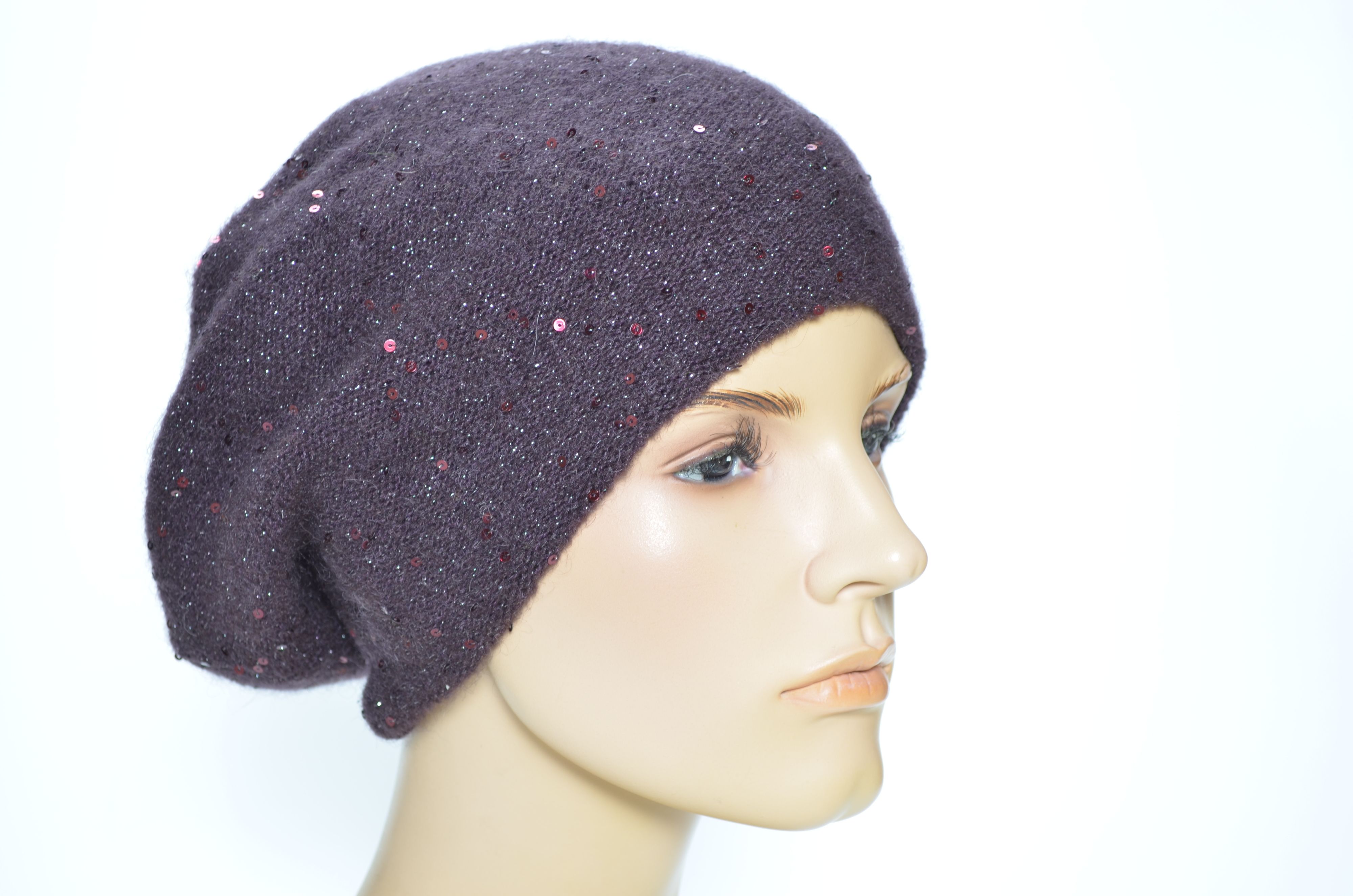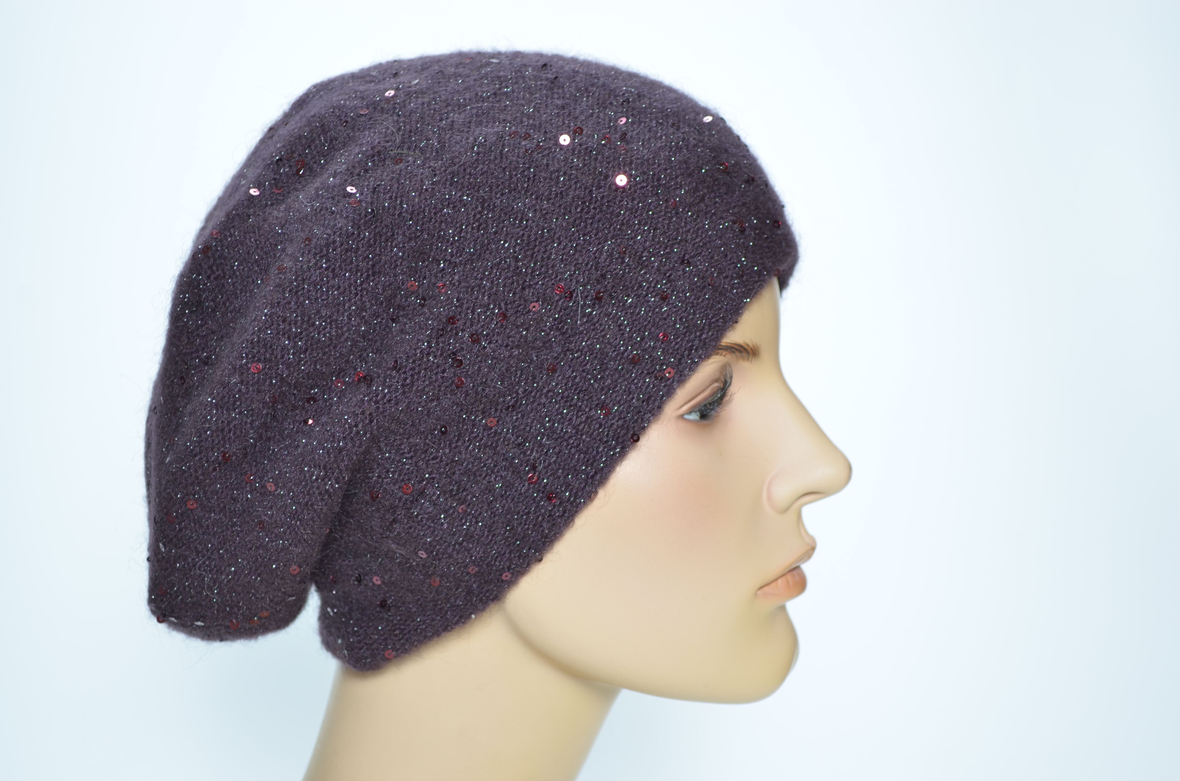 Сливовый зимний берет с пайетками вязаный из мохера с вязаным подкладом