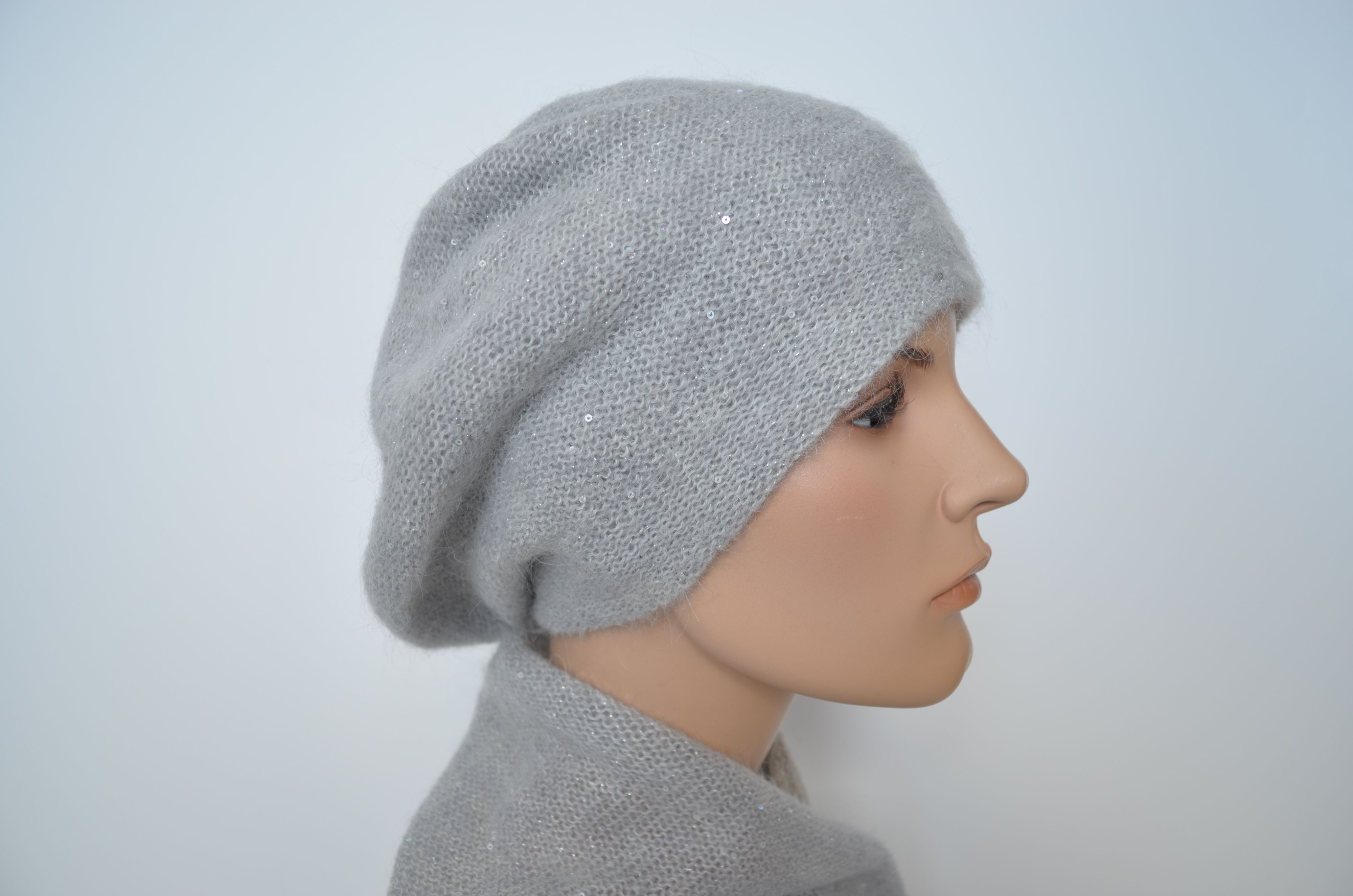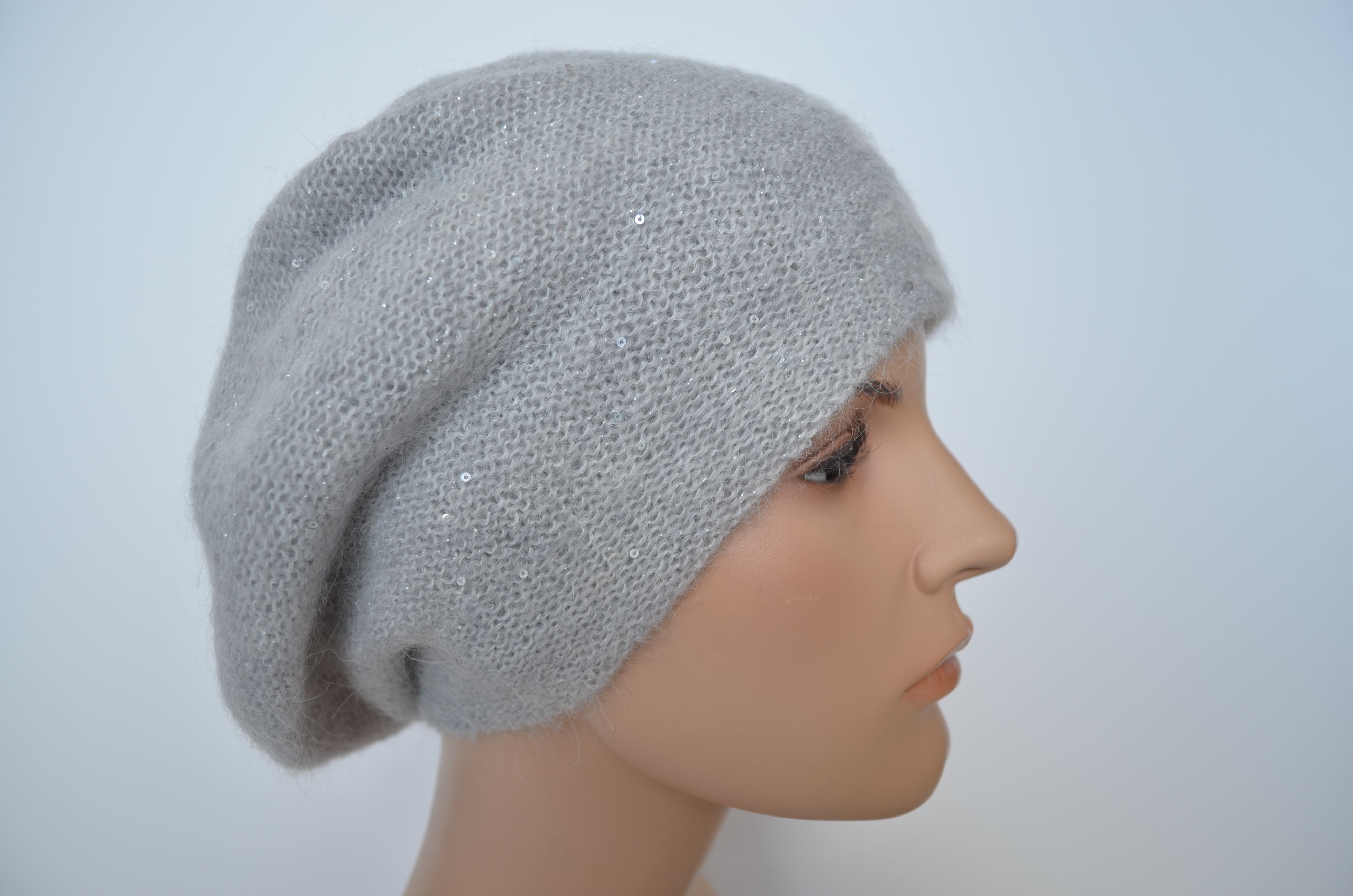 Женский вязаный разноцветный берет с вязаным подкладом серый