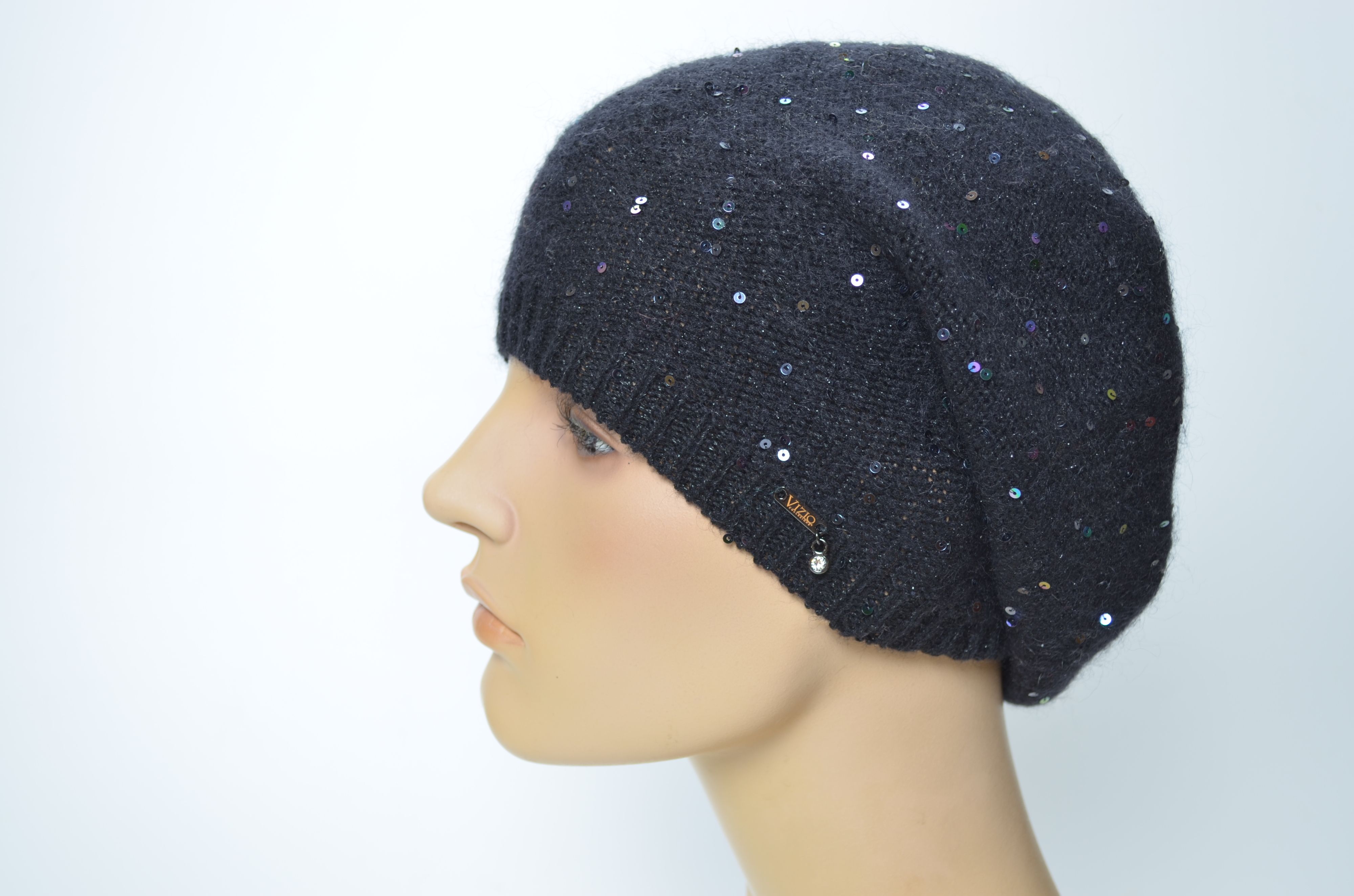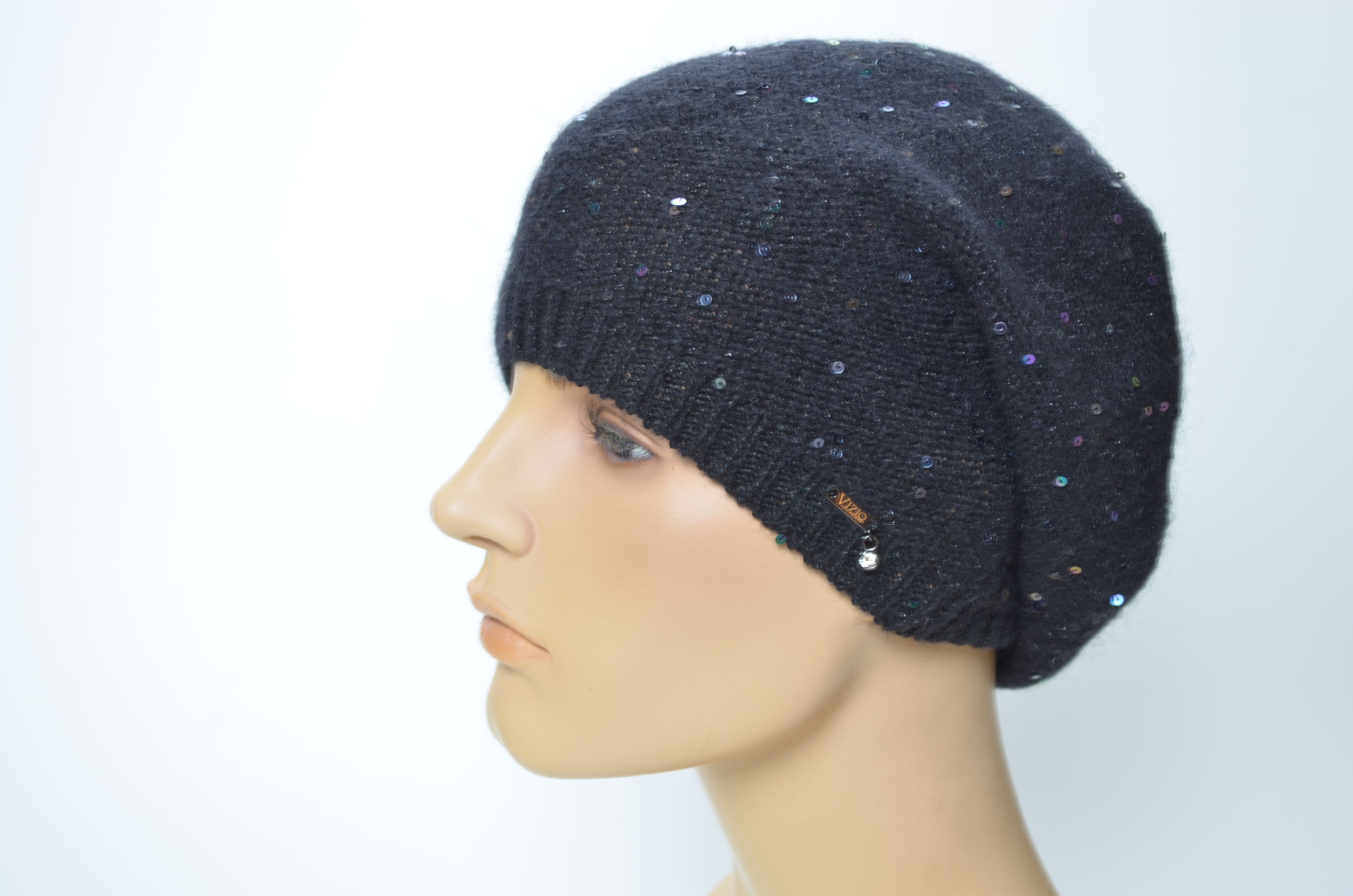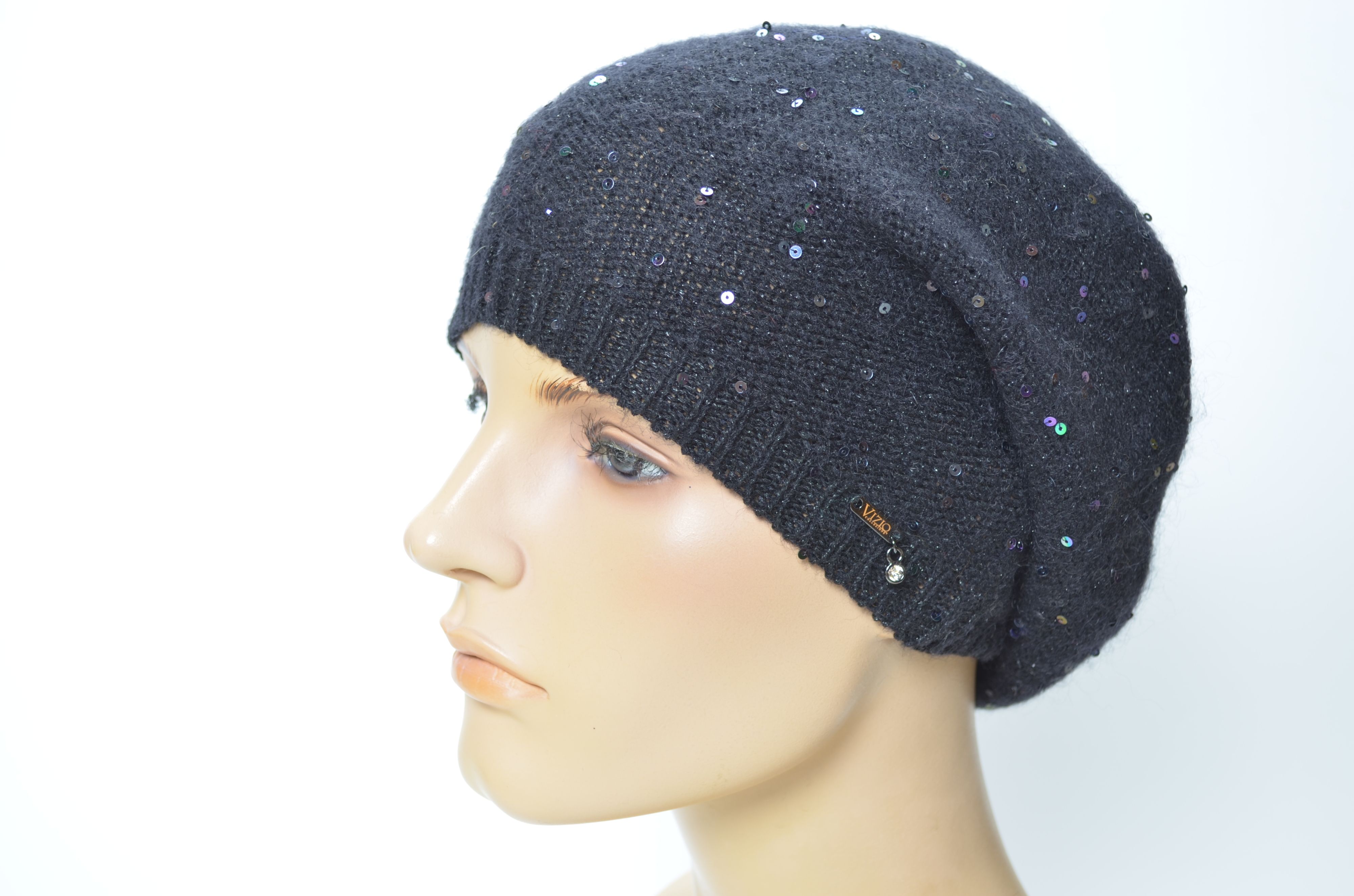 Черный одинарный вязаный берет на резинке Vizio 5628 BO с пайетками коллекция итальянских тонких беретов и шапок Визио зима весна осень